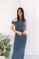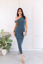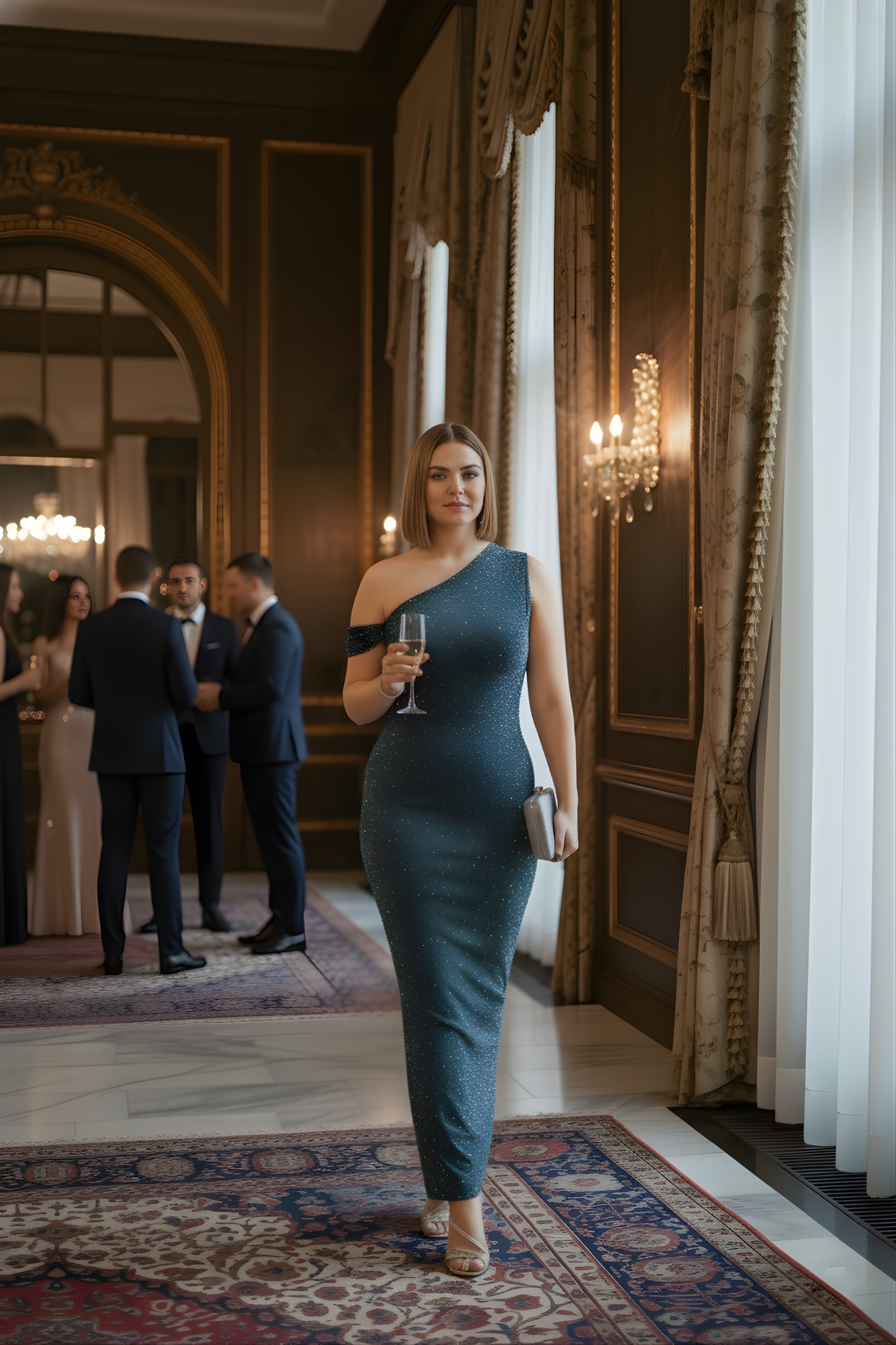 Vestido largo ceñido al cuerpo de corte asimétrico con caída fluida. El escote asimétrico revela la delicadeza del hombro con sutileza, mientras su silueta ceñida abraza la figura con elegancia y feminidad.