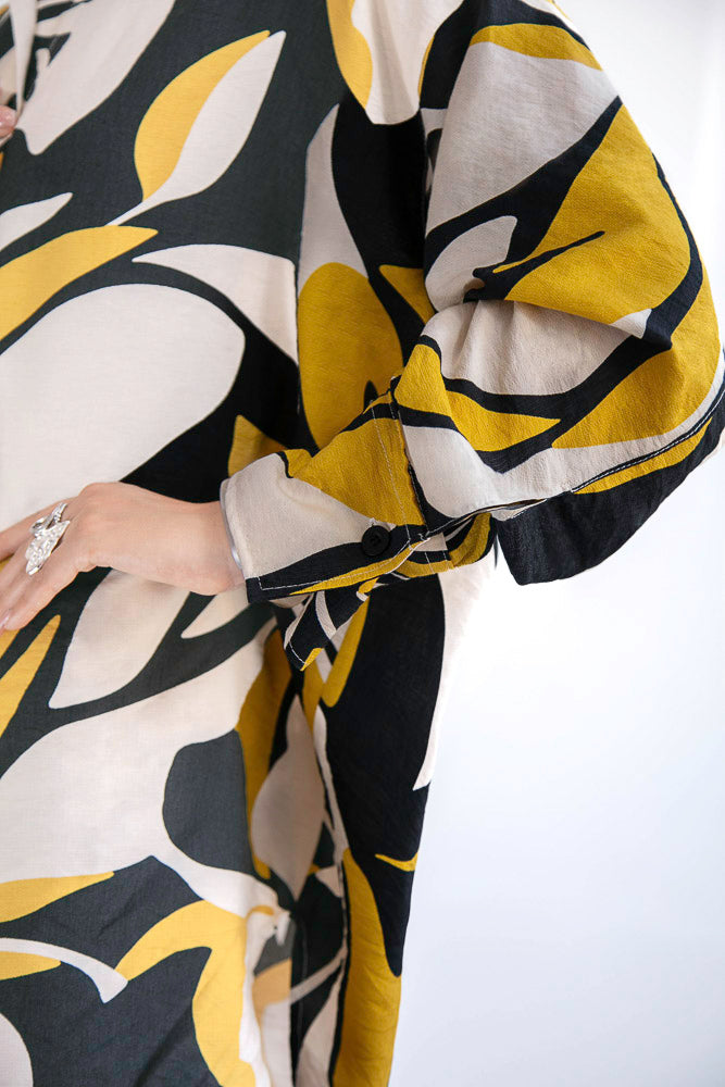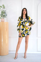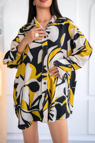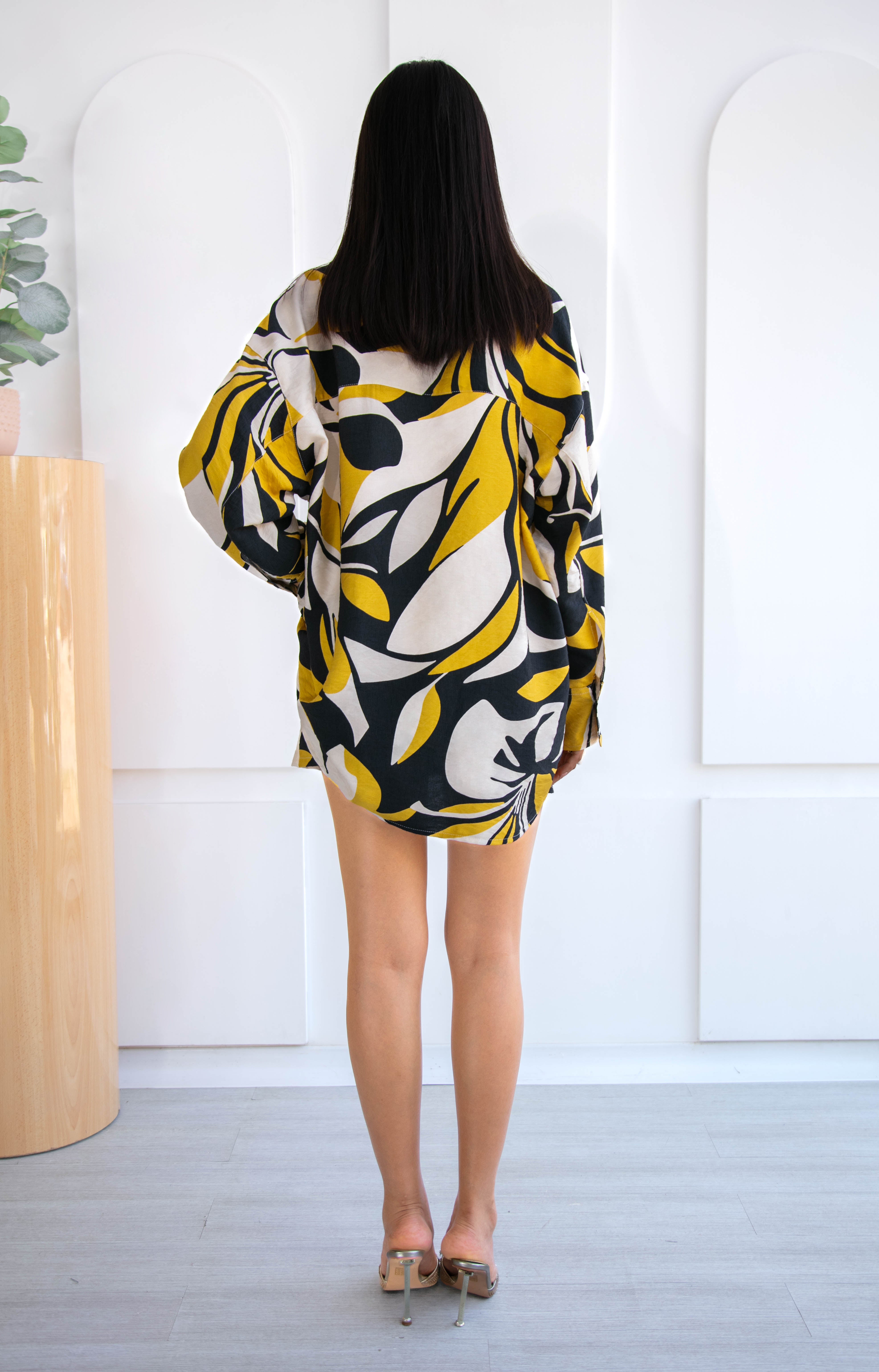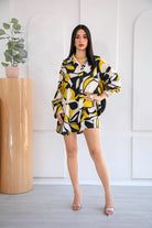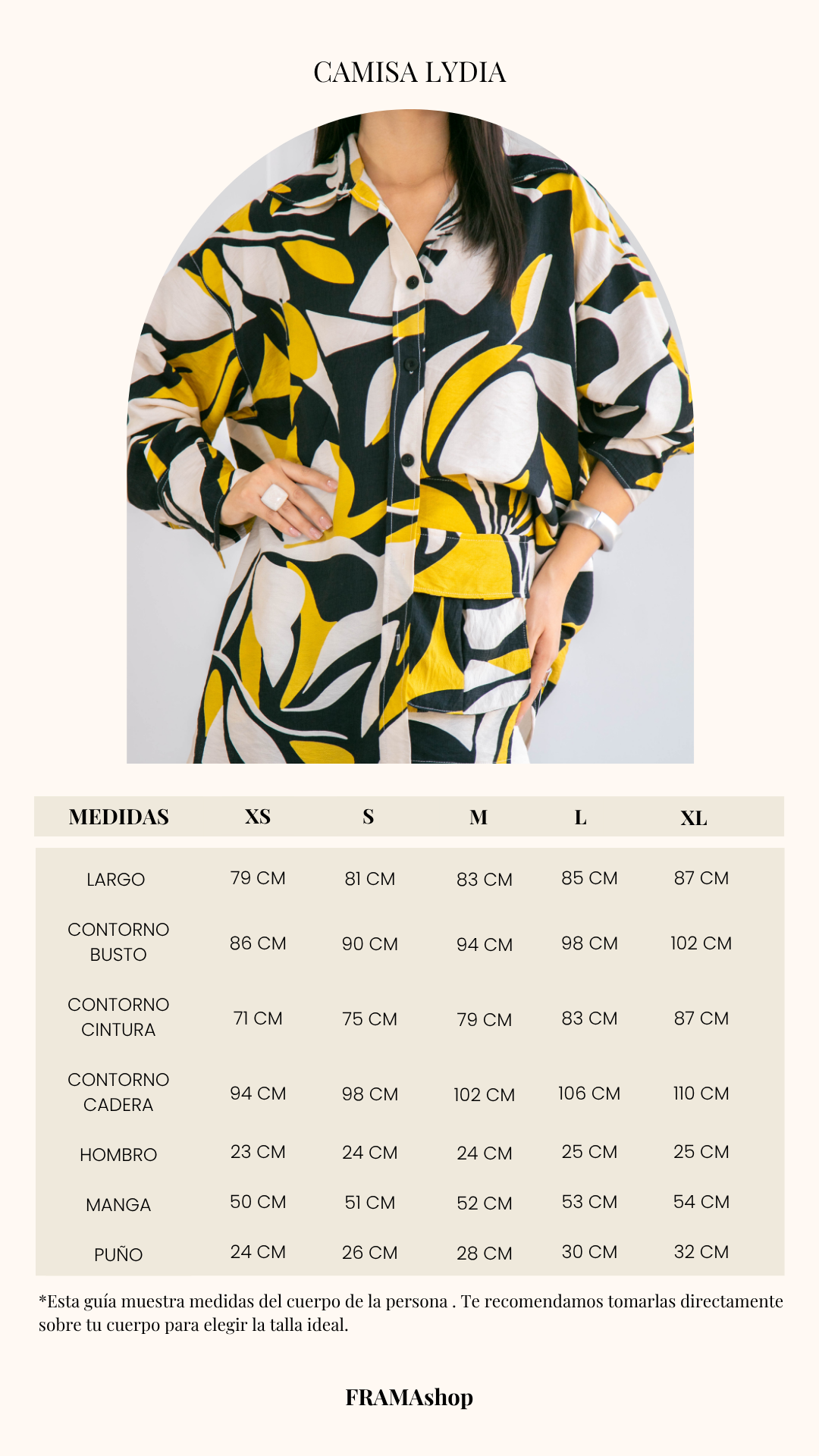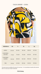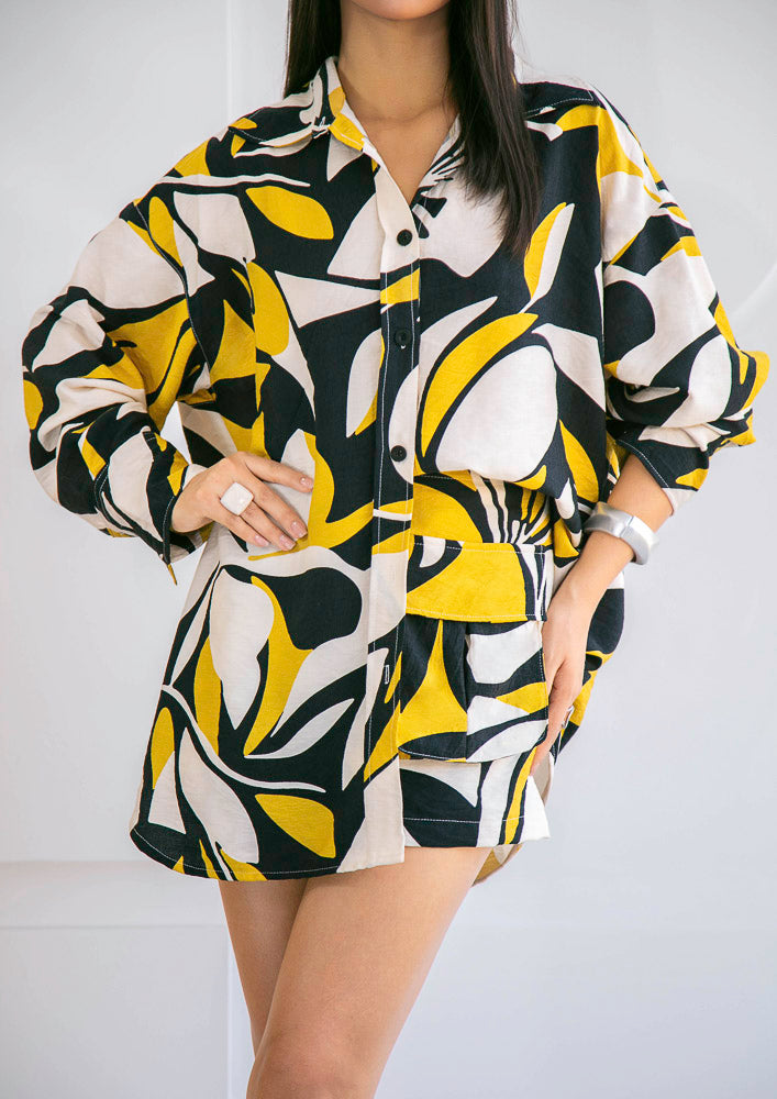 Estampado abstracto combina tonos vibrantes de amarillo con contrastes en negro y toques neutros, creando un equilibrio perfecto de sofisticación. Set de 2 piezas. Camisa fluida de manga larga y una falda short de tiro alto con detalle de bolsillo delantero. Su paleta de color lo hace ideal para climas cálidos, y su diseño versátil te permite llevarlo junto o por separado, multiplicando tus opciones de outfit.