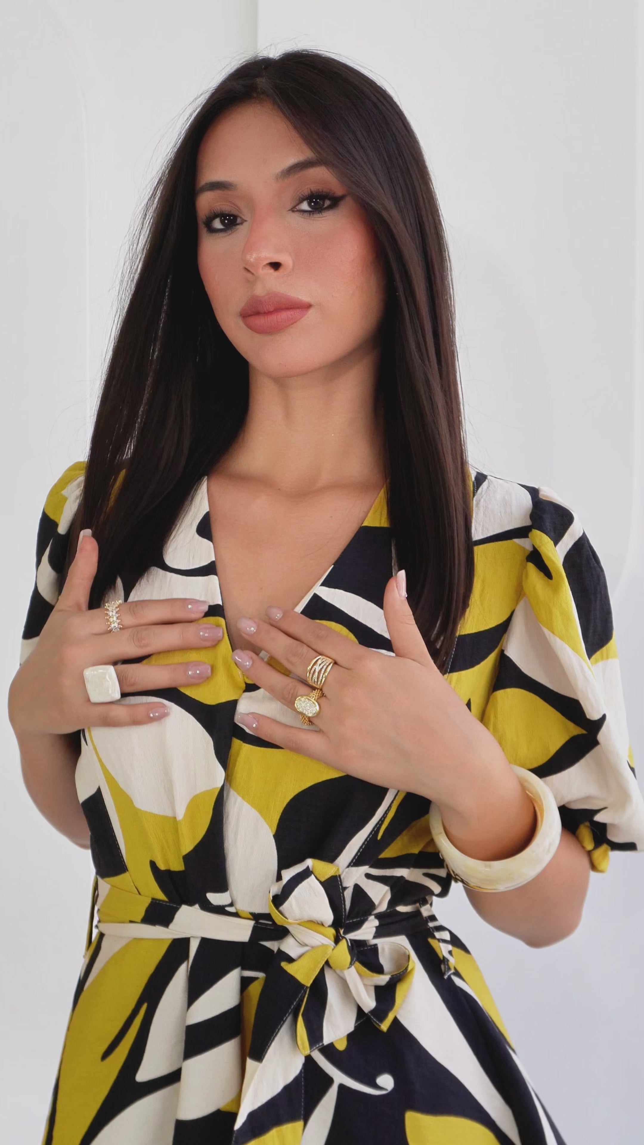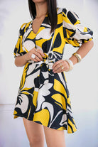 El vestido Cassiana es una pieza femenina que destaca por su diseño delicado y acabado elegante. Su base en tono abstracto combina tonos vibrantes de amarillo con contrastes en negro y toques neutros, perfecto para lucir en cualquier temporada.