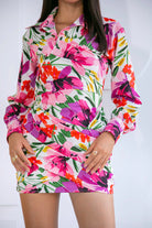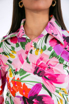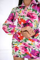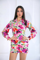 Vestido Ecléctico su base floral vibrante, lleno de tonos frescos lo convierte en una pieza protagonista, perfecto para lucir en cualquier temporada, ideal para quienes aman los looks con personalidad.