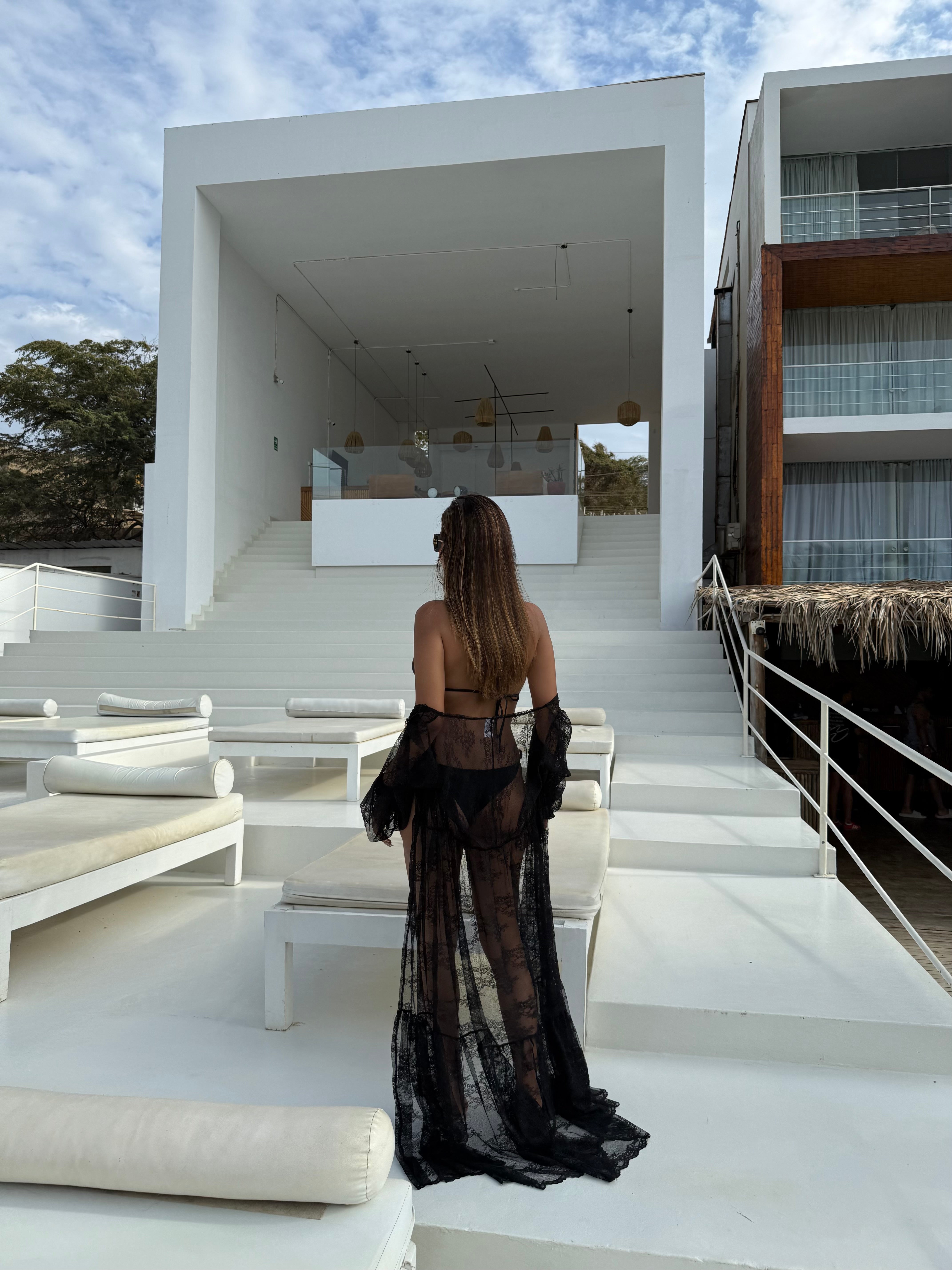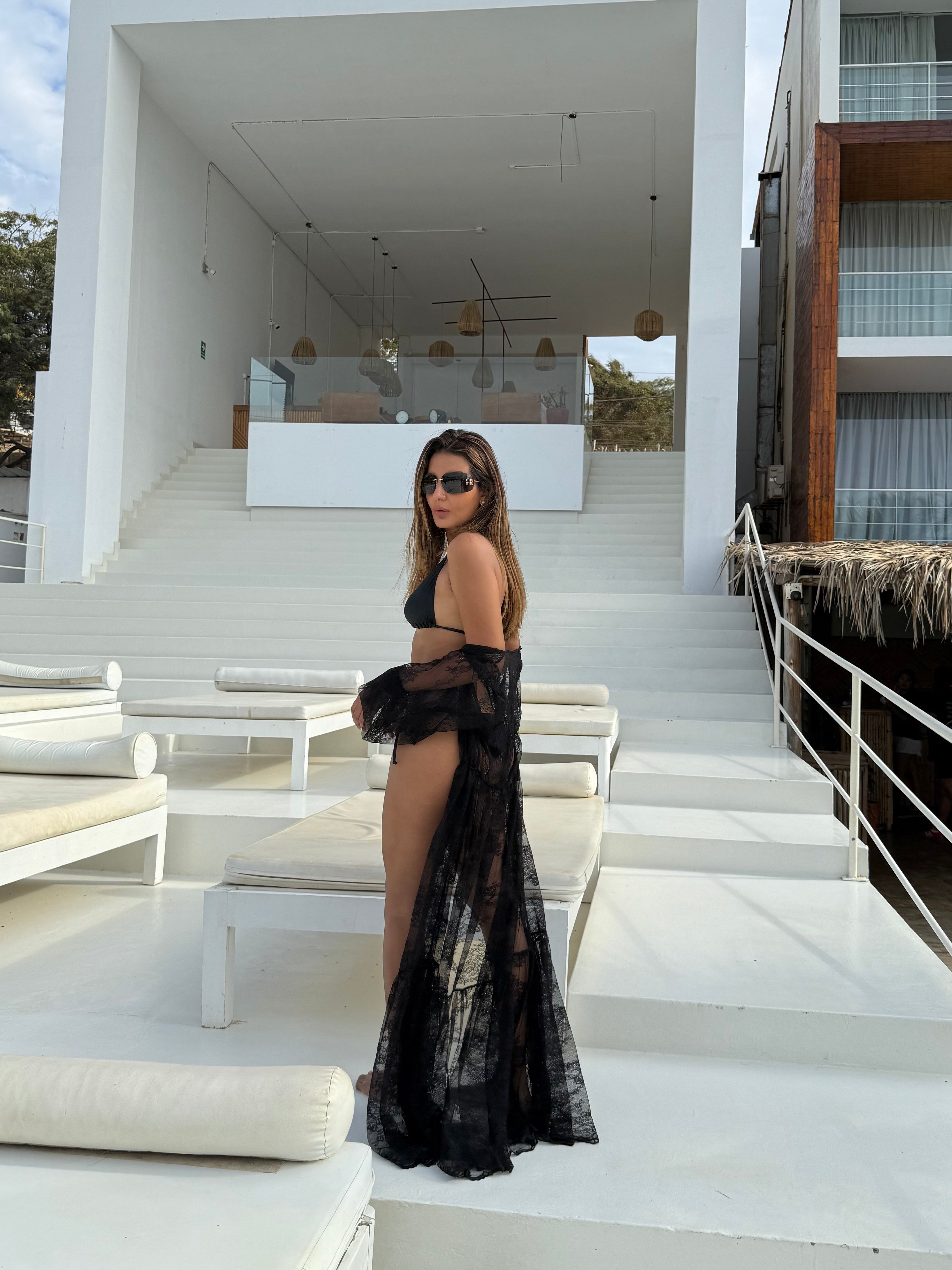 Silueta fluida, caída ligera, mangas amplias y el largo maxi aportan dramatismo y un aire effortless. Es la pieza ideal para elevar cualquier look de playa o piscina, perfecta para pasar del sol a un beach club o una tarde resort con total estilo.