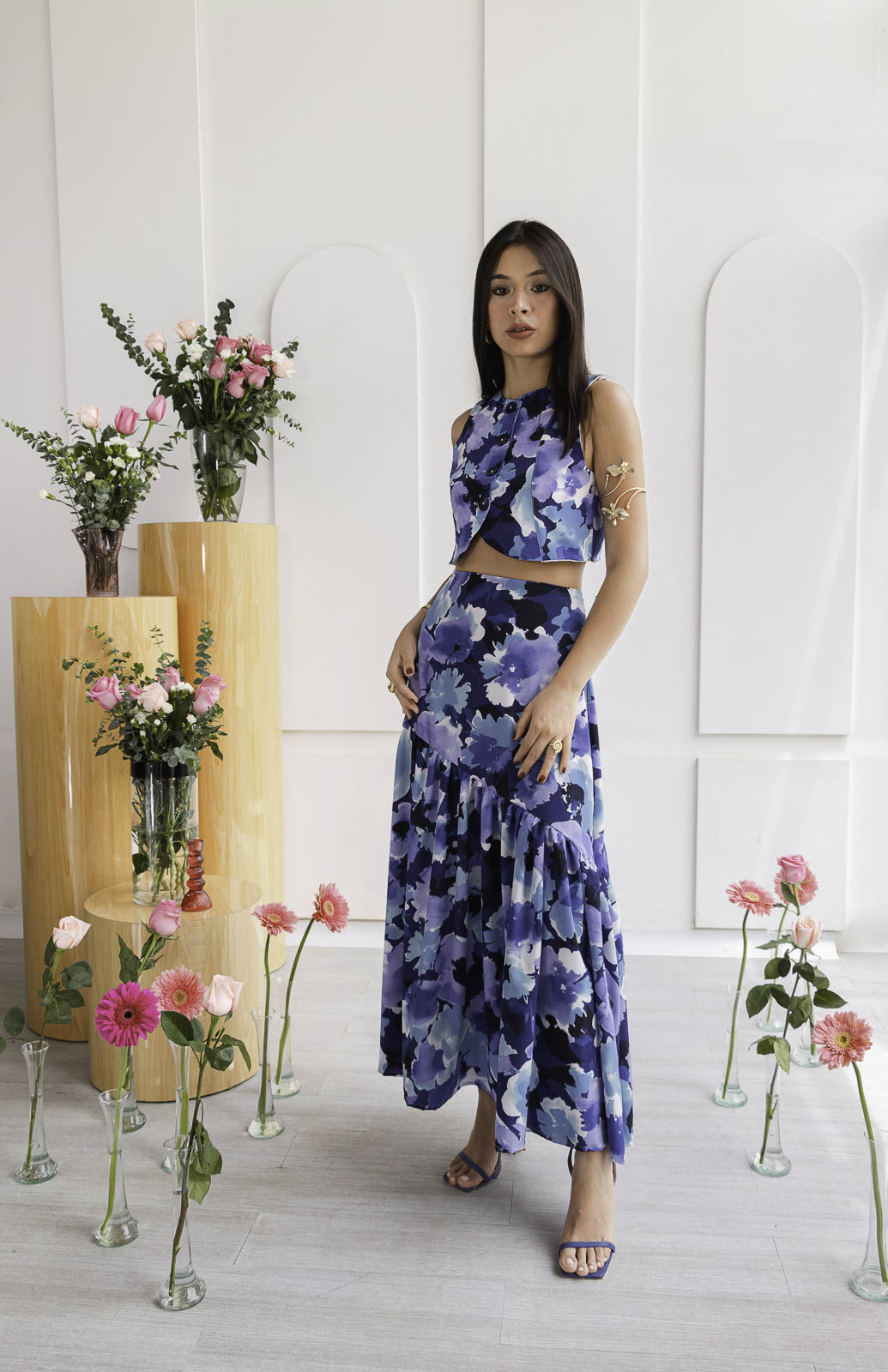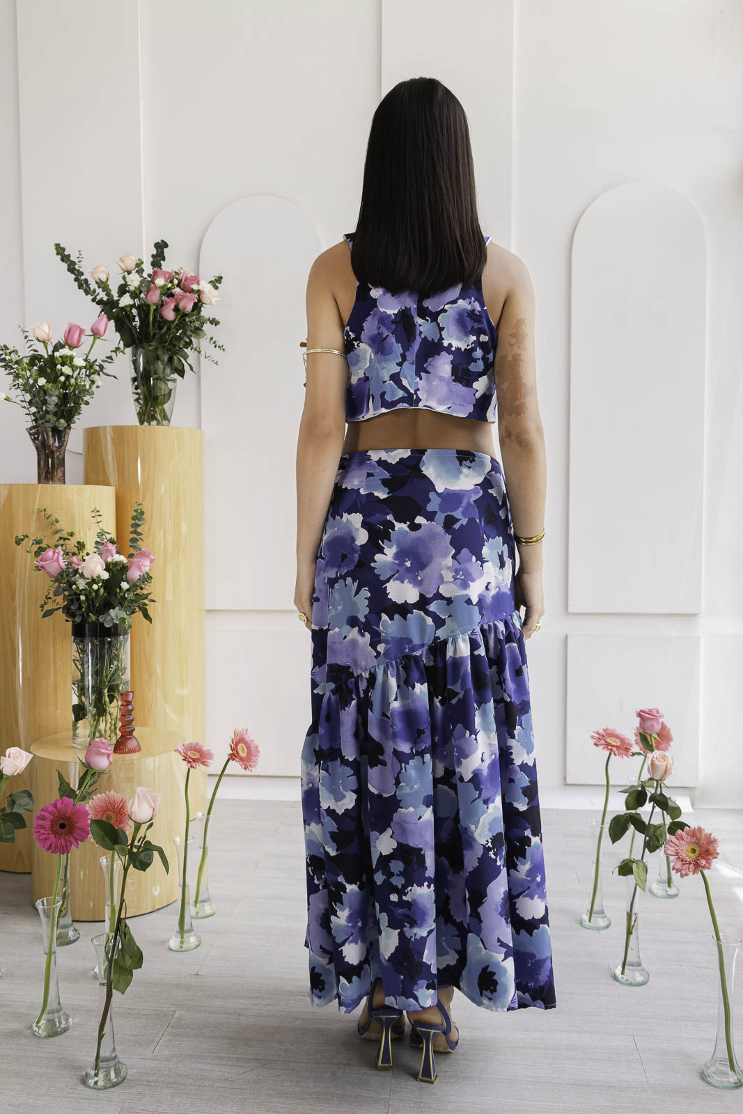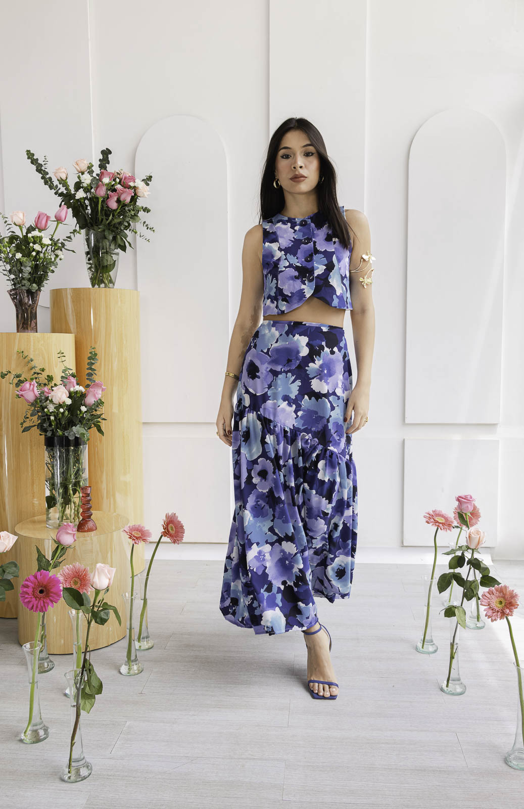 Un conjunto que enamora a primera vista. Set 2 de piezas, en tonos azules con un estampado floral creando un contraste sofisticado y elegante. El top sin mangas + falda larga con detalle de pliegues de caída amplia y movimiento.