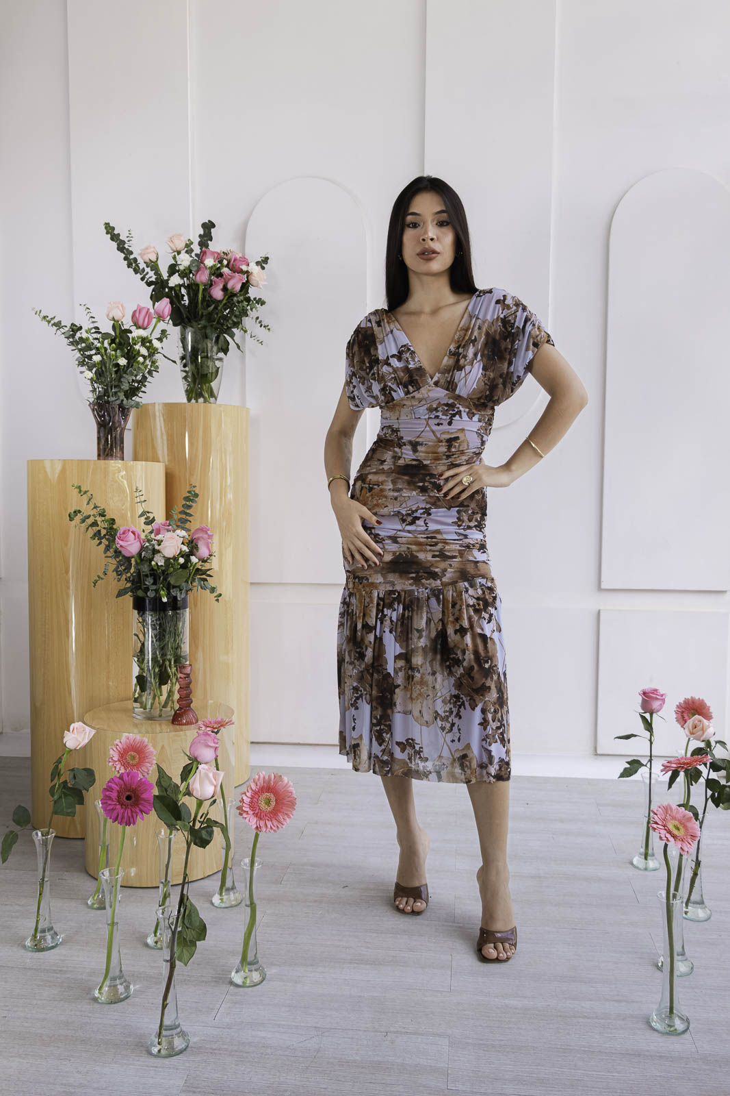 El diseño presenta un escote en V cruzado que realza el busto con delicadeza, acompañado de mangas cortas con volumen que aportan romanticismo y ligereza. Su silueta entallada con drapeados estratégicos estiliza la figura, mientras que la falda de caída fluida con ligero vuelo añade movimiento.
