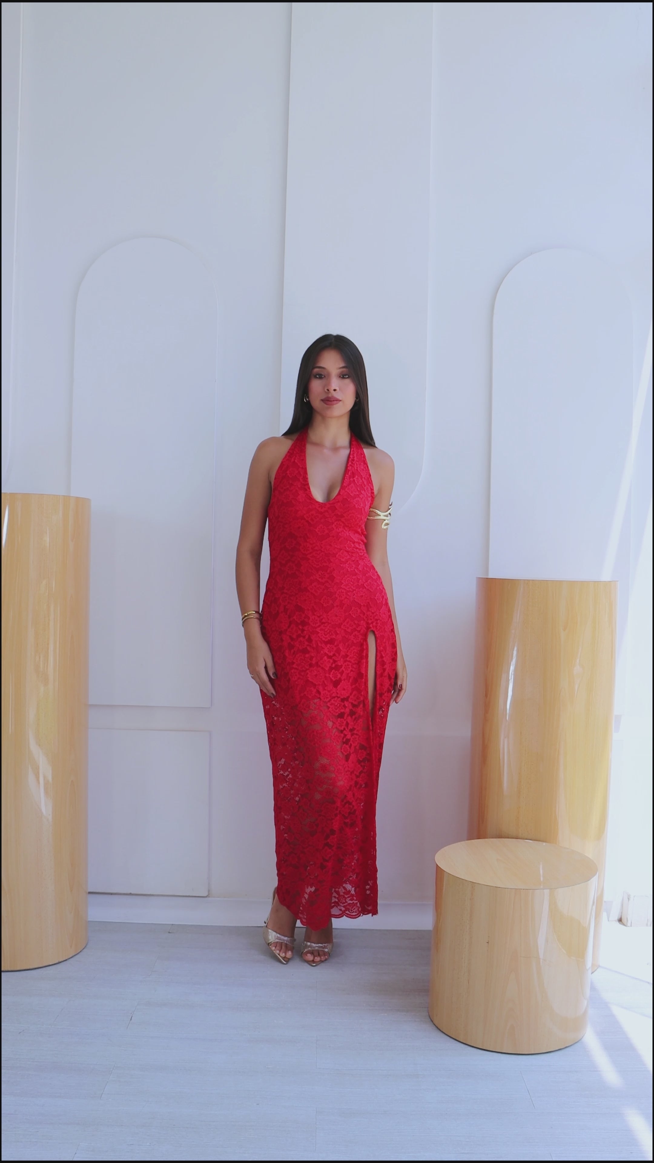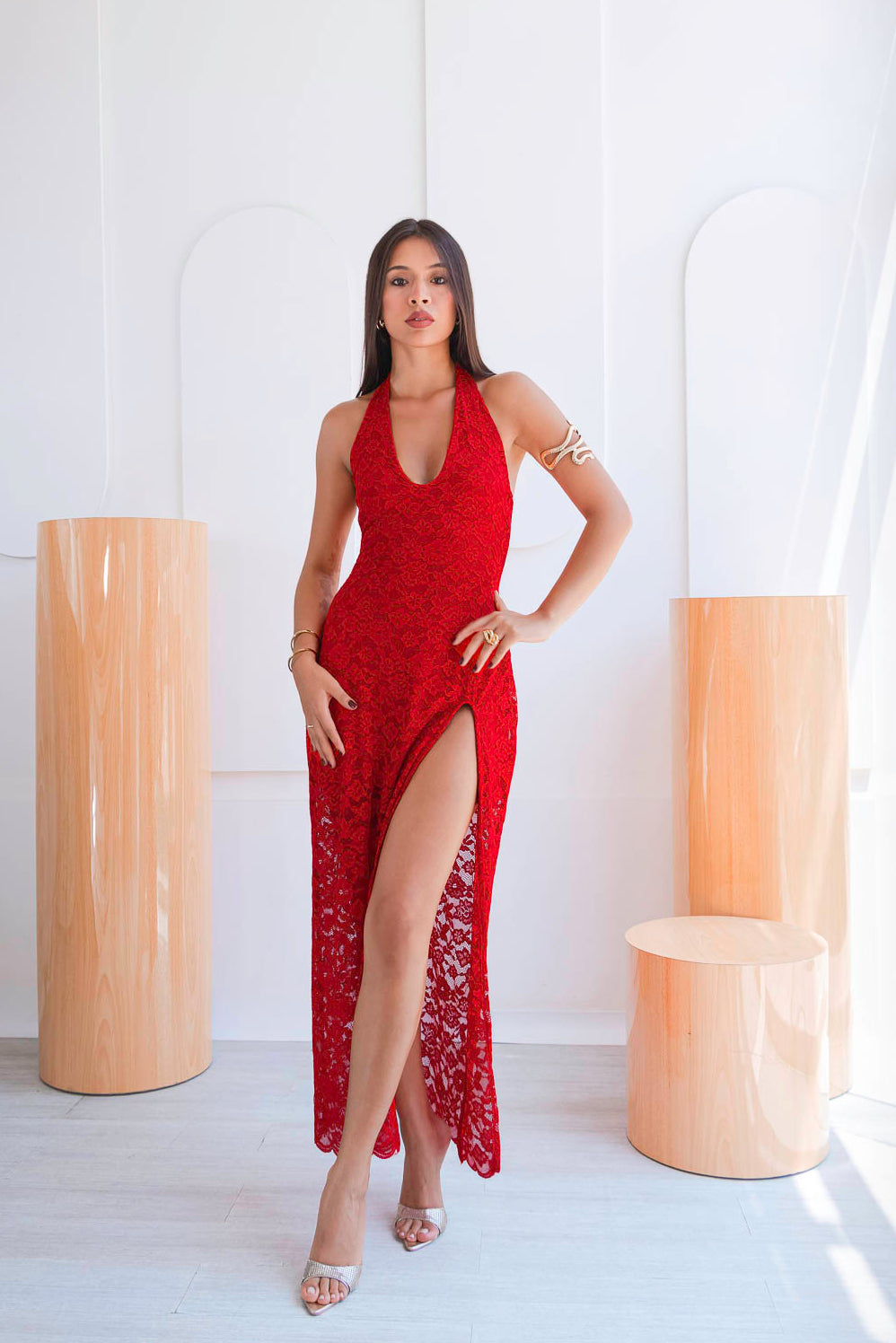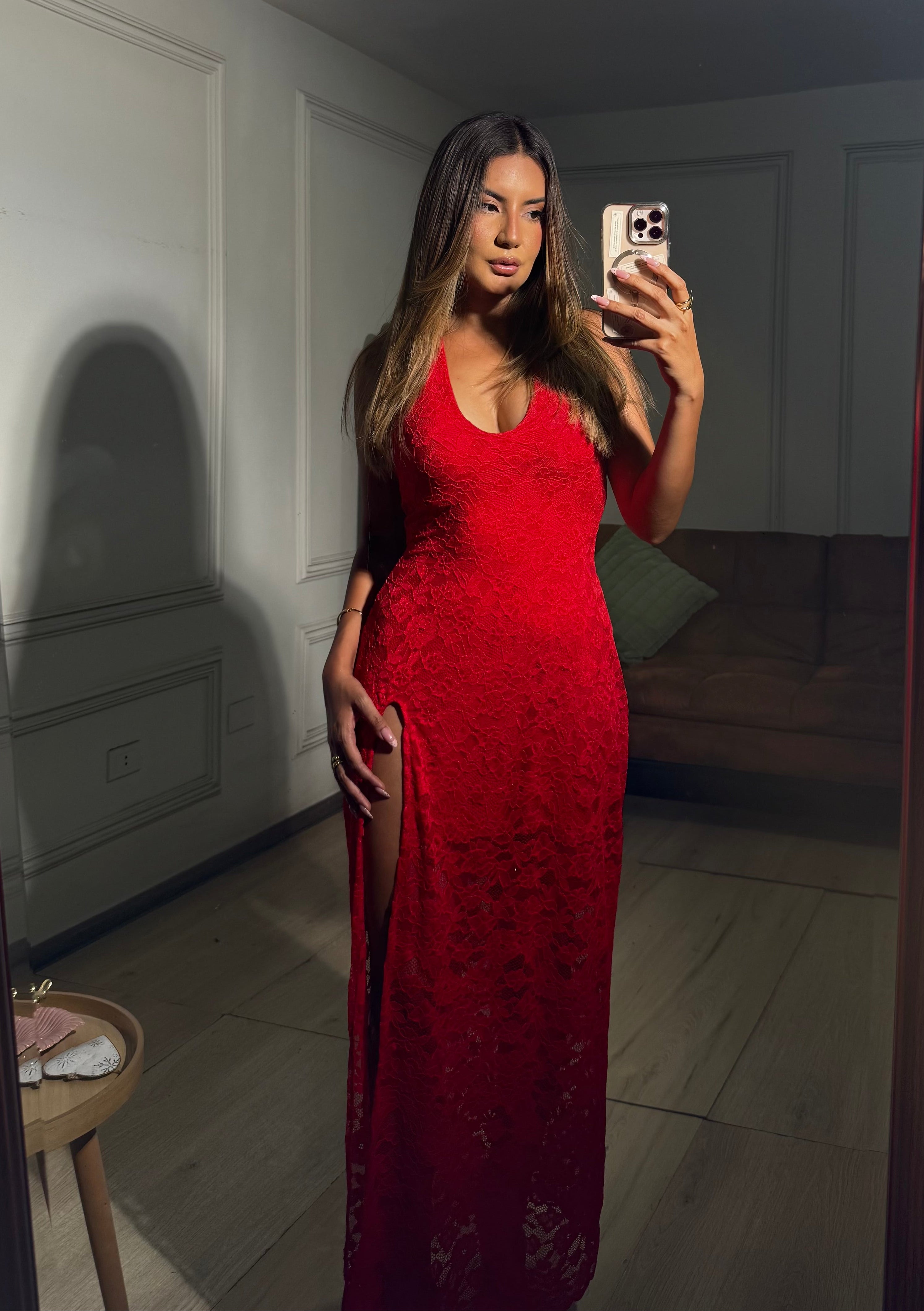 Confeccionado en encaje, este diseño destaca por sus finos detalles que aportan textura y romanticismo a la prenda. El escote halter estiliza la parte superior del cuerpo, mientras que la silueta fluida y la abertura lateral añaden movimiento y un toque sutilmente sensual, logrando un equilibrio perfecto entre delicadeza y sofisticación.