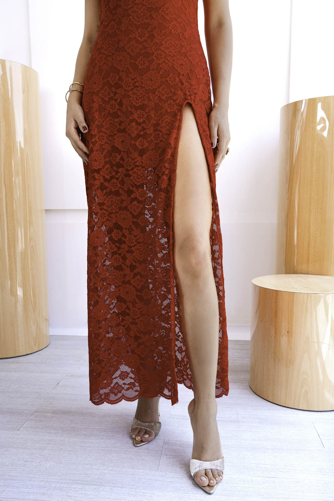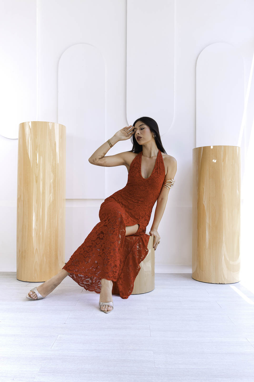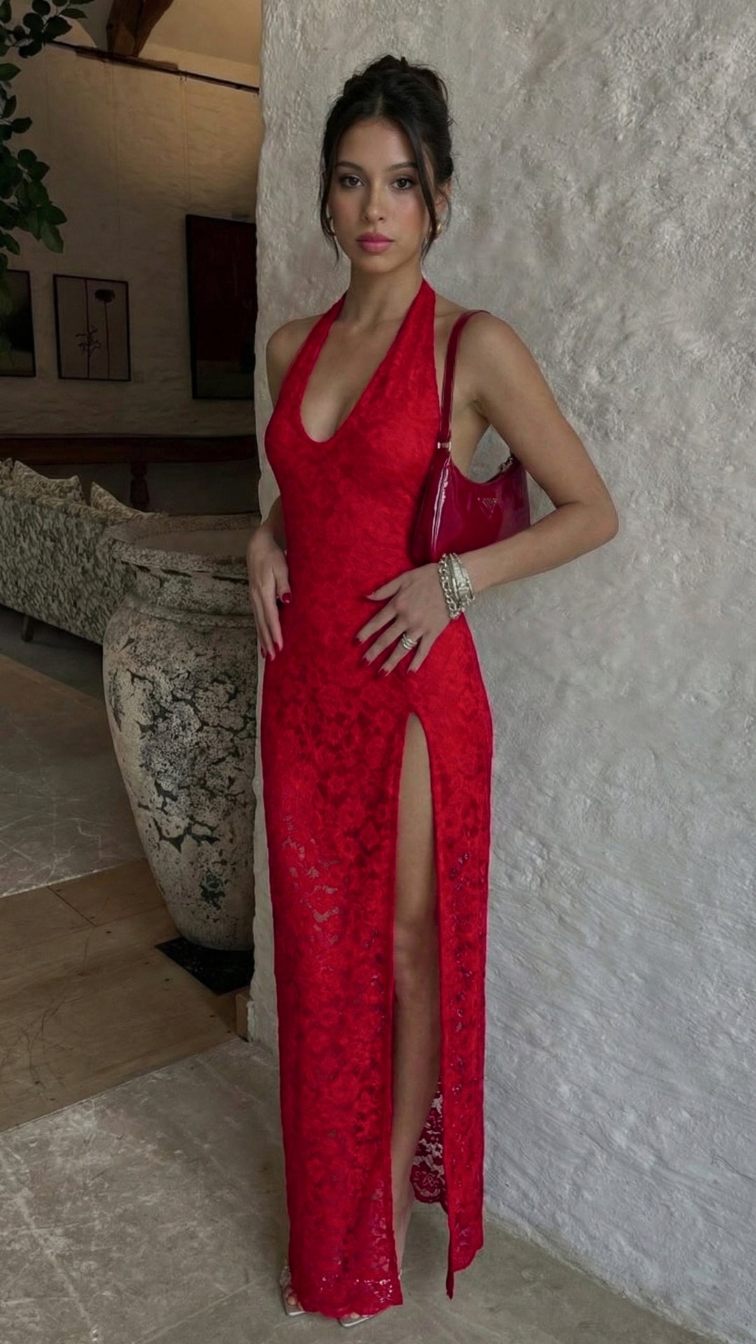 Confeccionado en encaje, este diseño destaca por sus finos detalles que aportan textura y romanticismo a la prenda. El escote halter estiliza la parte superior del cuerpo, mientras que la silueta fluida y la abertura lateral añaden movimiento y un toque sutilmente sensual, logrando un equilibrio perfecto entre delicadeza y sofisticación.