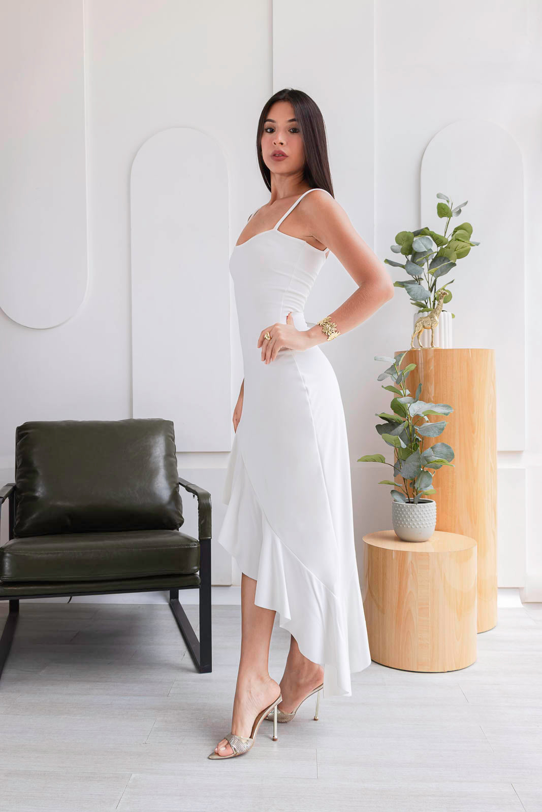 Su silueta ceñida en la parte superior realza la figura de forma natural, y el detalle de falda con caída asimétrica y movimiento fluido. Los tirantes finos y el material acompañan el cuerpo con elegancia, haciendo de este vestido una opción perfecta para llevar en eventos de verano, celebraciones de día, cenas frente al mar o ocasiones especiales, combinándolo con flats, tacones o accesorios delicados según la ocasión.
