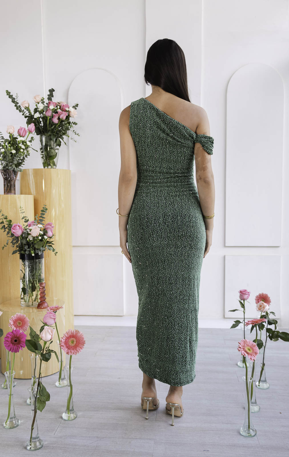 Vestido largo ceñido al cuerpo de corte asimétrico con caída fluida. El escote asimétrico revela la delicadeza del hombro con sutileza, mientras su silueta ceñida abraza la figura con elegancia y feminidad.