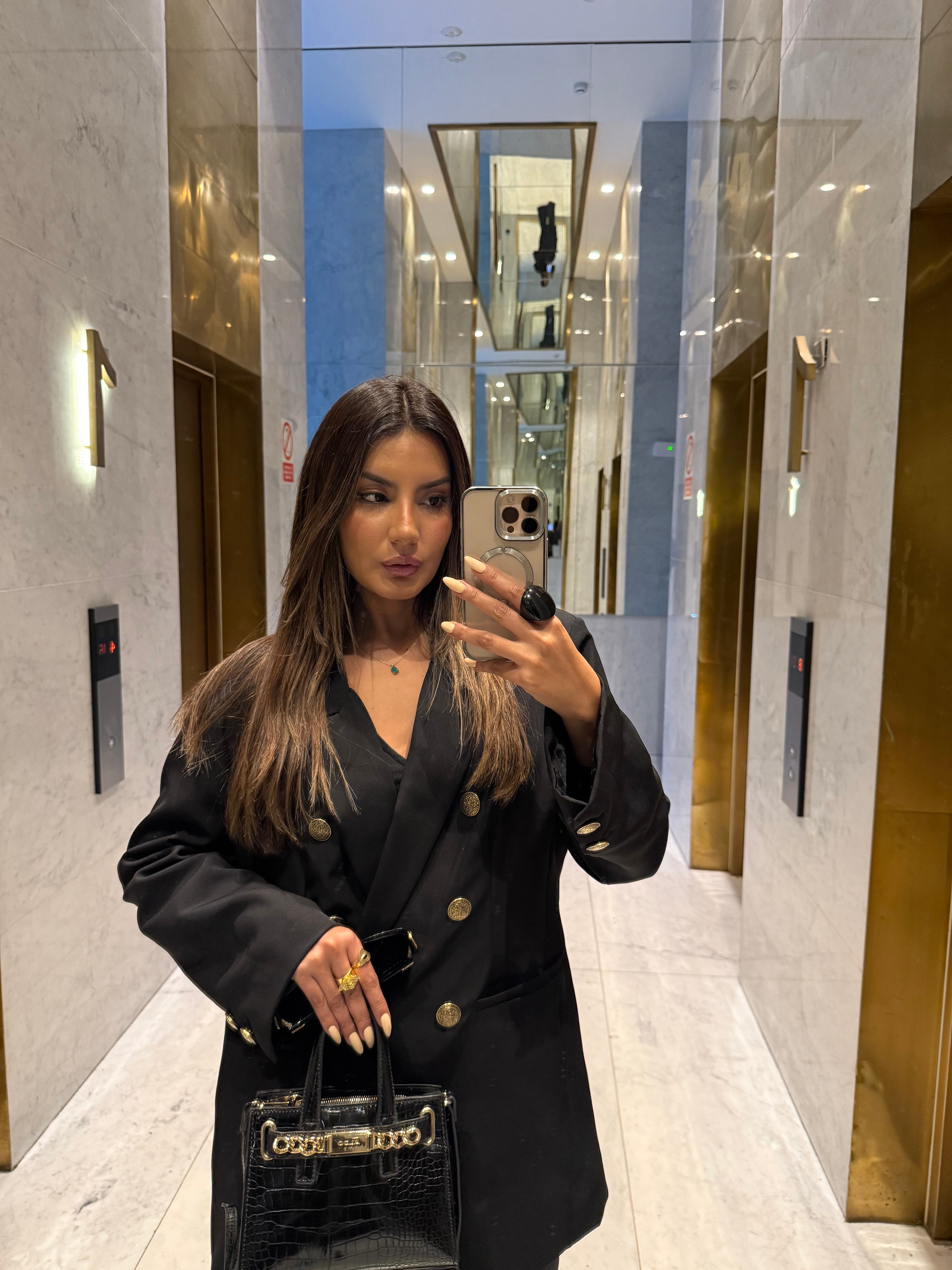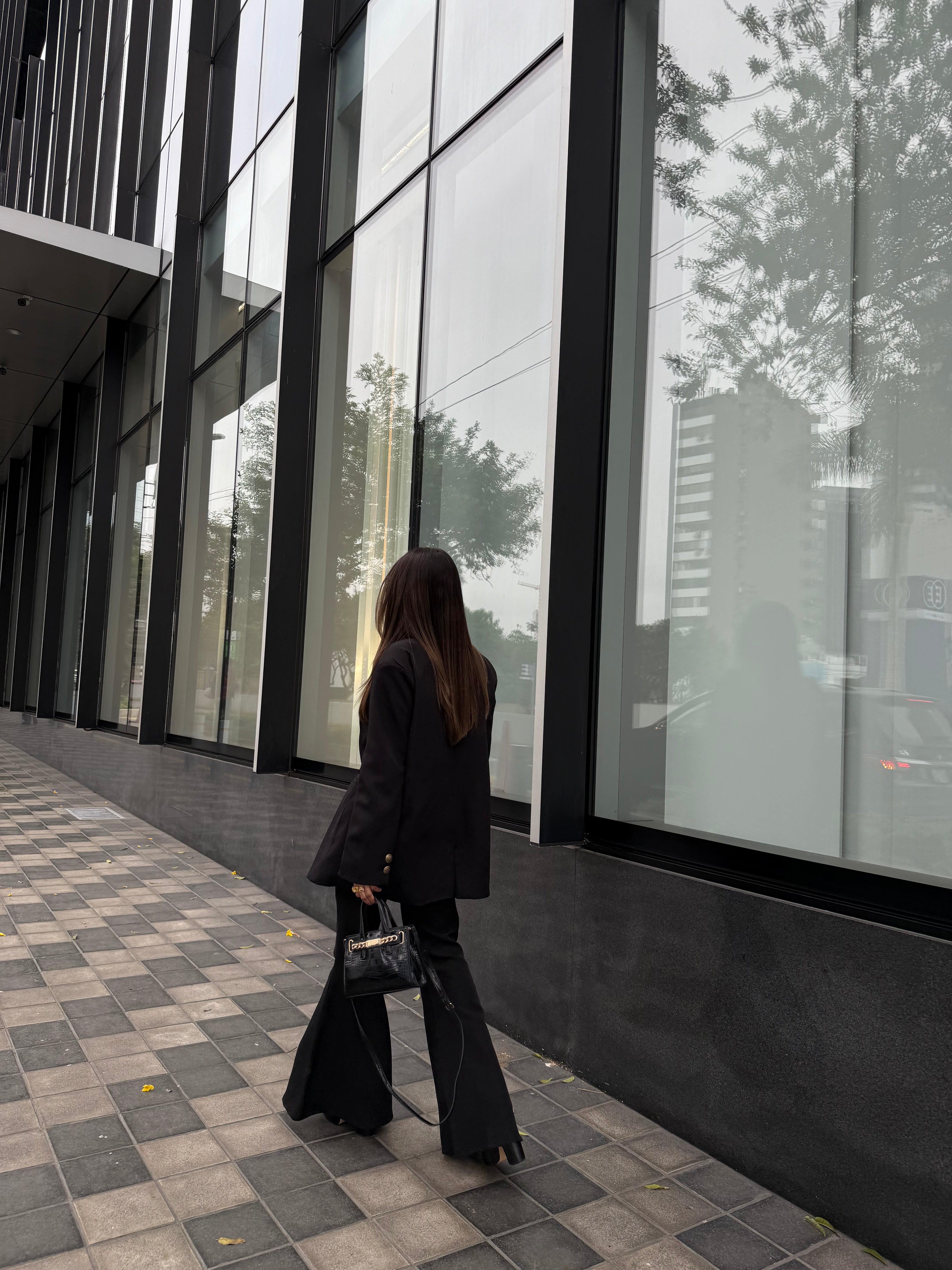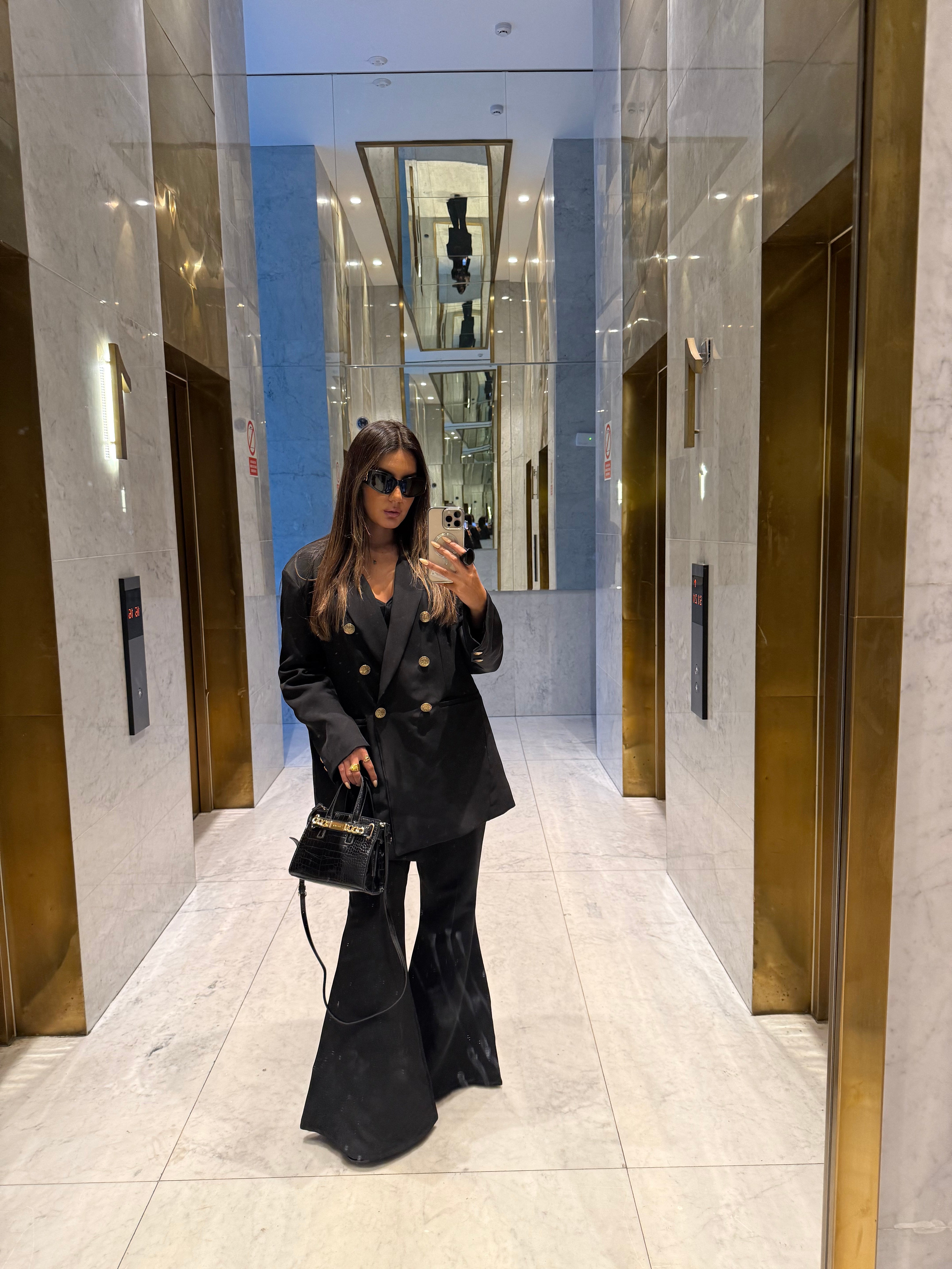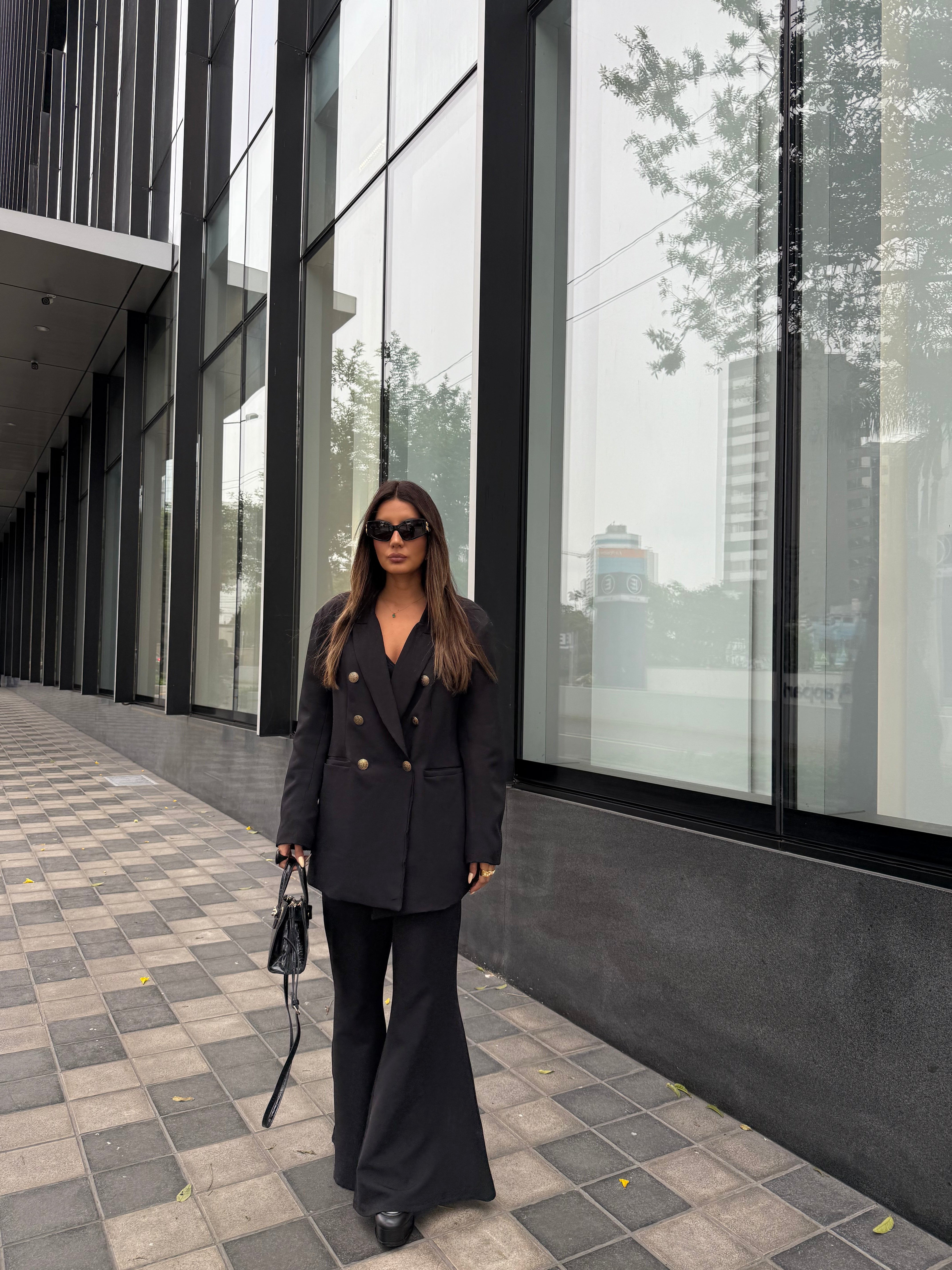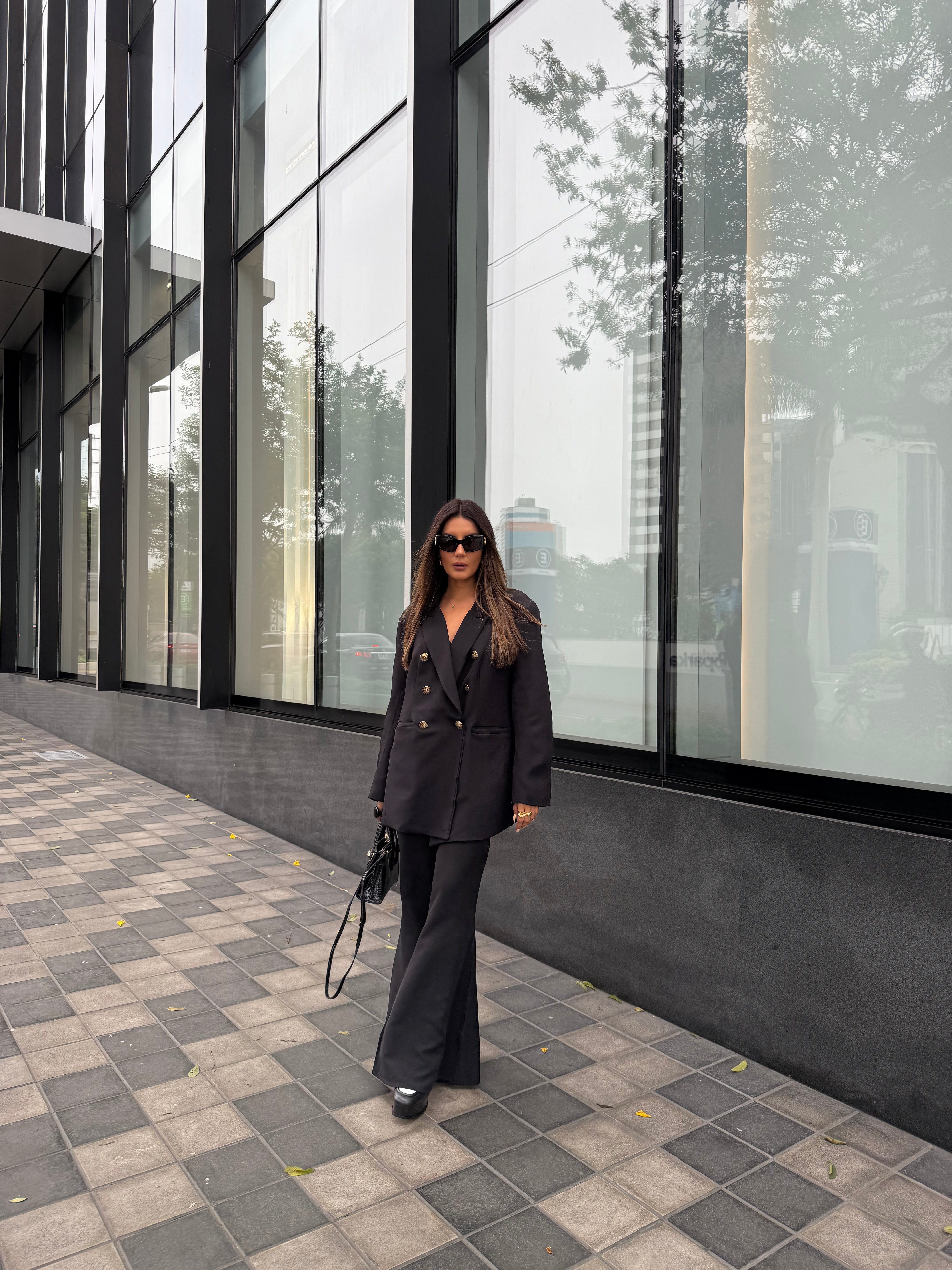 El set Lobelia combina un blazer de fit oversized de doble abotonadura con pantalones de corte flare, creando una silueta elegante y poderosa. Su tono negro profundo lo convierte en una prenda versátil y atemporal, perfecta para destacar en reuniones importantes, cenas sofisticadas o cualquier ocasión en la que quieras irradiar seguridad y estilo.