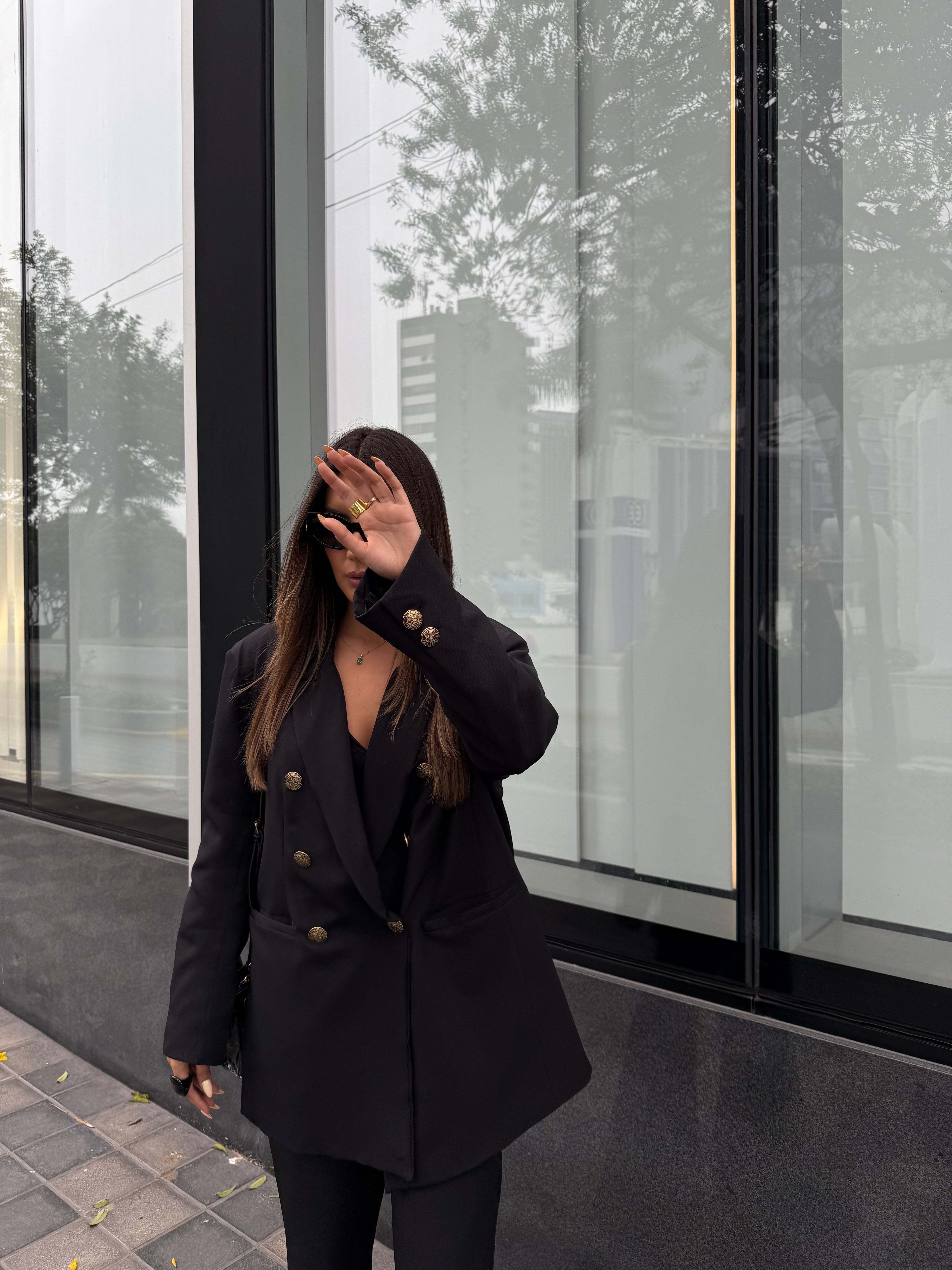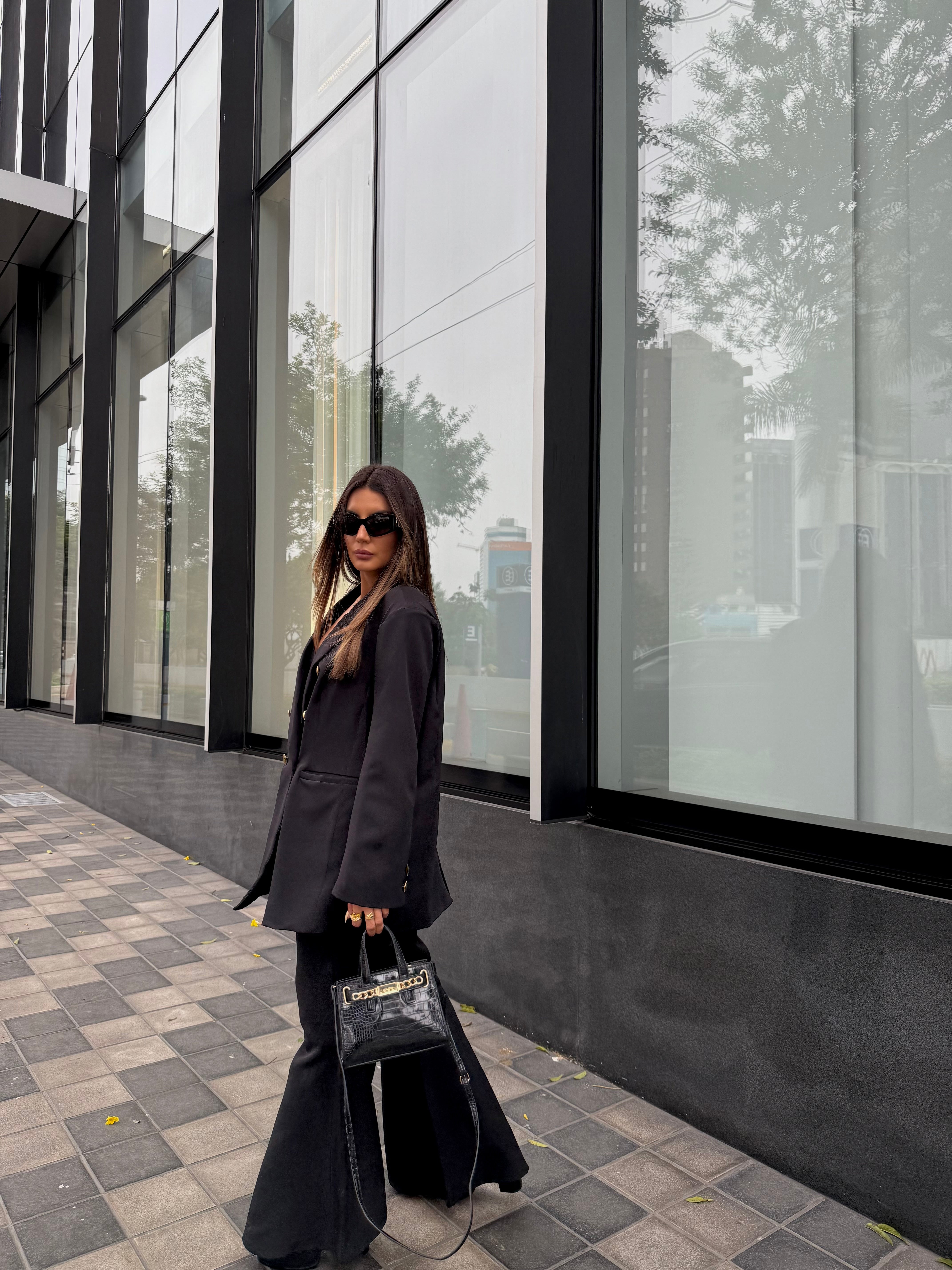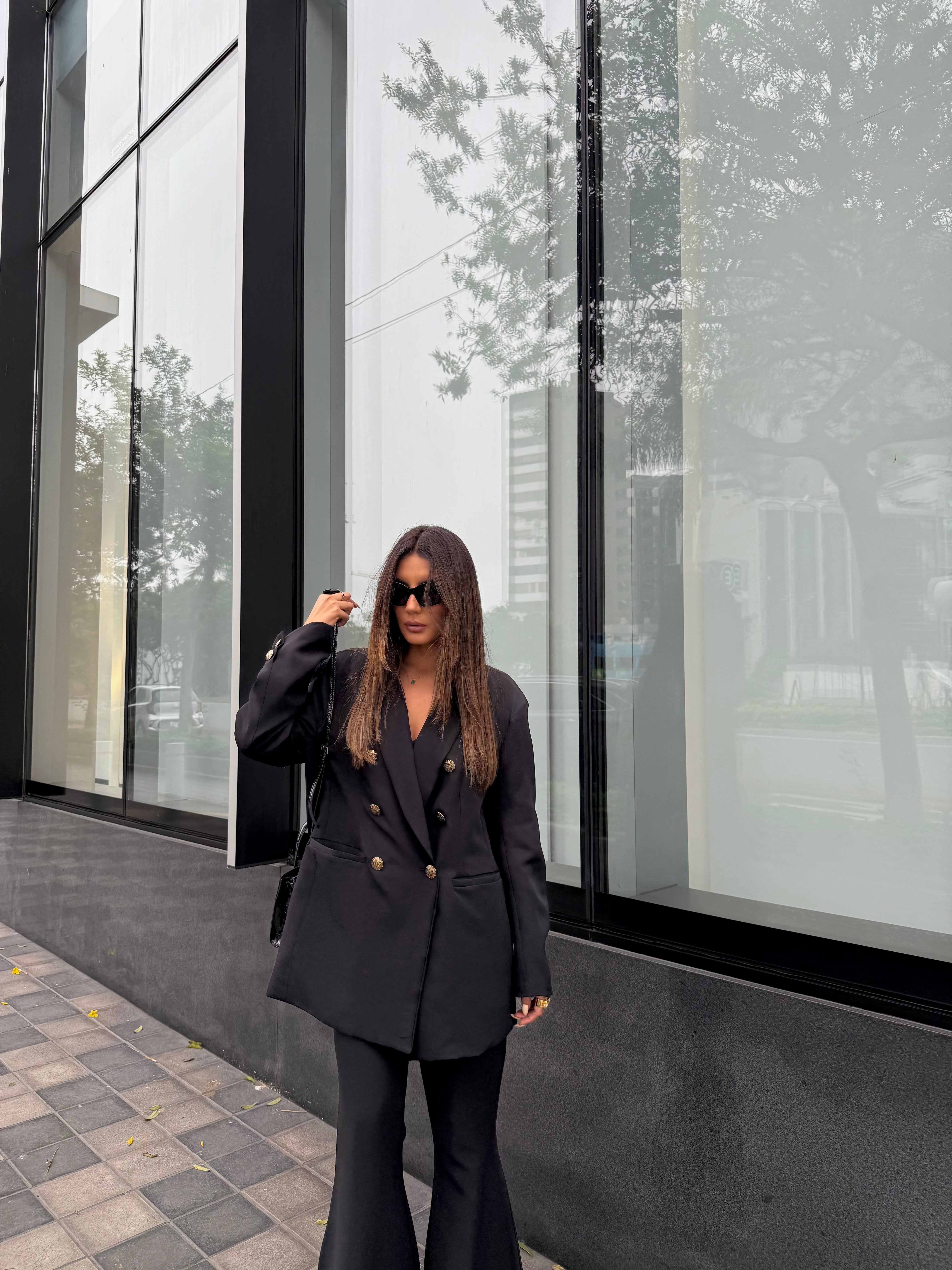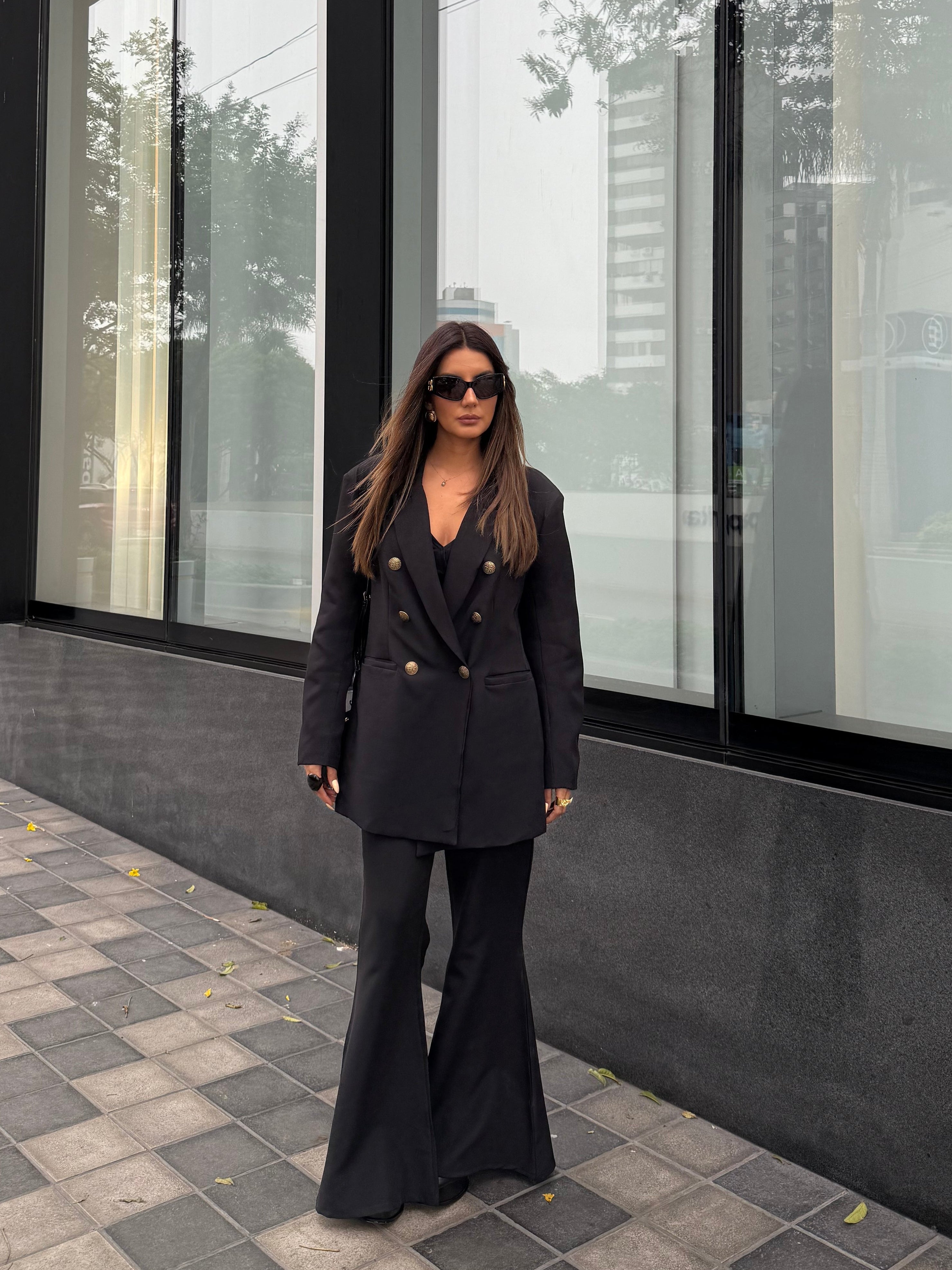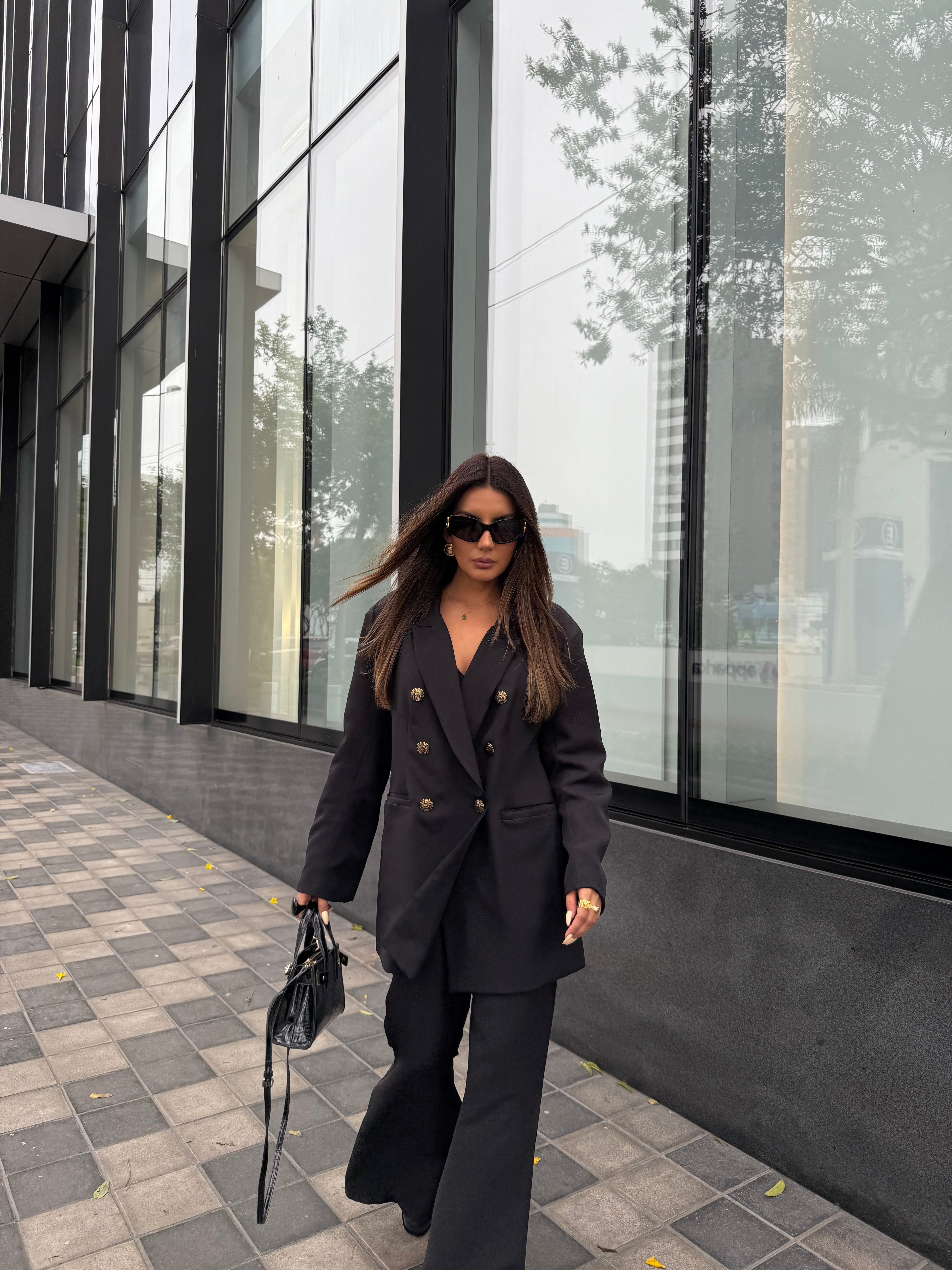 El blazer oversized cuenta con botones metálicos que aportan un toque sofisticado y moderno, mientras que el pantalón de pierna ancha alarga visualmente la figura, logrando un look estilizado y chic.