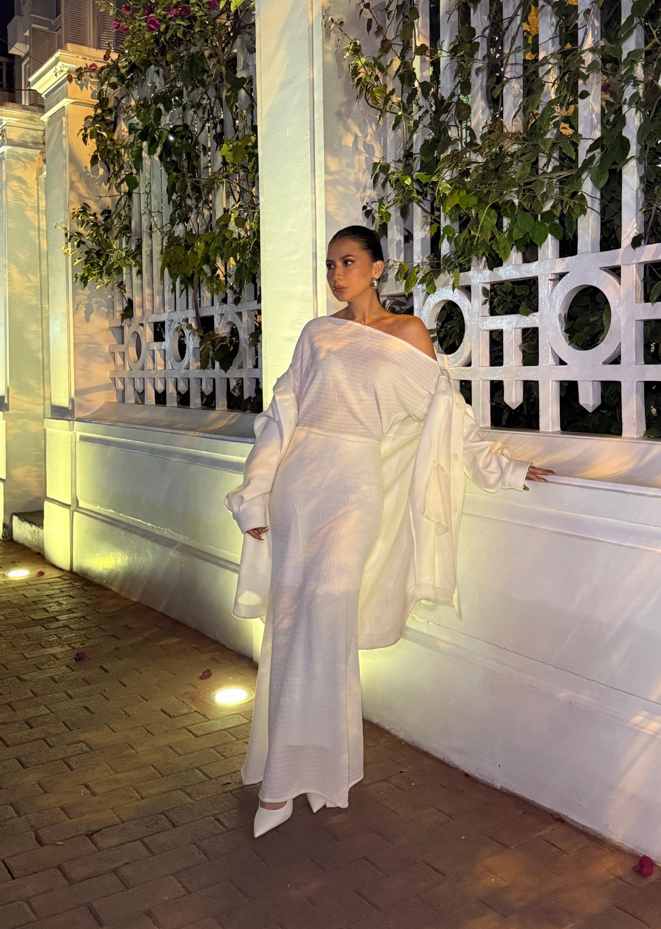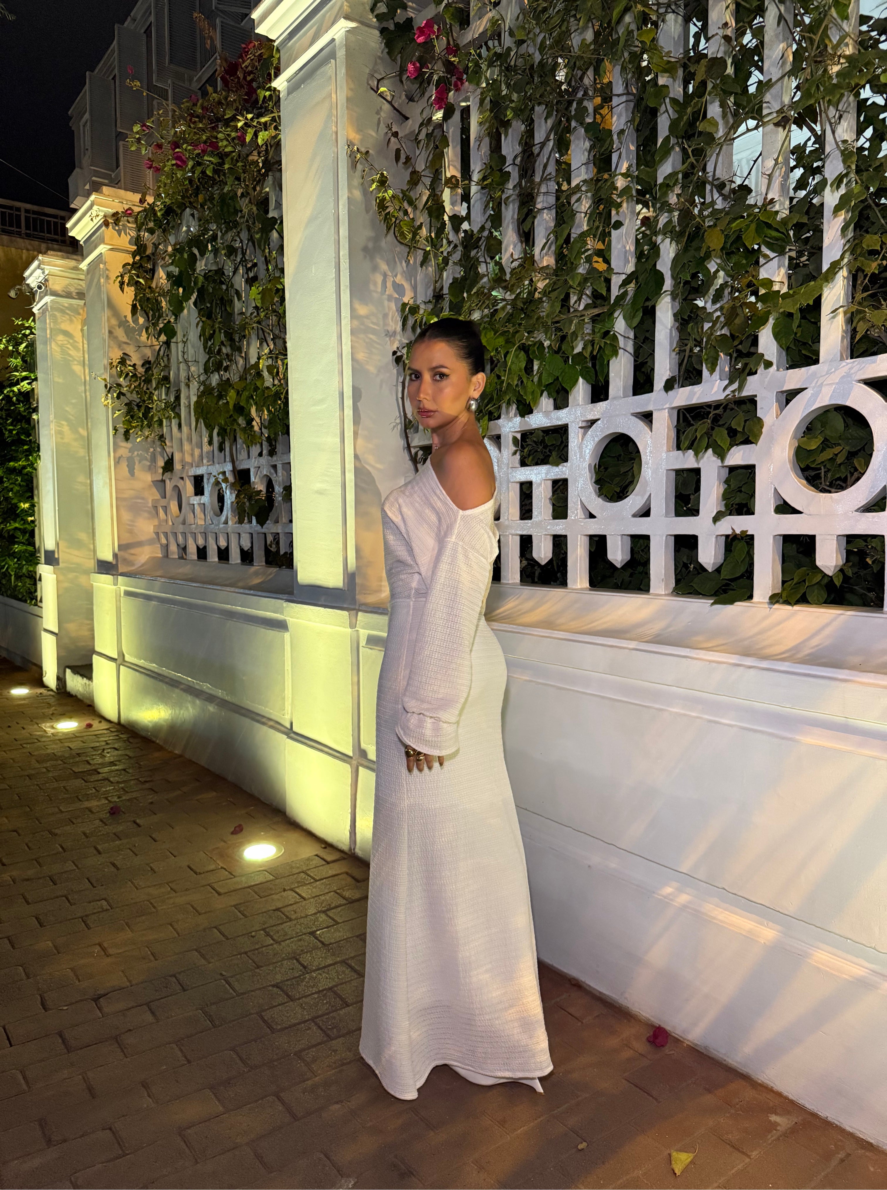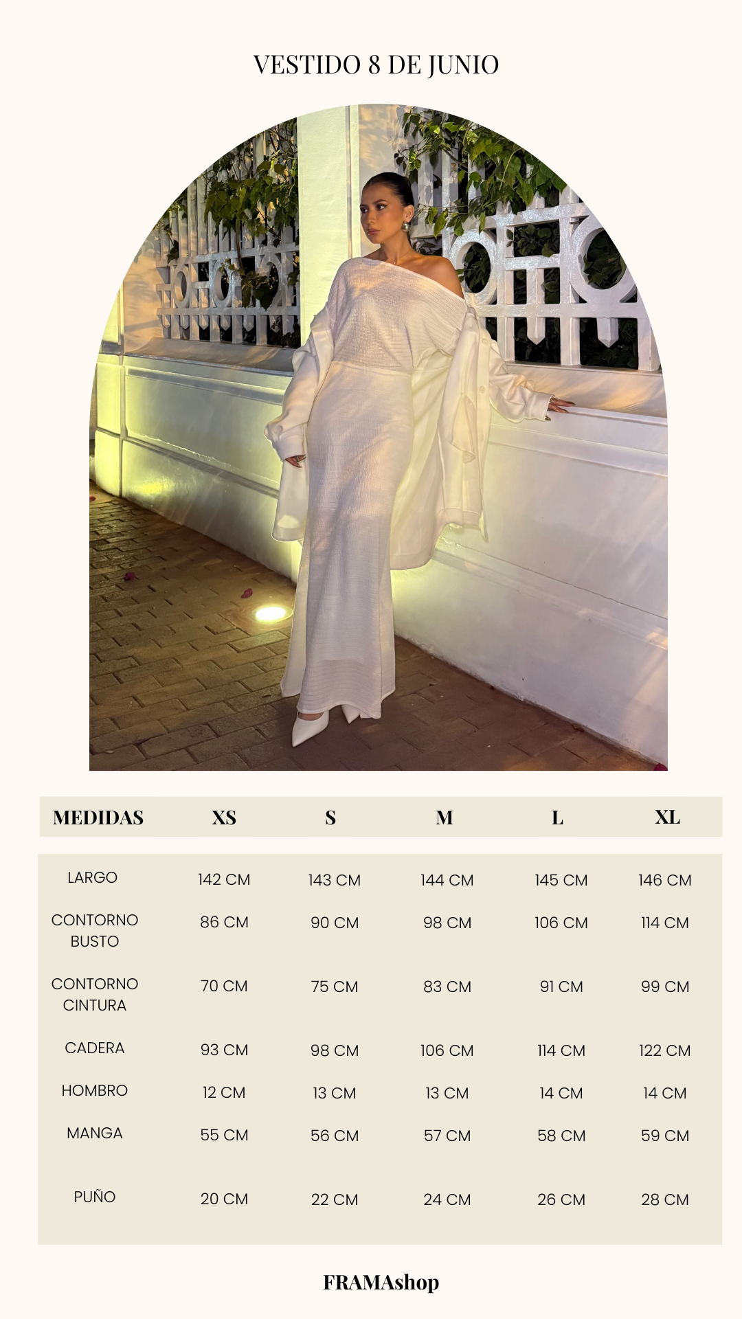 Vestido 8 de junio de corte largo y ceñido que realza la silueta, este diseño en tono blanco clásico y elegante emana seguridad y sofisticación. Su escote asimétrico y manga larga aportan elegancia. El rojo vibrante es el color perfecto para transmitir seguridad y sofisticación en cada paso.
