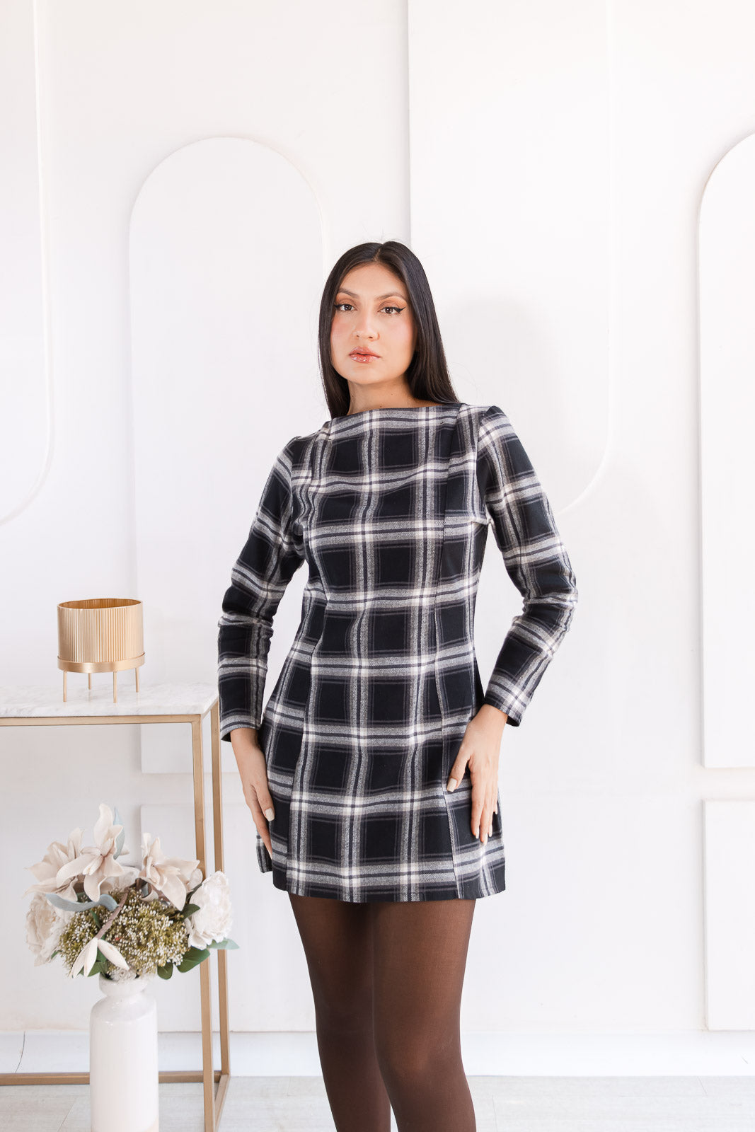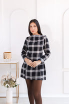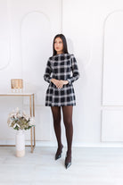 Su estampado tartán en tonos negro y blanco convierte cada look en una declaración de elegancia con un largo mini que estiliza las piernas y aporta una vibra retro y sofisticada al mismo tiempo. Es perfecto para eventos de día o de noche, cenas especiales, celebraciones o reuniones elegantes.