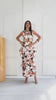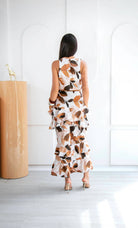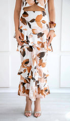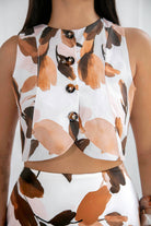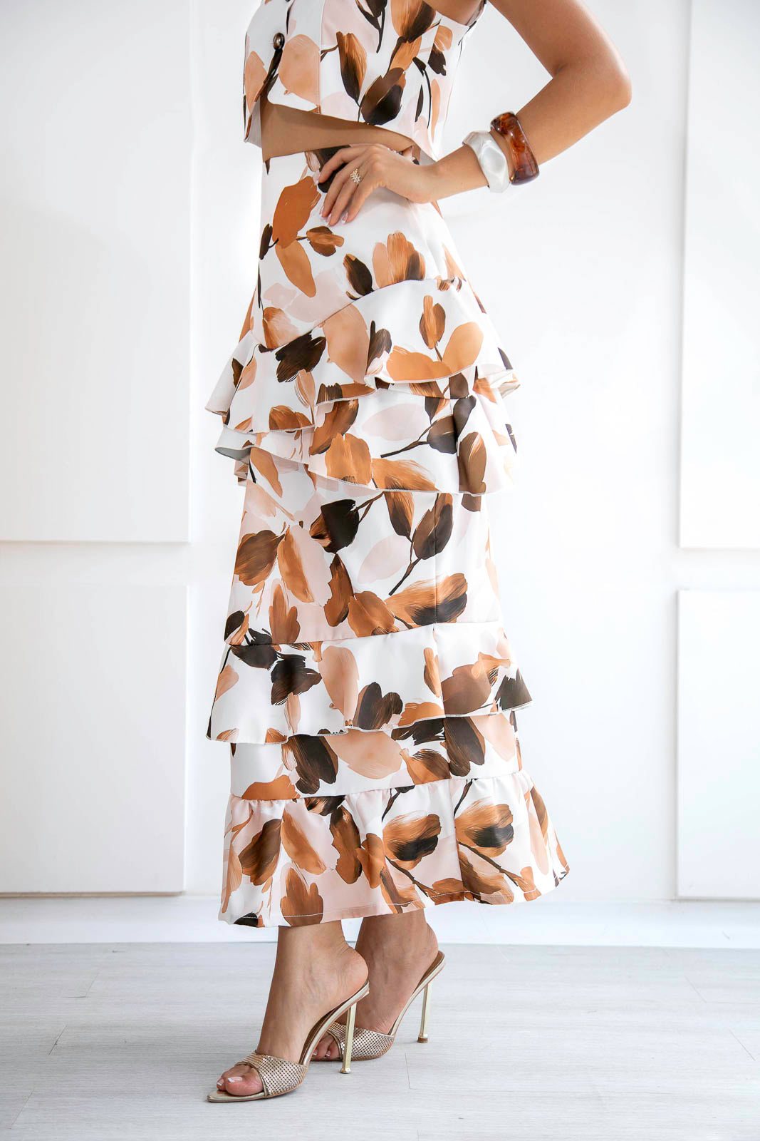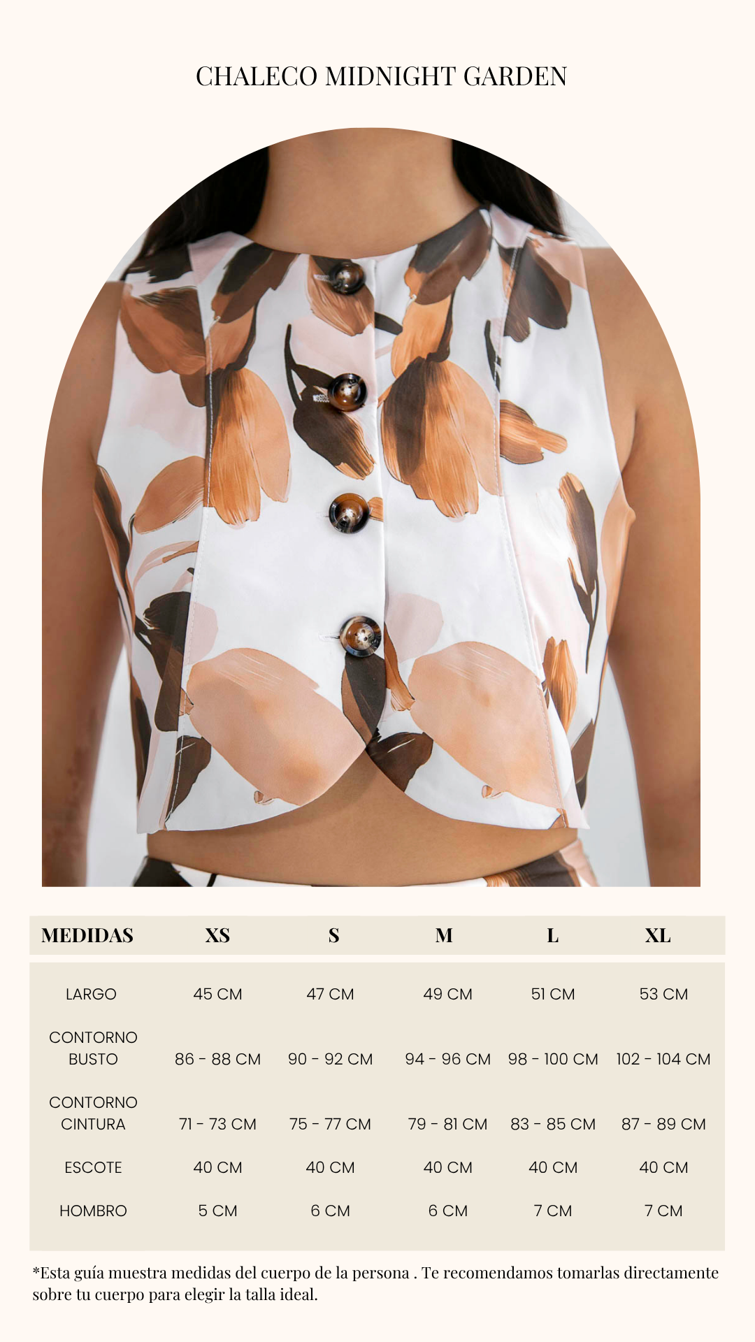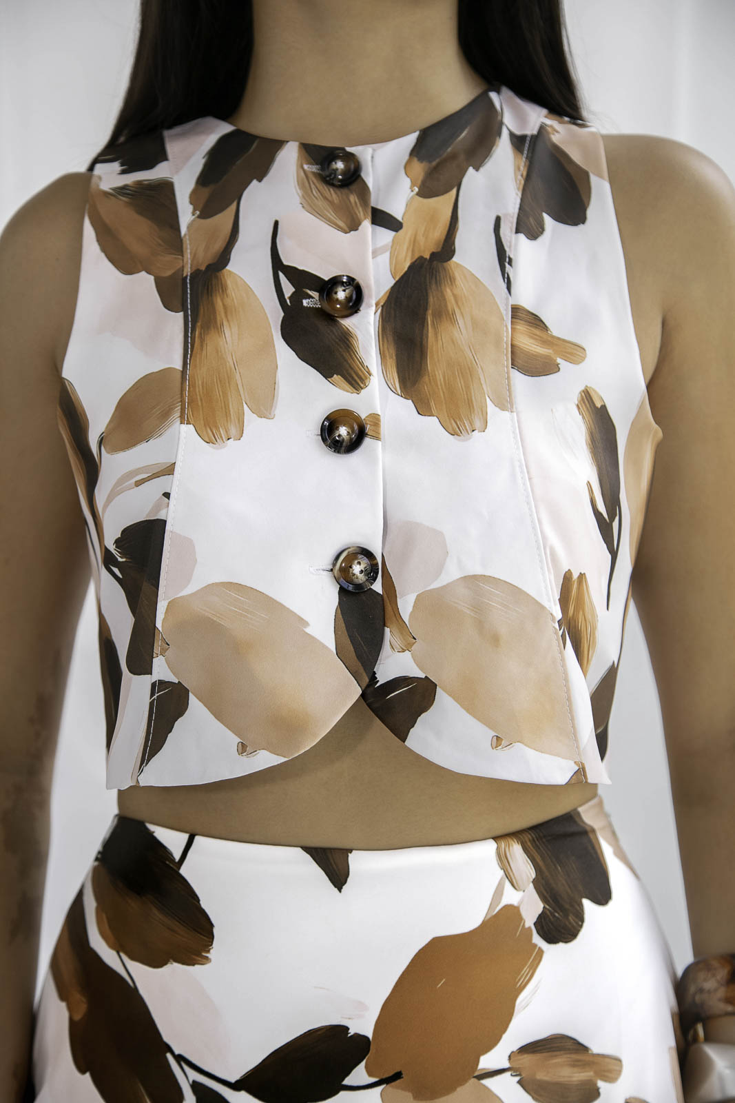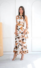 Un conjunto que enamora a primera vista. Set 2 de piezas, estampado en tonos tierra, donde se combinan matices cálidos como terracota, caramelo y beige sobre una base clara. Chaleco de silueta estructurada y corte limpio, estiliza la parte superior y enmarca el torso de manera favorecedora. Falda larga con pliegues de caída amplia crea un movimiento ligero y elegante.