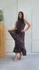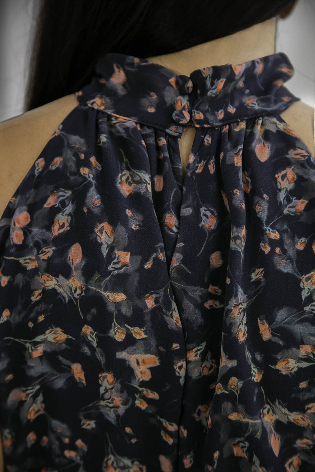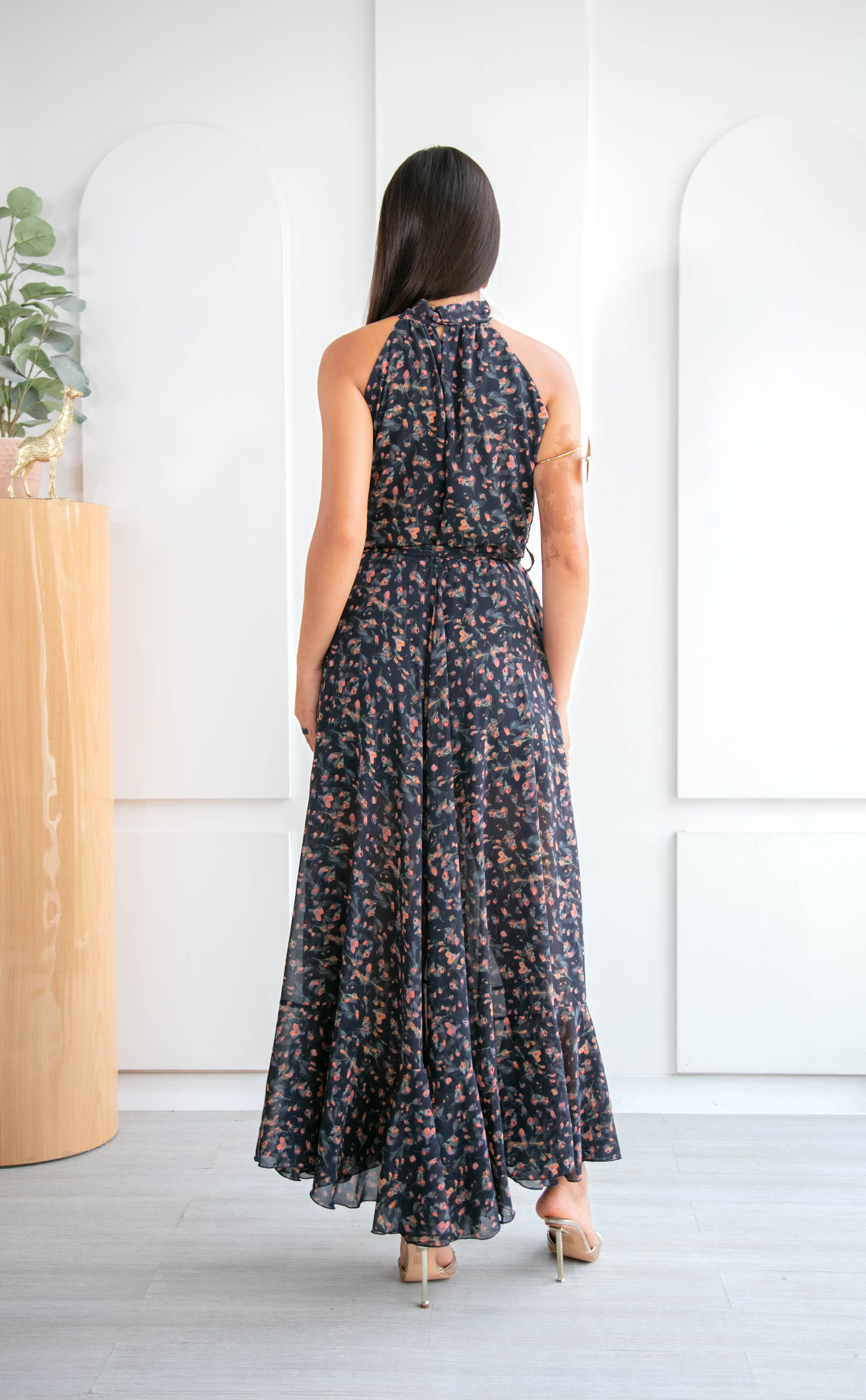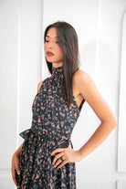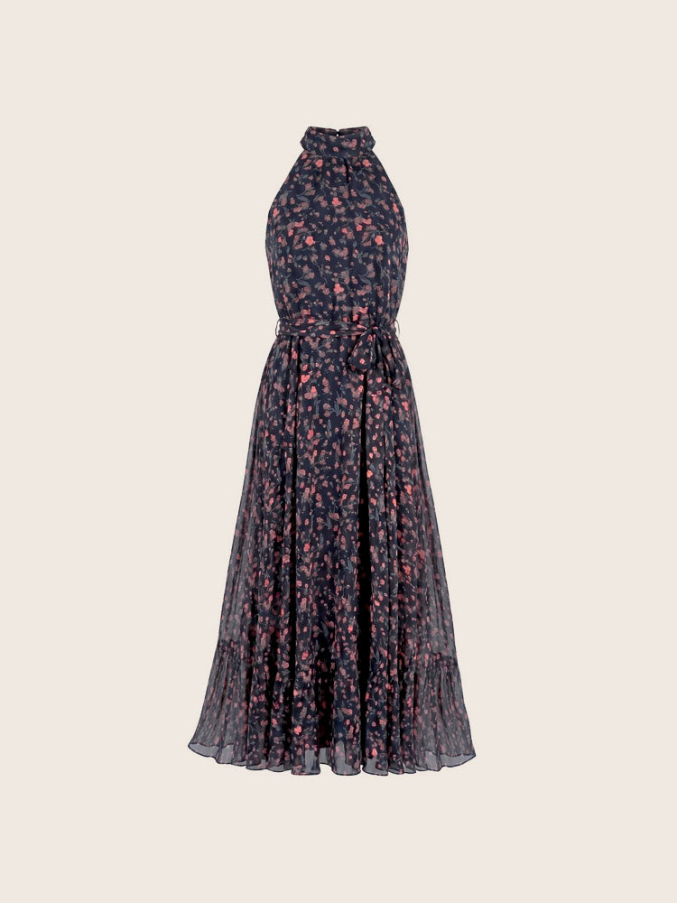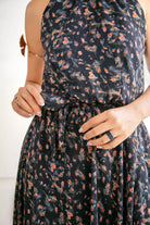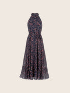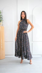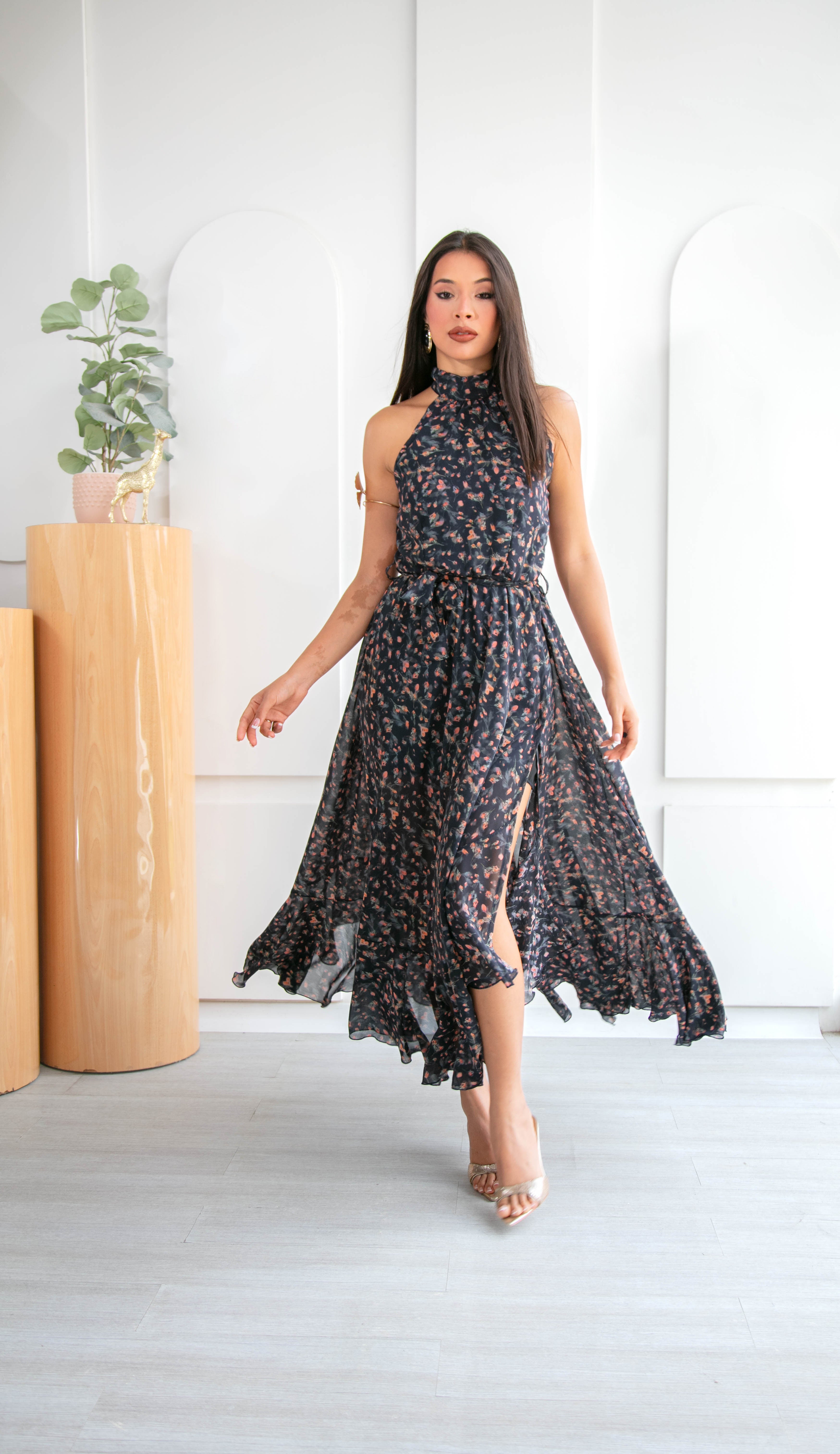 Vestido largo con cuello halter y fluido que envuelve tu silueta con suavidad, realzando tu feminidad con cada movimiento. Su estampado floral en tonos rosados, terracota y matices suaves sobre una base oscura, crea un contraste suave y romántico, mientras que el lazo en la cintura estiliza la figura con un detalle encantador, es el aliado perfecto para ocasiones especiales como bautizos, almuerzos al aire libre o matrimonios de día.