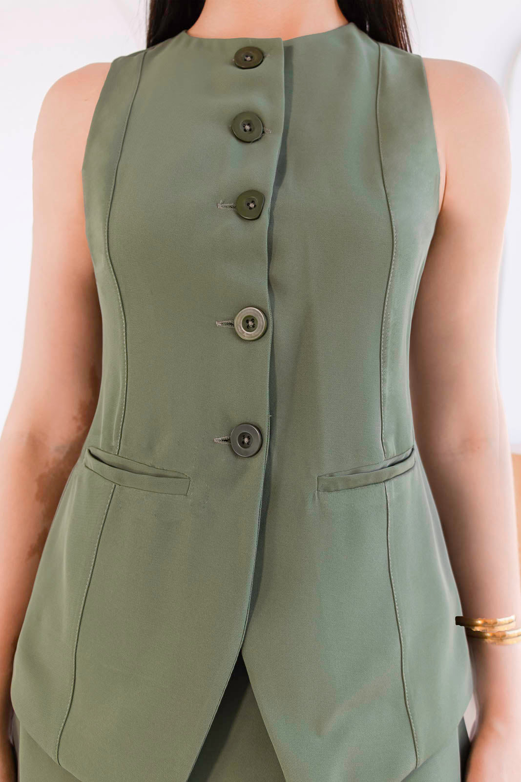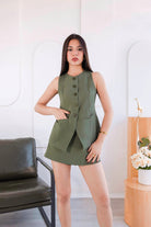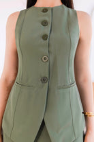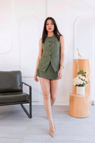 Conjunto de dos piezas en tono verde oliva, una propuesta elegante y moderna que equilibra sofisticación y frescura. El chaleco sin mangas, con botones al frente y cortes sutiles, aporta una silueta estilizada y pulida, mientras que el short estructurado complementa el look con un aire contemporáneo y femenino.