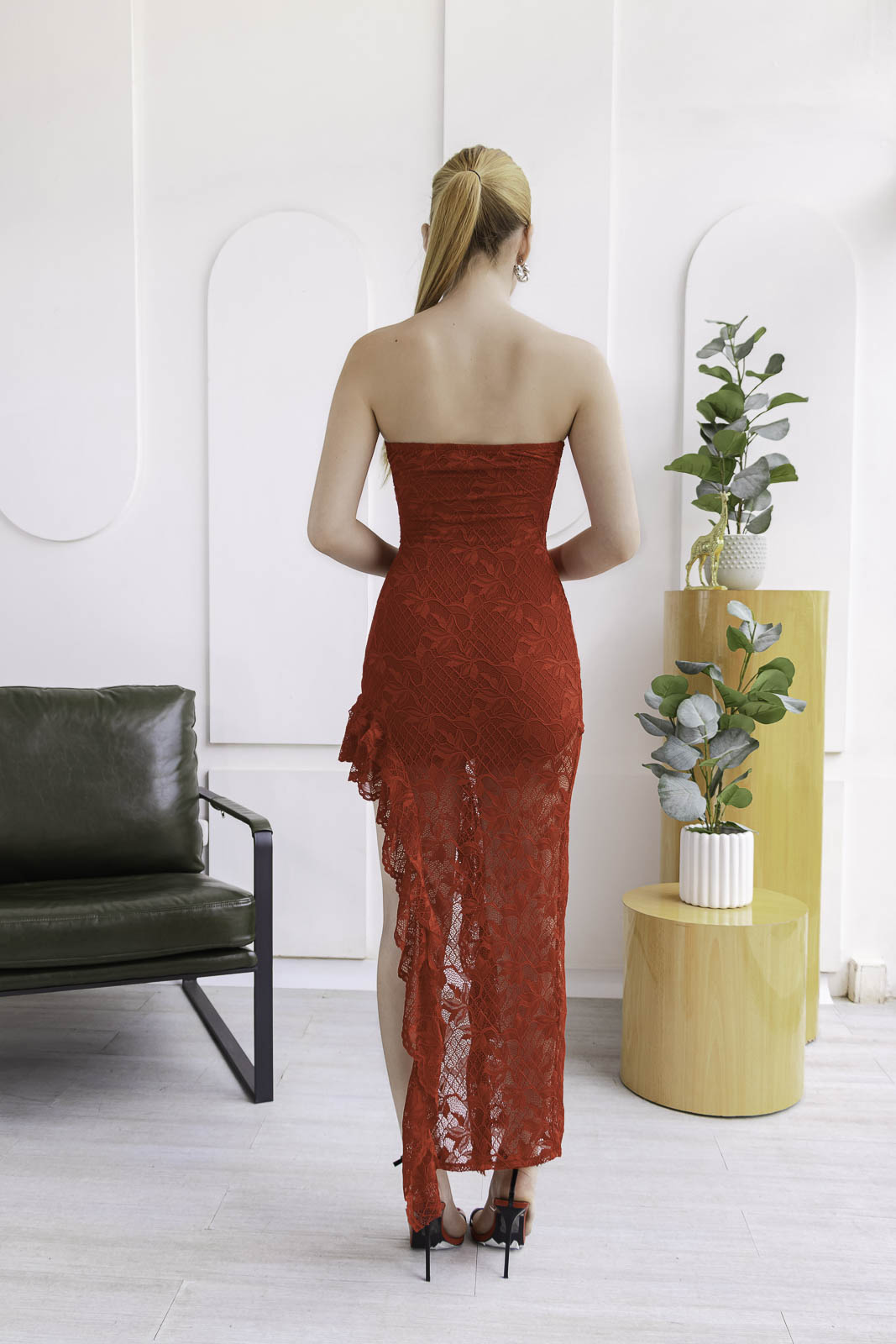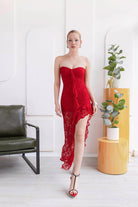 Su diseño strapless realza el escote de forma delicada, mientras que el corte asimétrico con bobos en la pierna aporta movimiento y un efecto visual que estiliza la figura de manera natural. El largo irregular y la caída fluida lo hacen elegante y romántico.