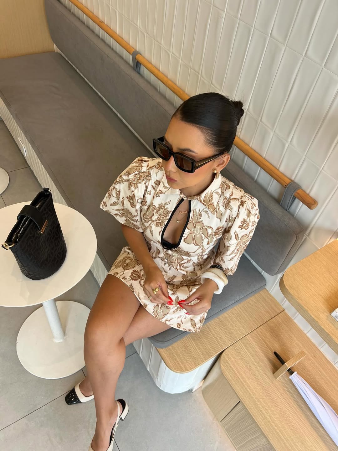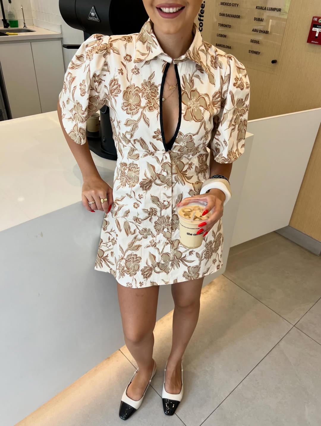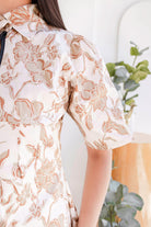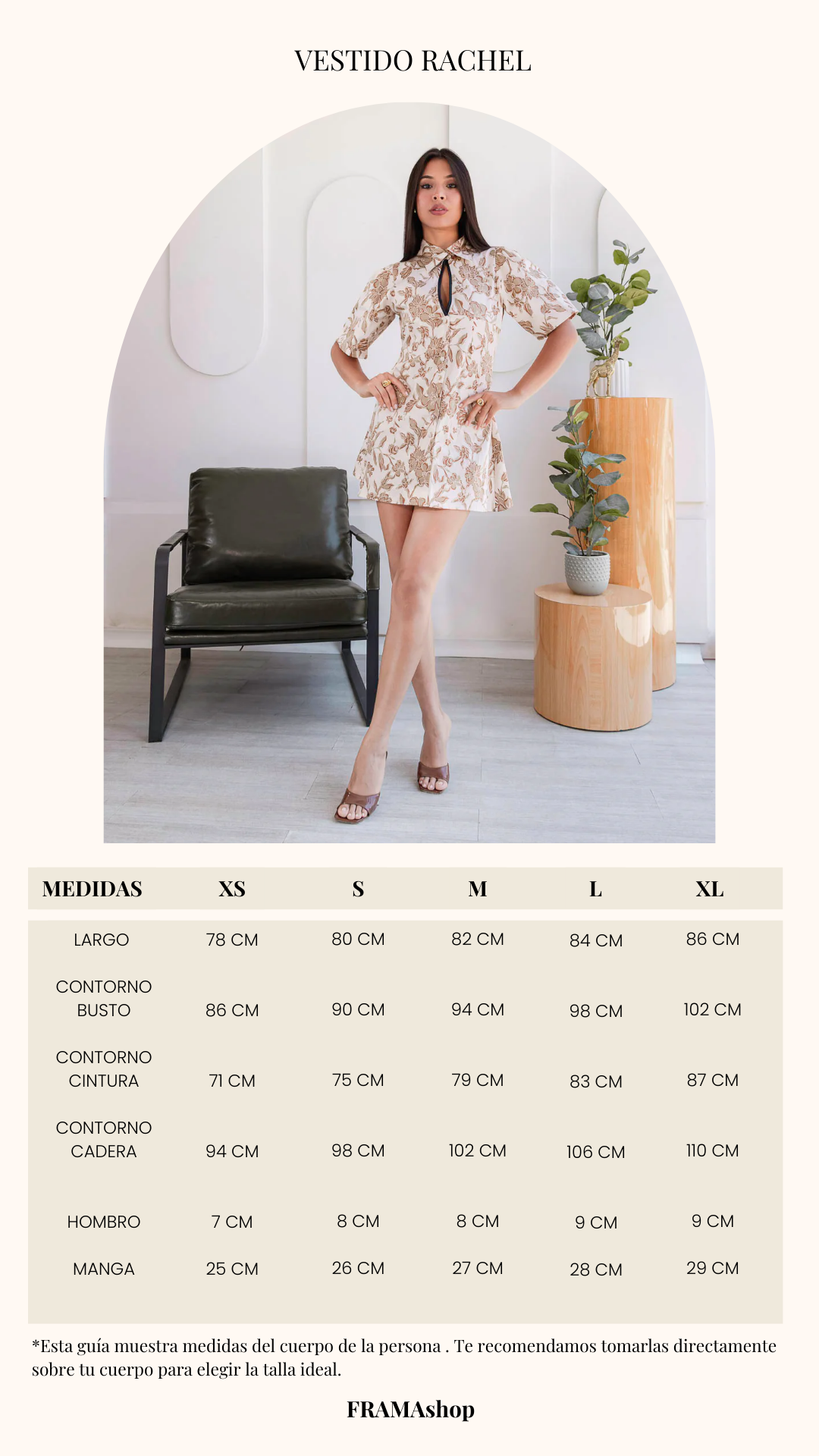 El vestido Rachel de tono marfil, destaca por su delicado estampado floral en matices beige y tierra, que aporta un aire natural y elegante. Su diseño de mangas cortas estructuradas equilibra comodidad y estilo, mientras que el detalle del ribete en el cuello color negro y abertura sutil en el escote lo hace femenino y romántico.