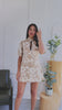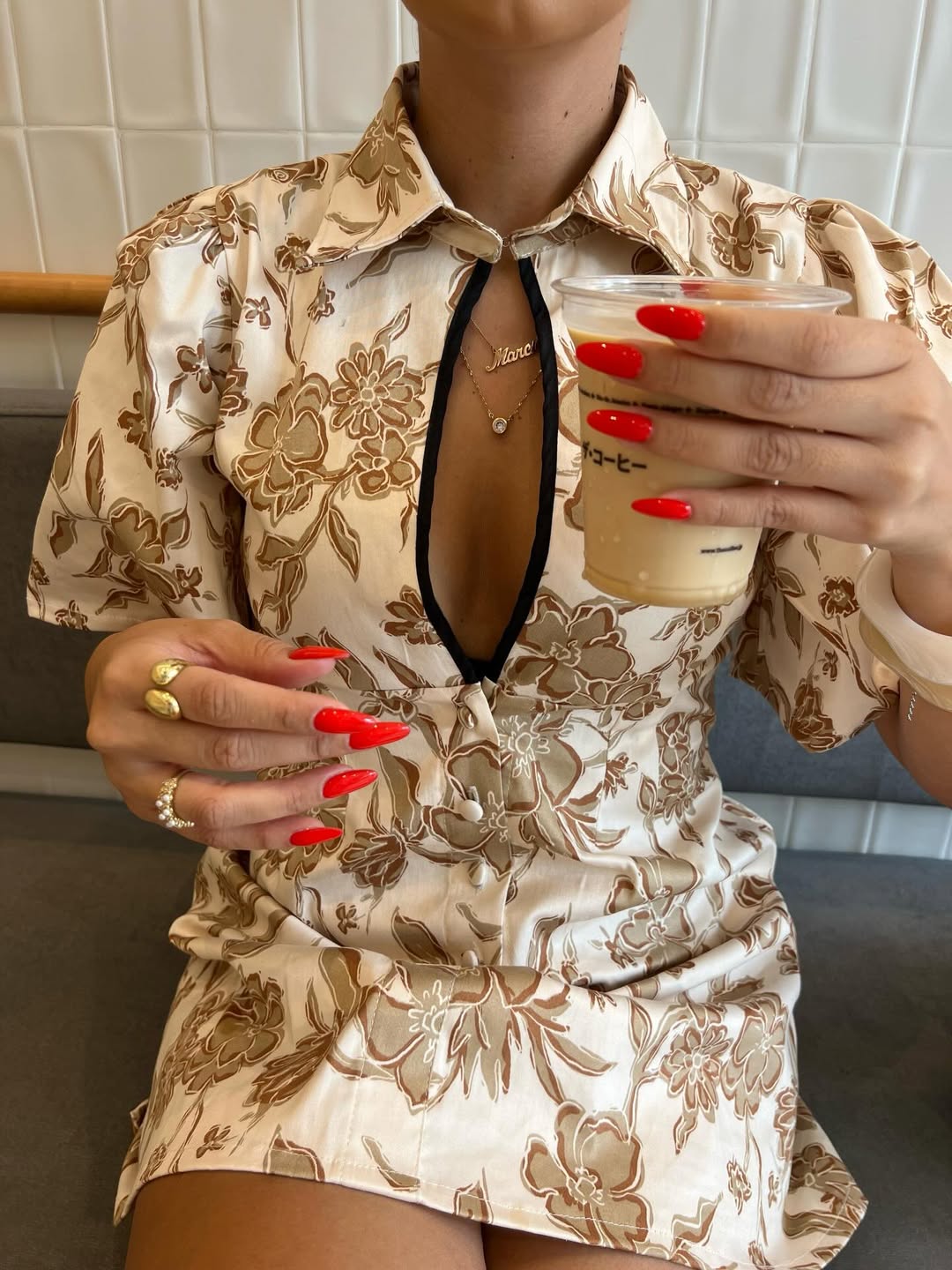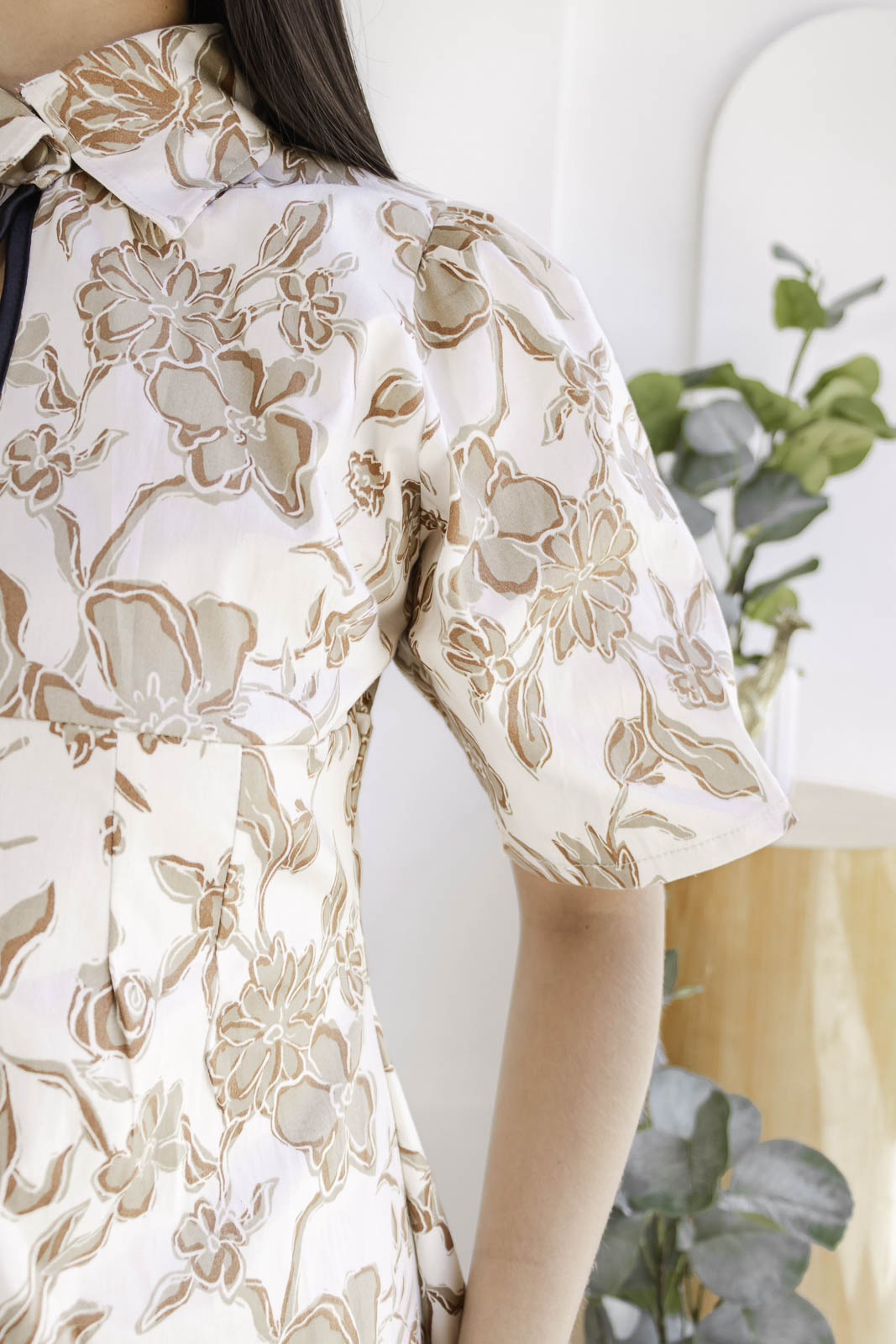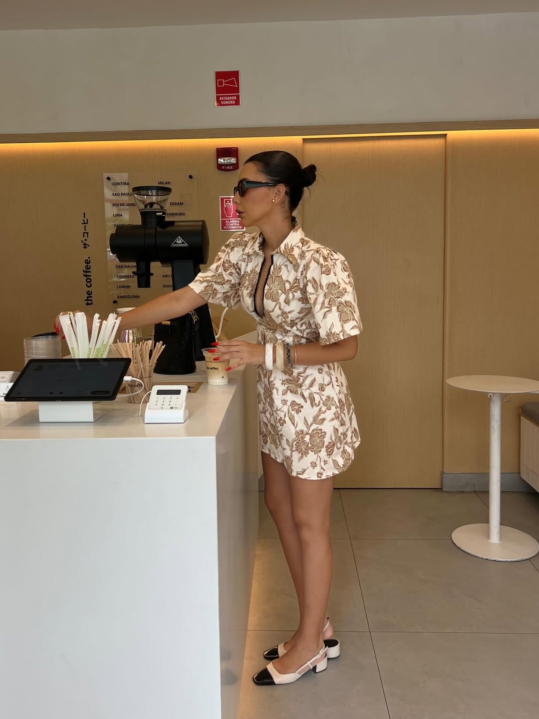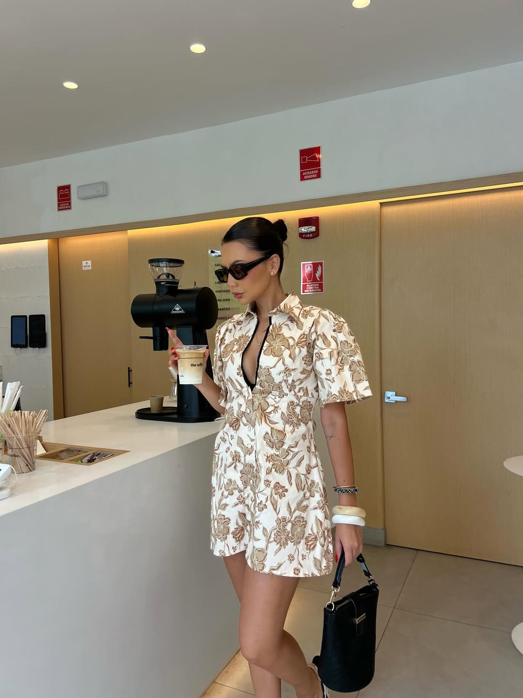 El vestido Rachel de tono marfil, destaca por su delicado estampado floral en matices beige y tierra, que aporta un aire natural y elegante. Su diseño de mangas cortas estructuradas equilibra comodidad y estilo, mientras que el detalle del ribete en el cuello color negro y abertura sutil en el escote lo hace femenino y romántico.