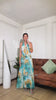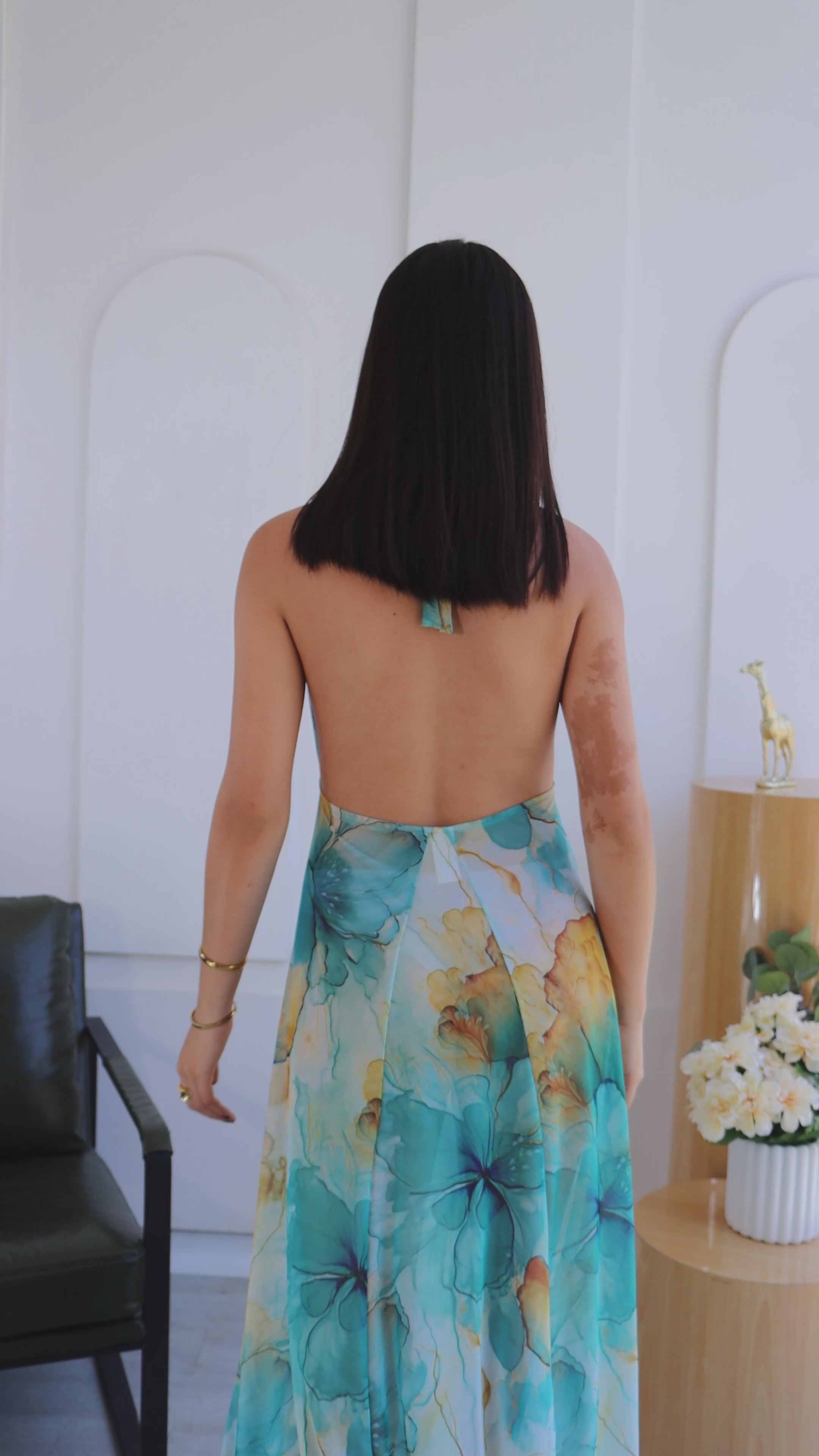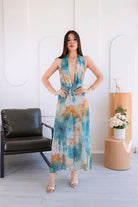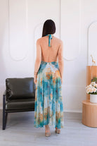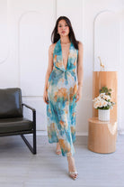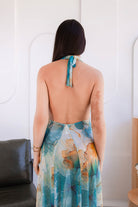 Su estampado artístico tipo acuarela hace que cada ángulo destaque, mientras que su escote profundo, espalda descubierta y silueta larga estilizan la figura con elegancia y sensualidad.