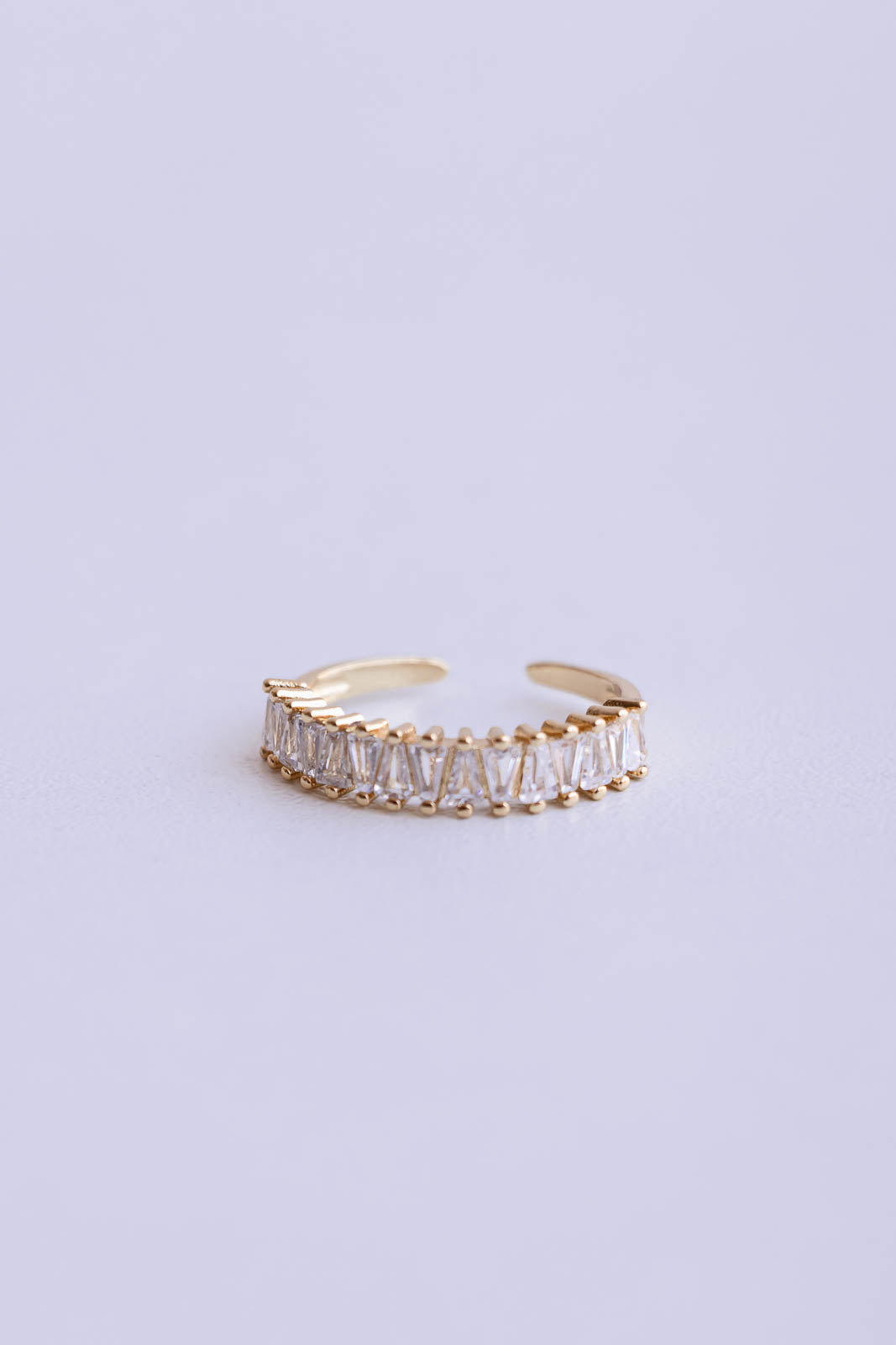 Anillo ajustable en tono dorado destaca por su delicado diseño adornado con zirconias en corte trapezoidal, dispuestas de forma continua para crear un brillo sofisticado y uniforme.
