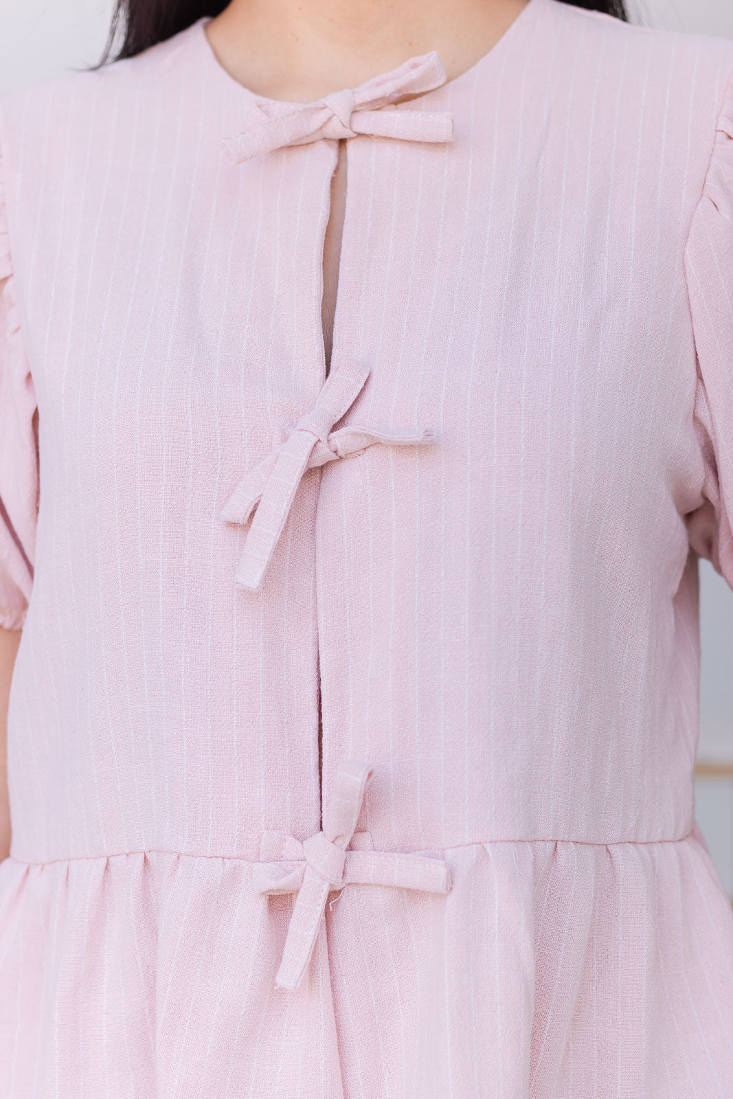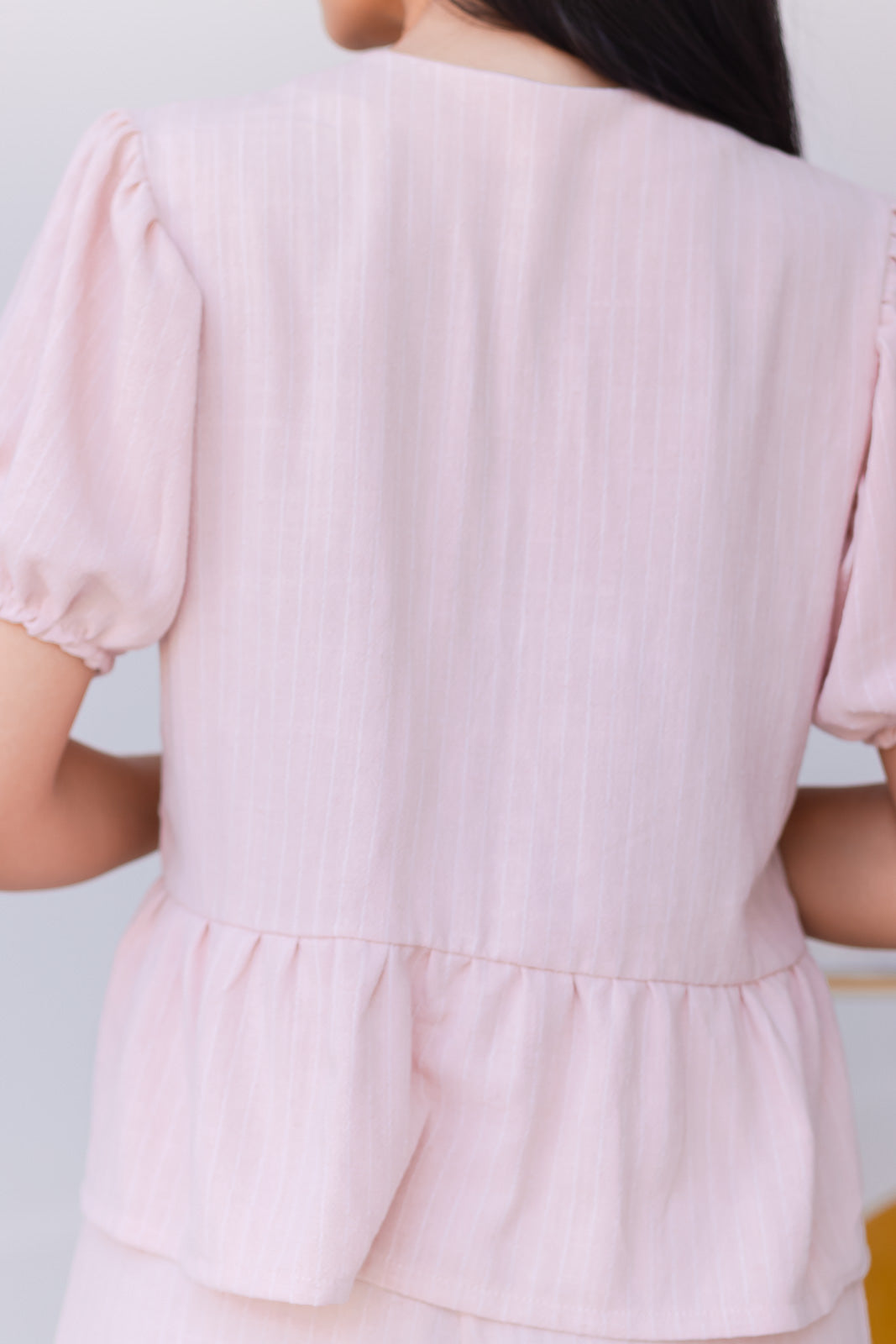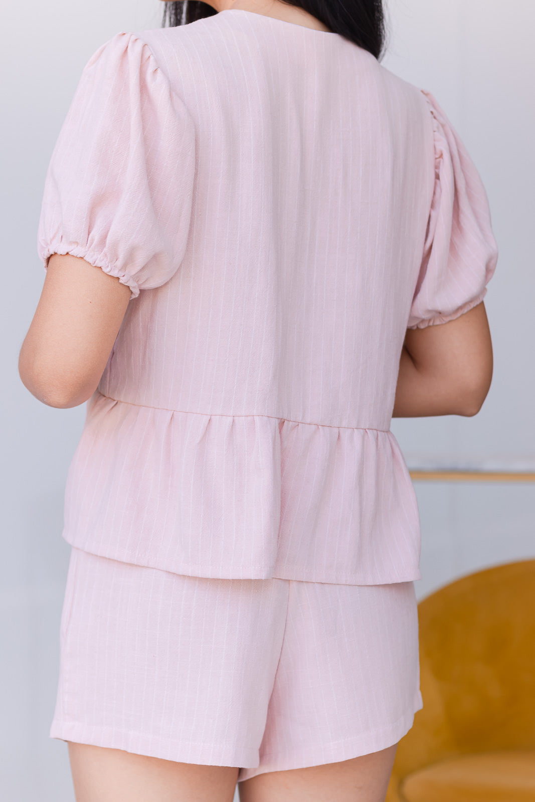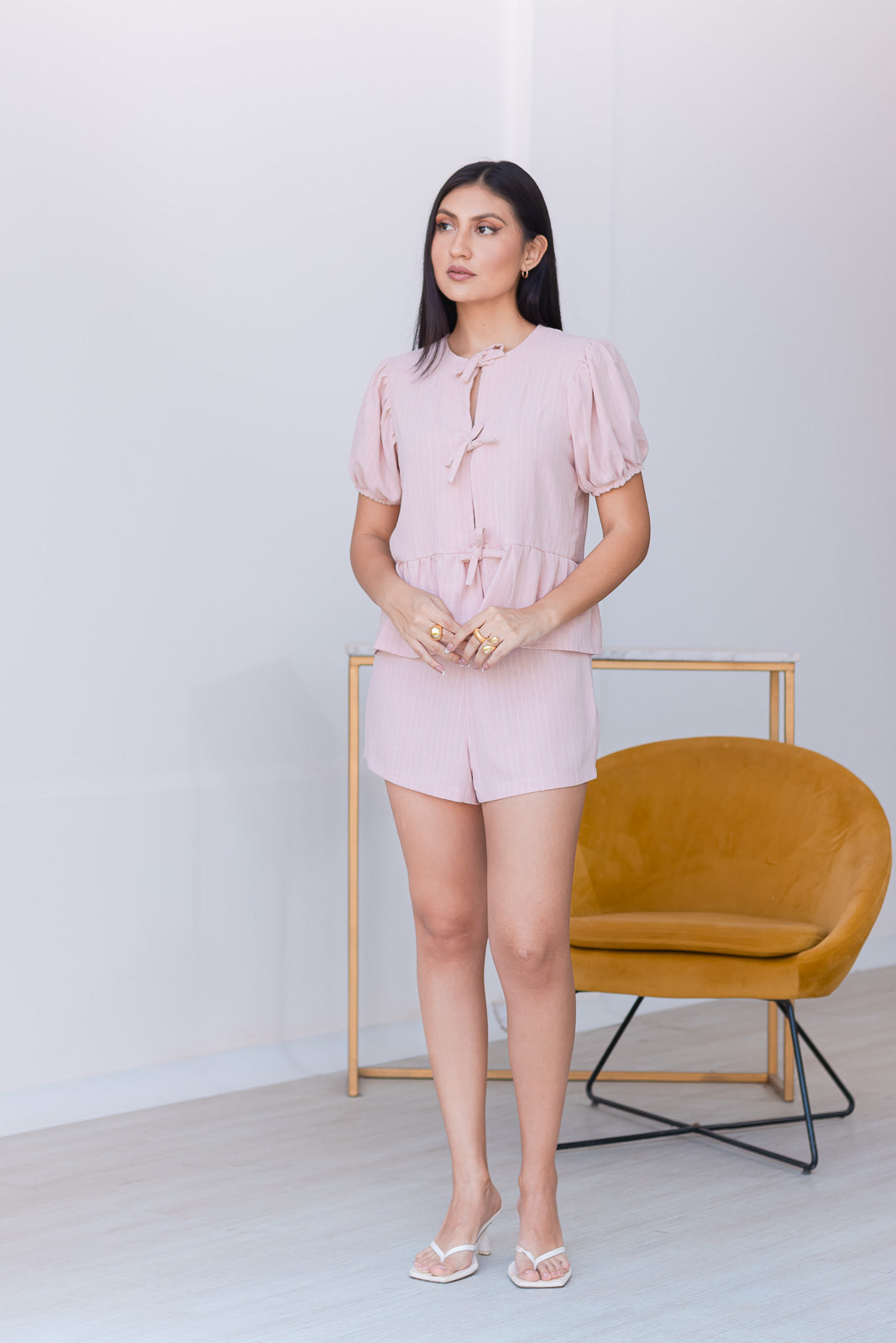 Conjunto de dos piezas. Combina estilo y comodidad, ideal para los días de verano. La blusa con lazo frontal y mangas abullonadas añade un toque femenino y sofisticado, mientras que el short asegura frescura y libertad de movimiento con detalle de cierre lateral.