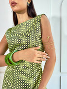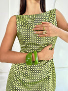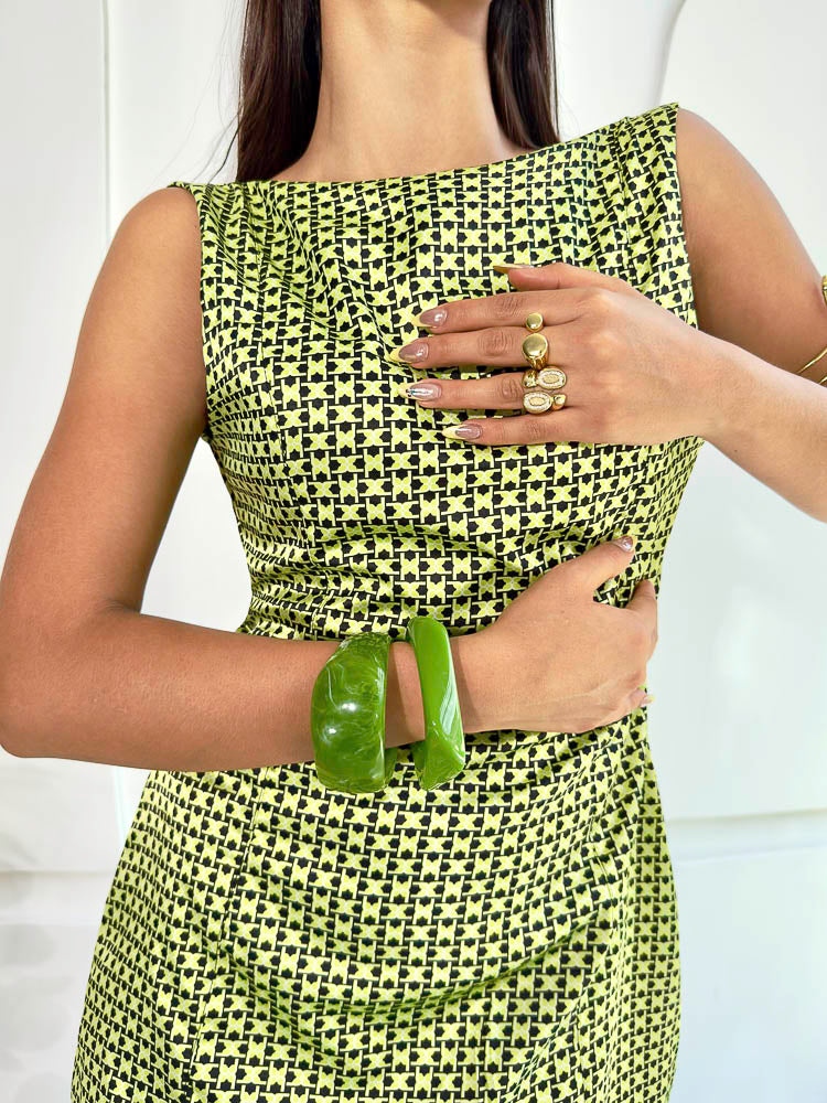 El Vestido Cupido es esa pieza que enamora a primera vista. Su silueta recta y corta realza la figura de manera favorecedora, mientras que su estampado vibrante en verde lima con detalles en negro, que aporta personalidad.