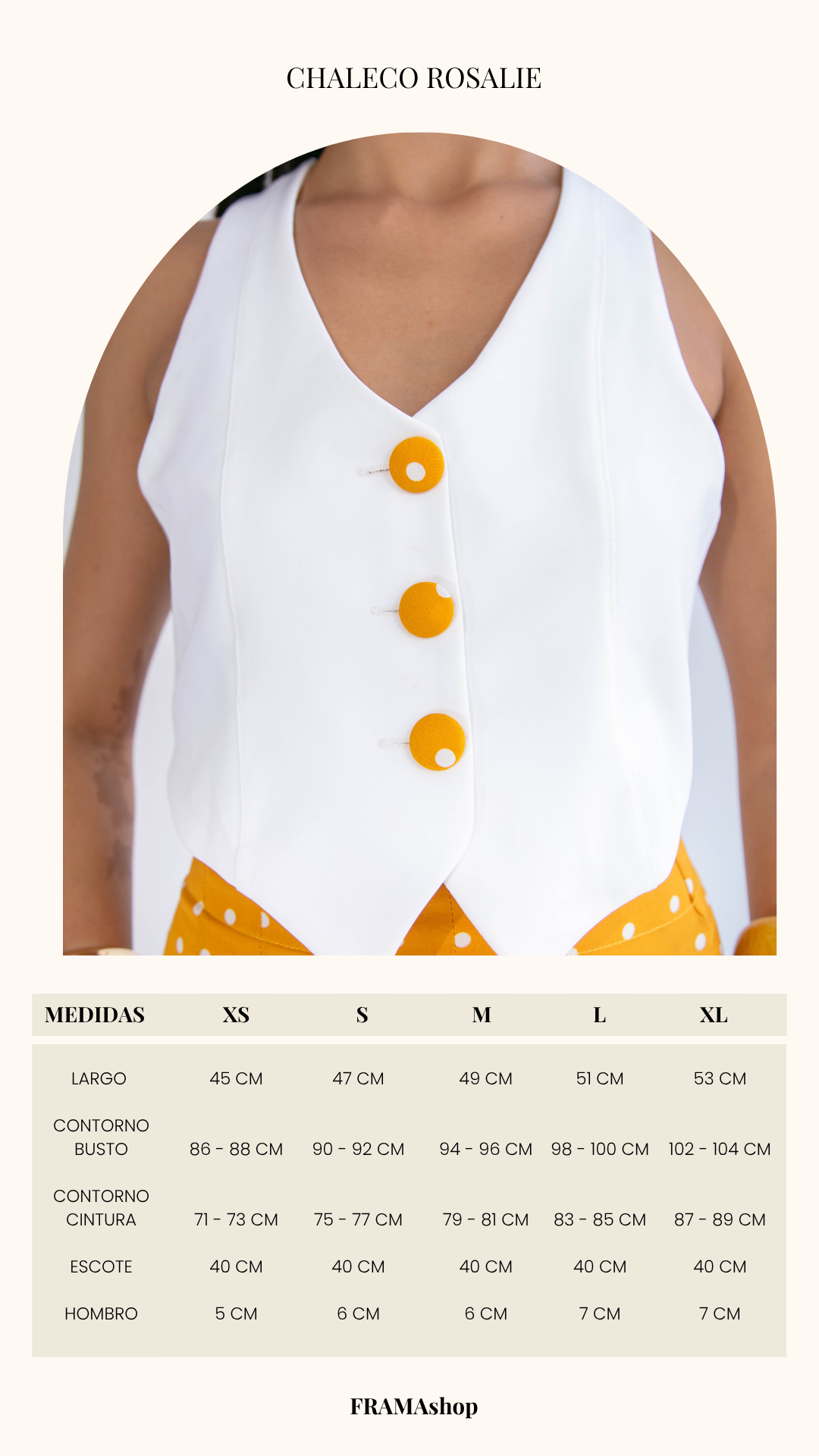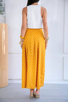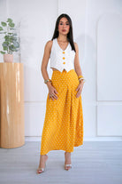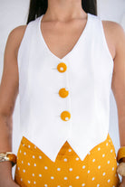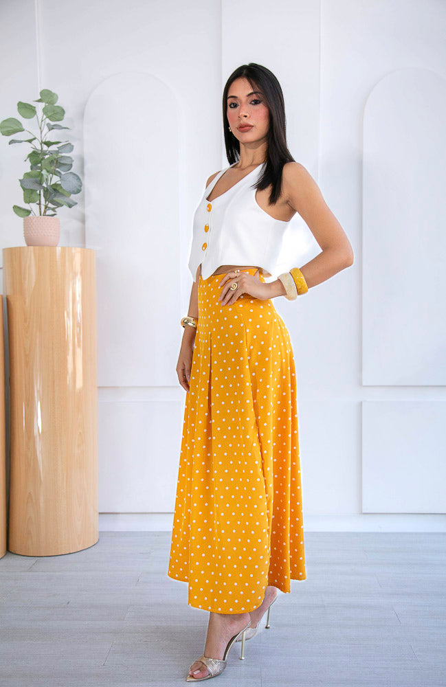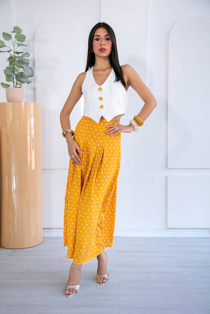 Un conjunto que enamora a primera vista. Set 2 de piezas, en tonos blanco y amarillo mostaza con estampado de polkadots blancos, una combinación clásica que vuelve con fuerza cada temporada aportando personalidad a la prenda.