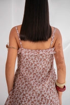 Daisy Jones un diseño fluido y ligero, confeccionado en gasa, con un delicado estampado floral en matices tierra, creando un efecto elegante y femenino. Sus tirantes delgados, junto a los volantes en el escote y a lo largo del frente, aportan movimiento y un aire romántico.