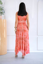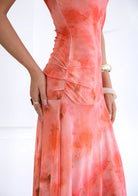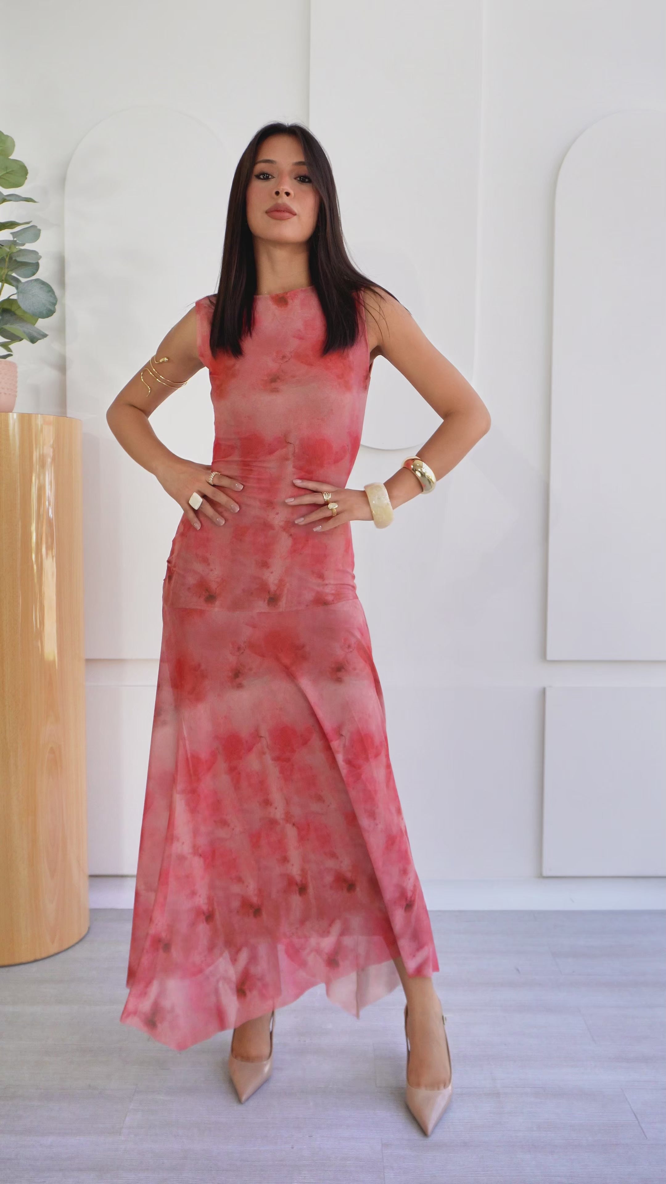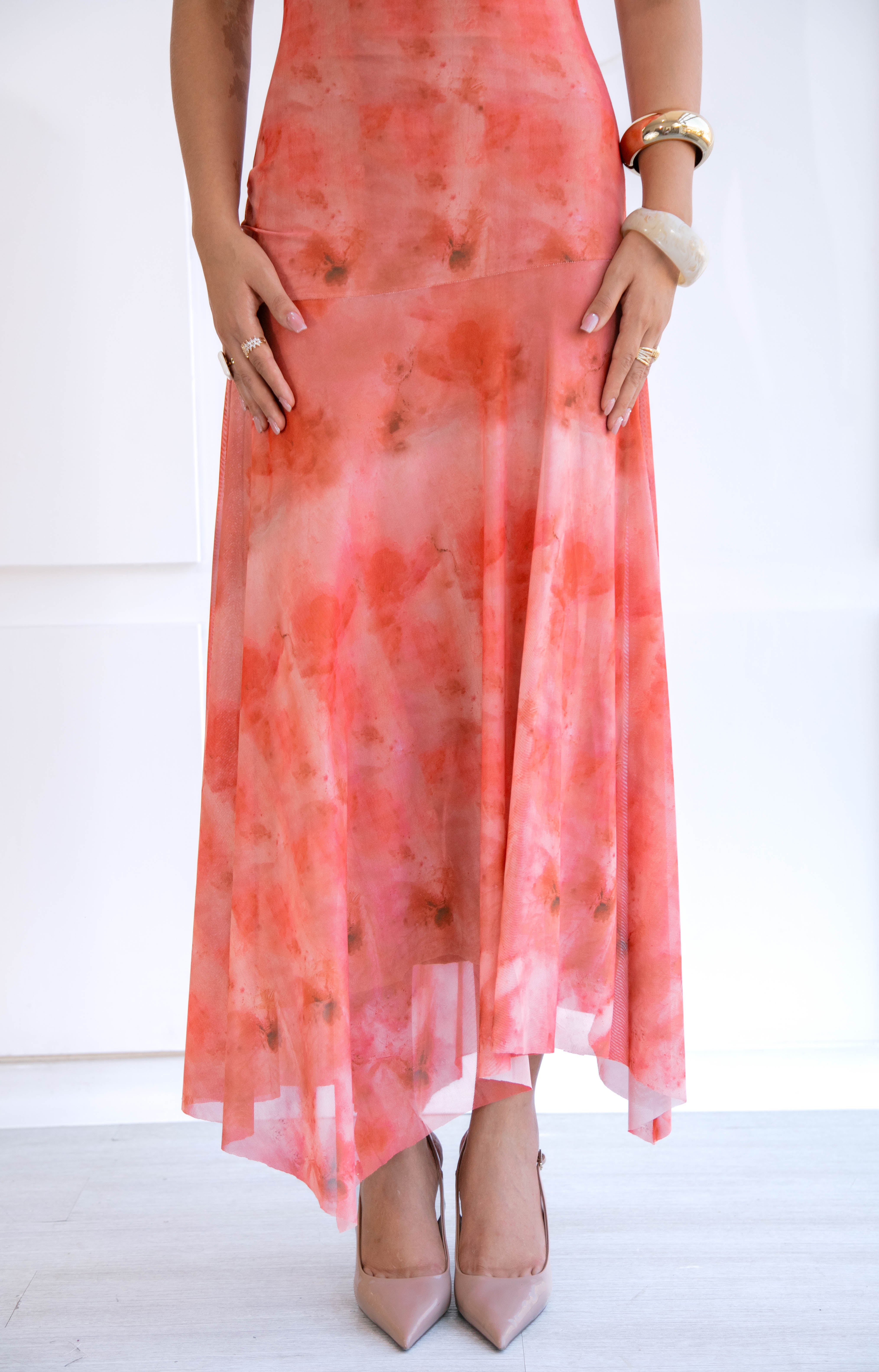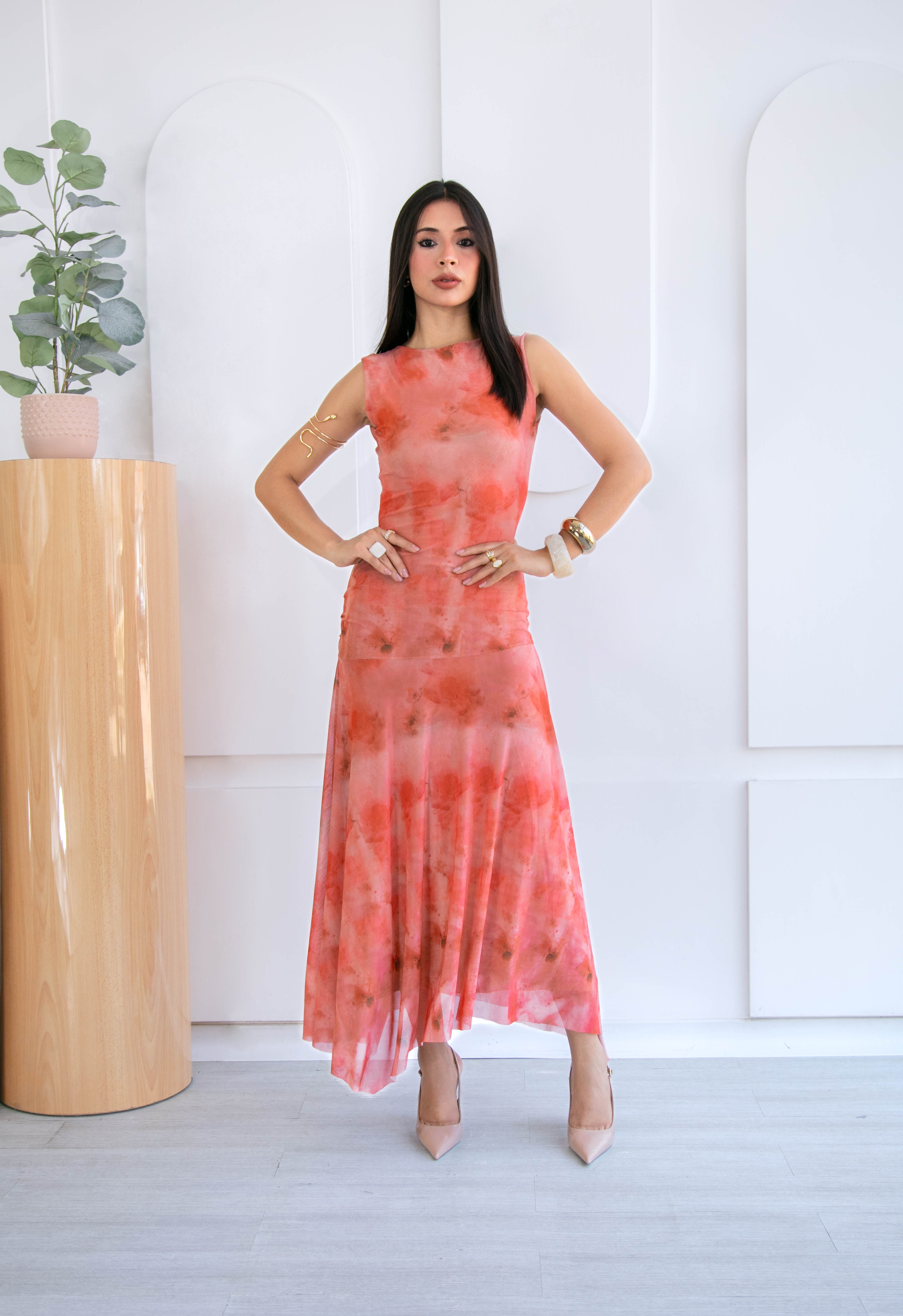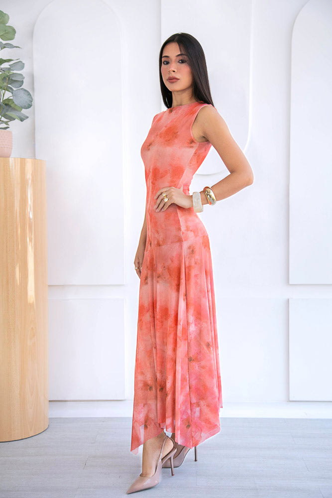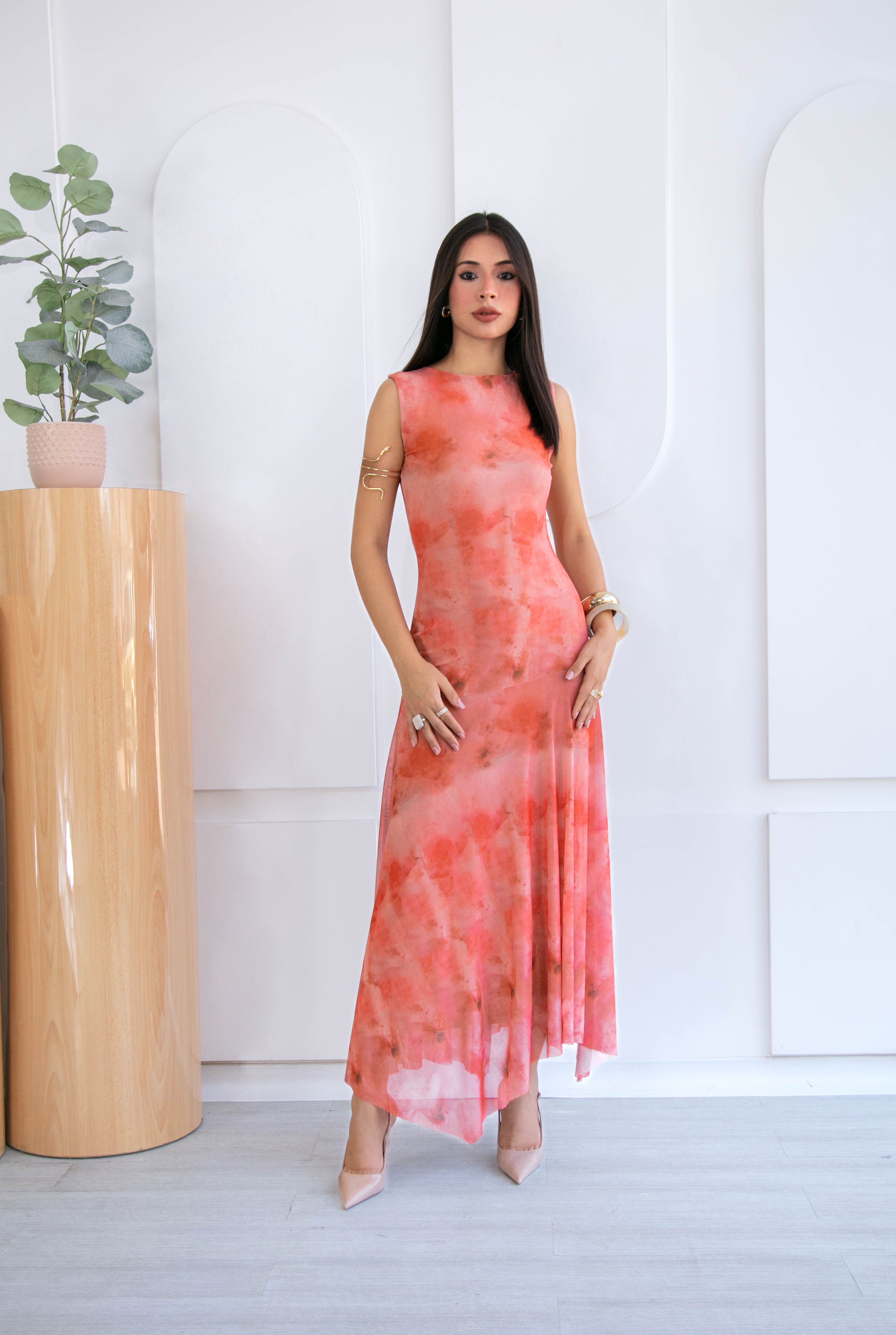 Su base en tono coral con efecto tipo tie-dye o degradado, donde se mezclan matices suaves de rosa y naranja, creando una paleta armoniosa y elegante. De silueta fluida y caída ligera, el diseño sin mangas estiliza el torso, mientras que la falda con transparencias sutiles añade un toque romántico.