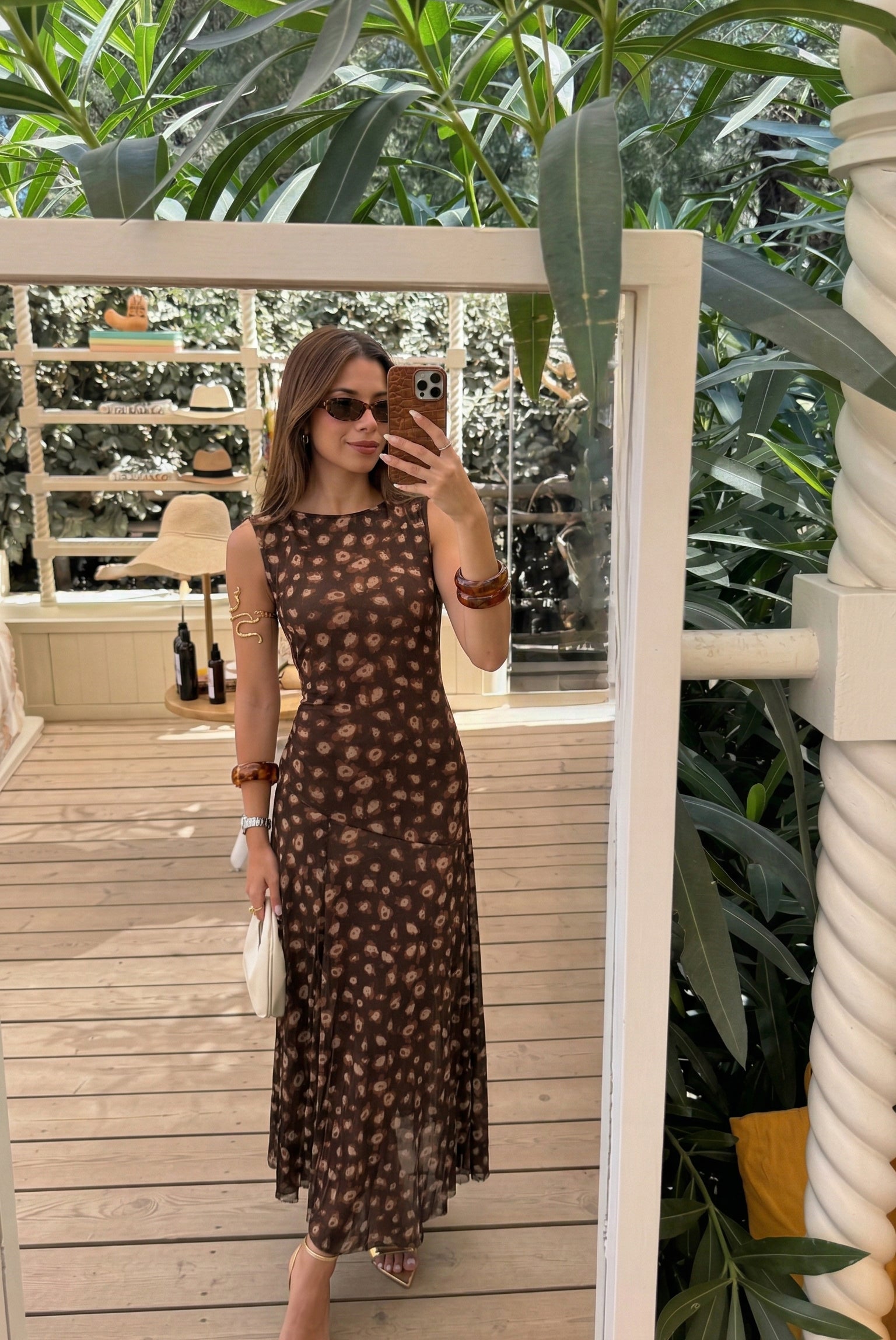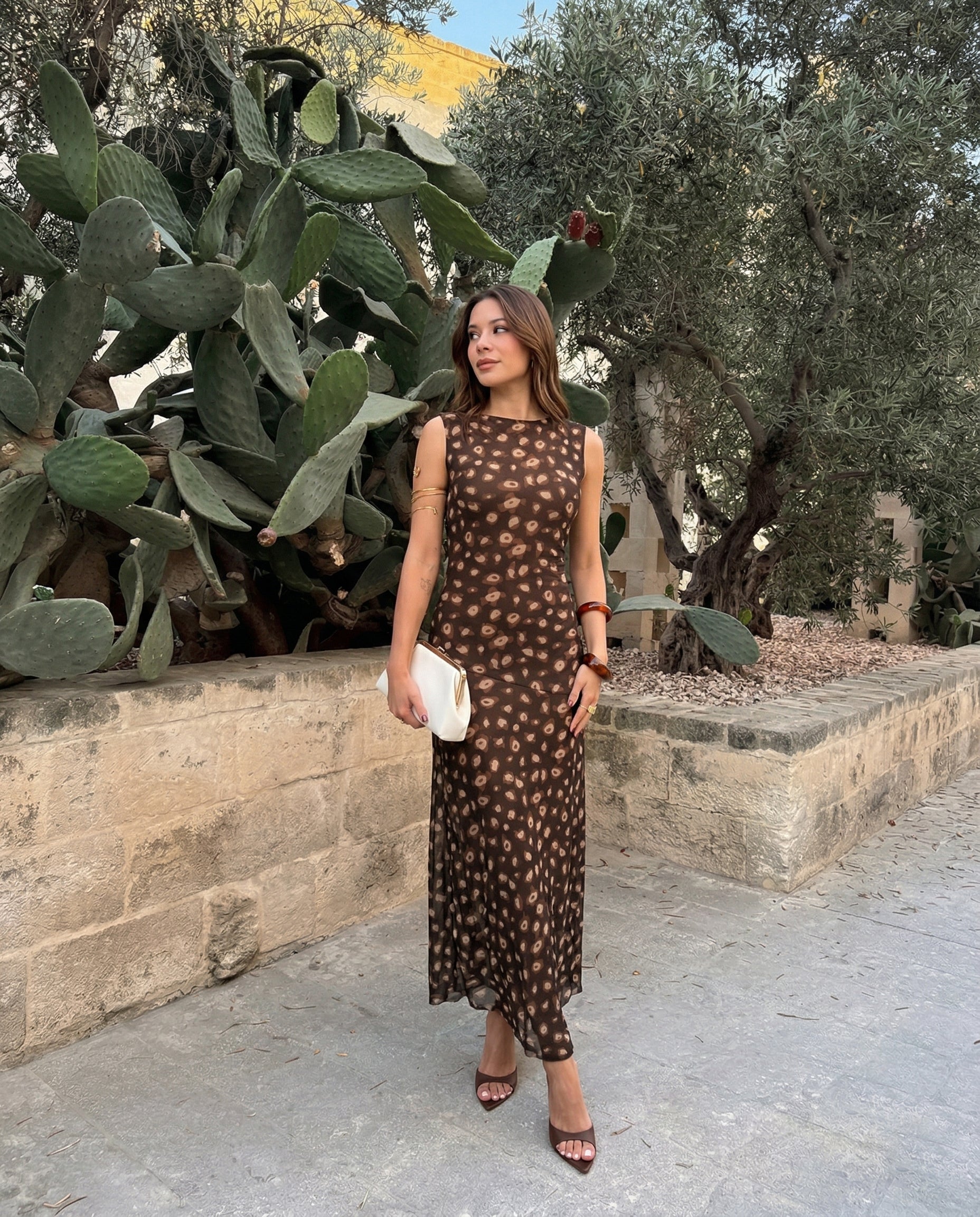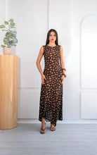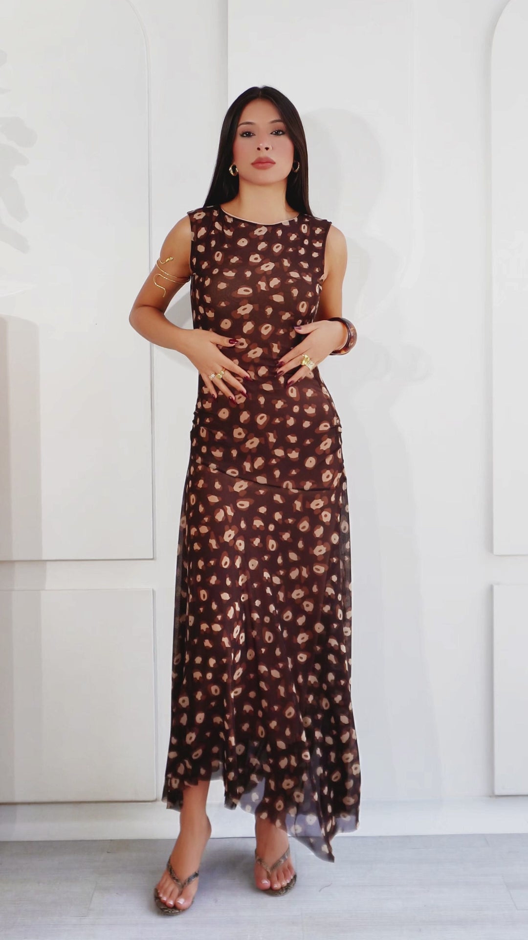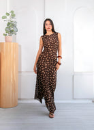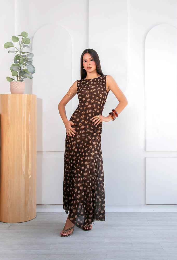 Su base en tono marrón profundo se combina con un estampado orgánico en matices beige y tierra, creando una paleta armoniosa y elegante. De silueta fluida y caída ligera, el diseño sin mangas estiliza el torso, mientras que la falda con transparencias sutiles añade un toque romántico.