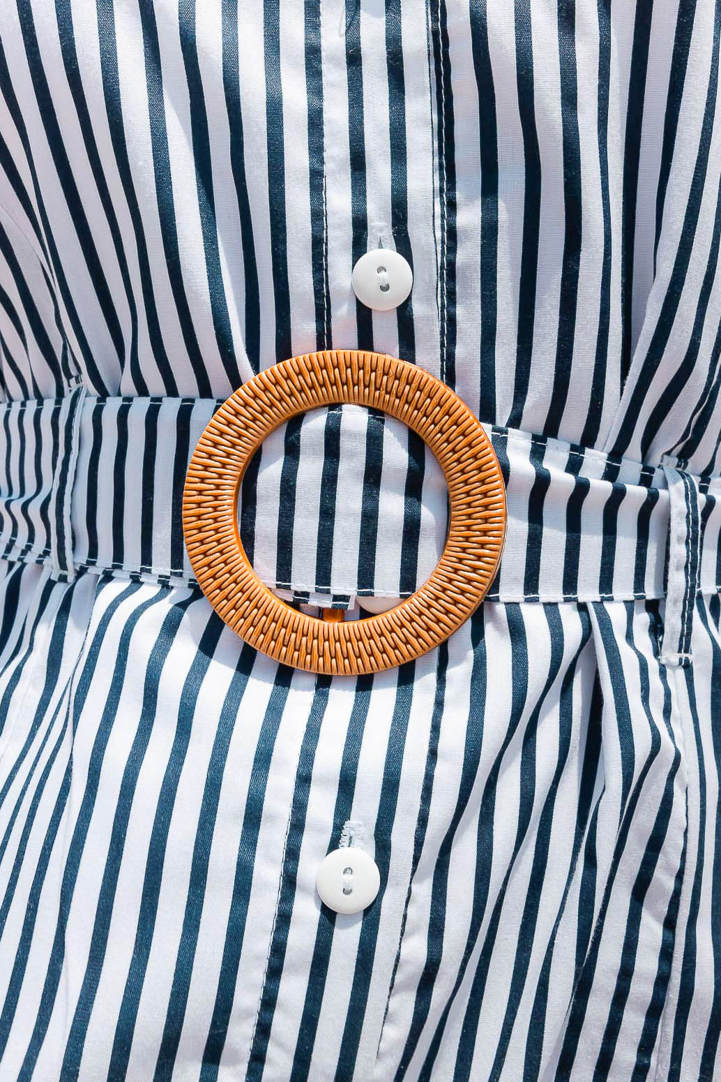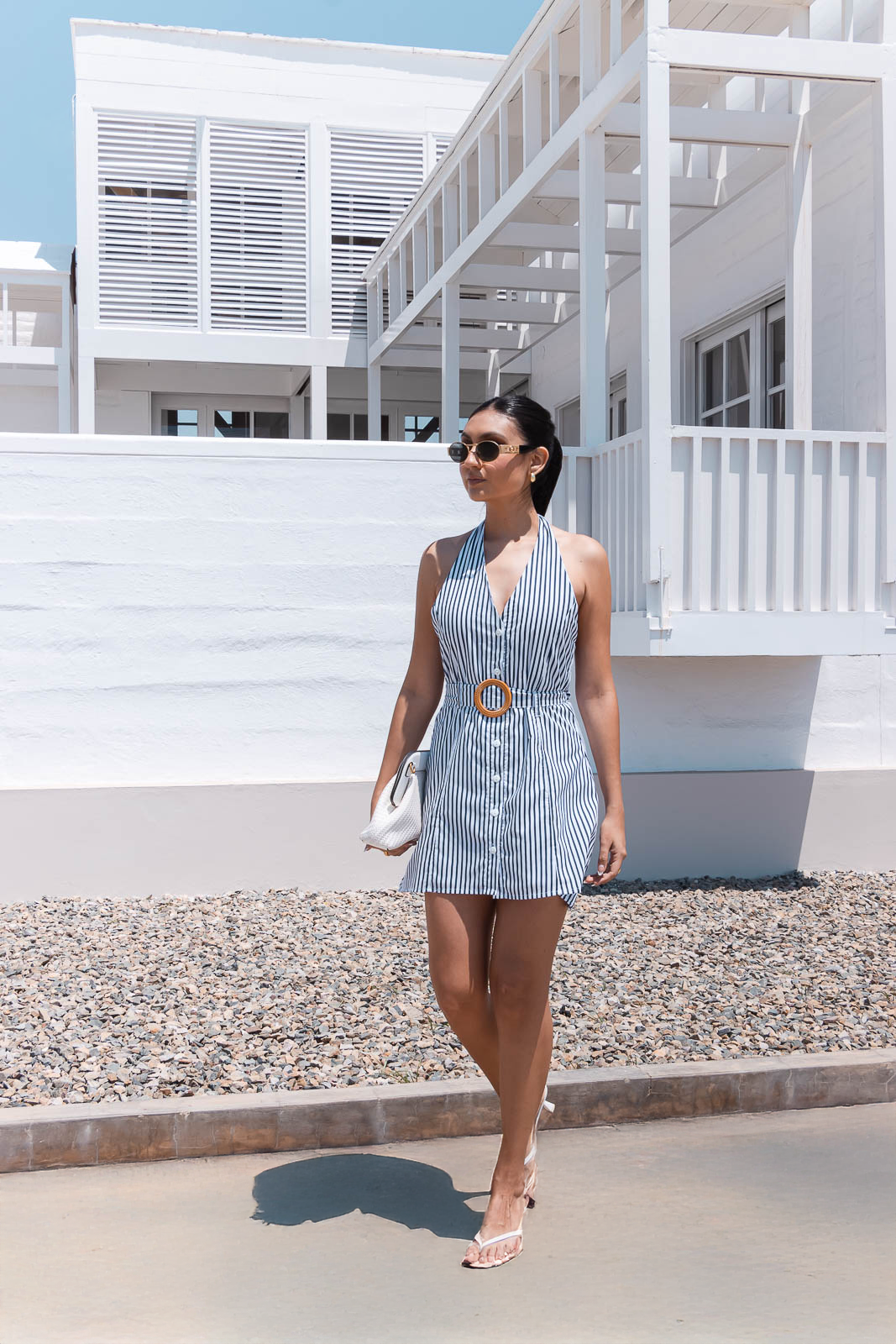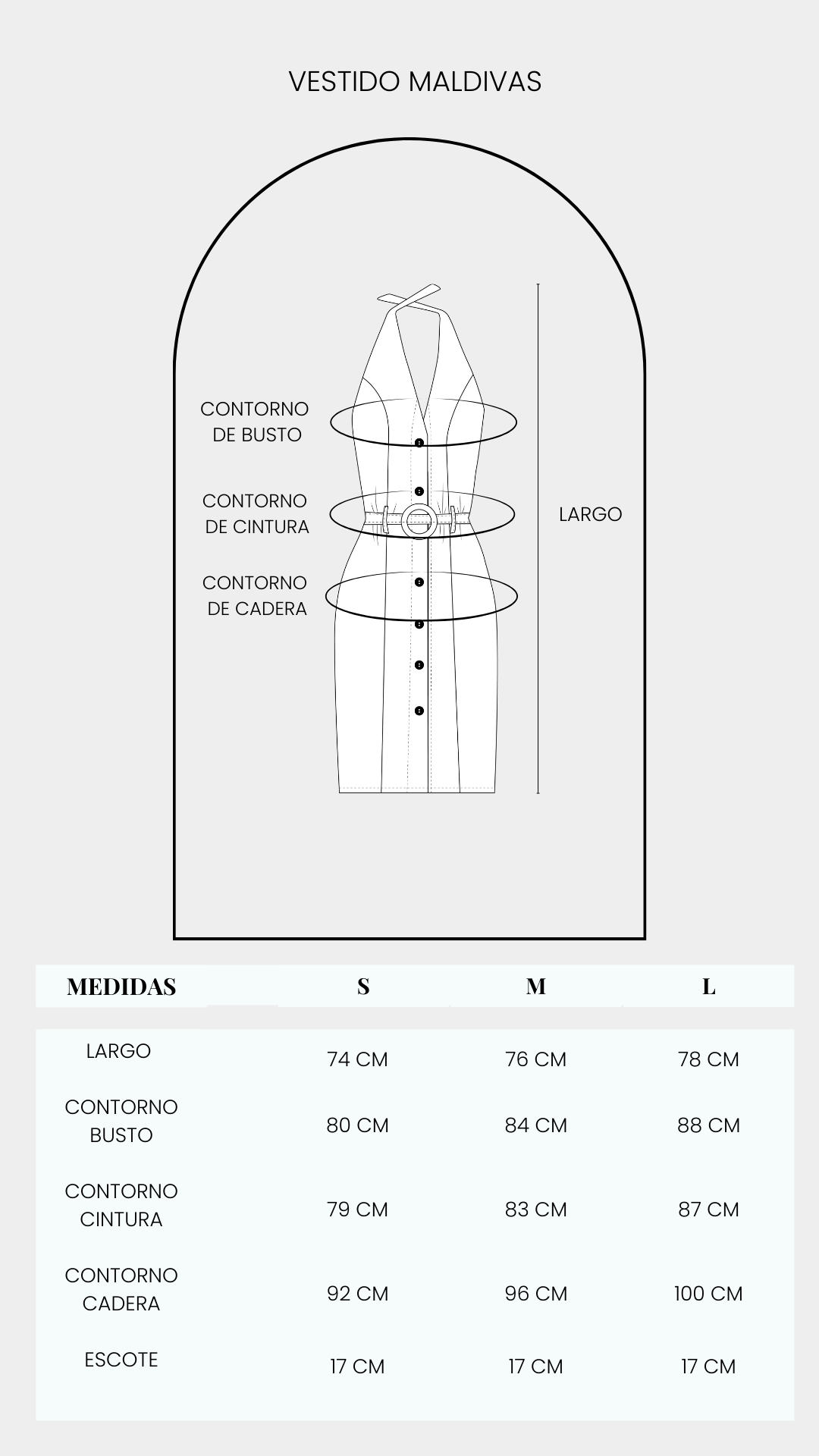 Vestido corto con escote profundo en V y tirantes para amarrar con cinturón del mismo material y detalle de hebilla marrón.