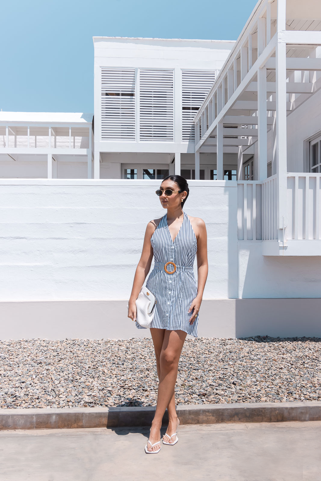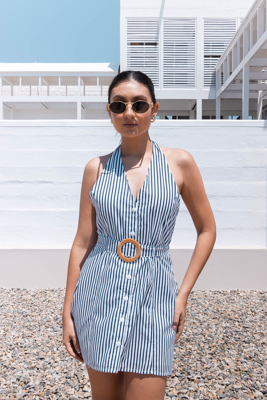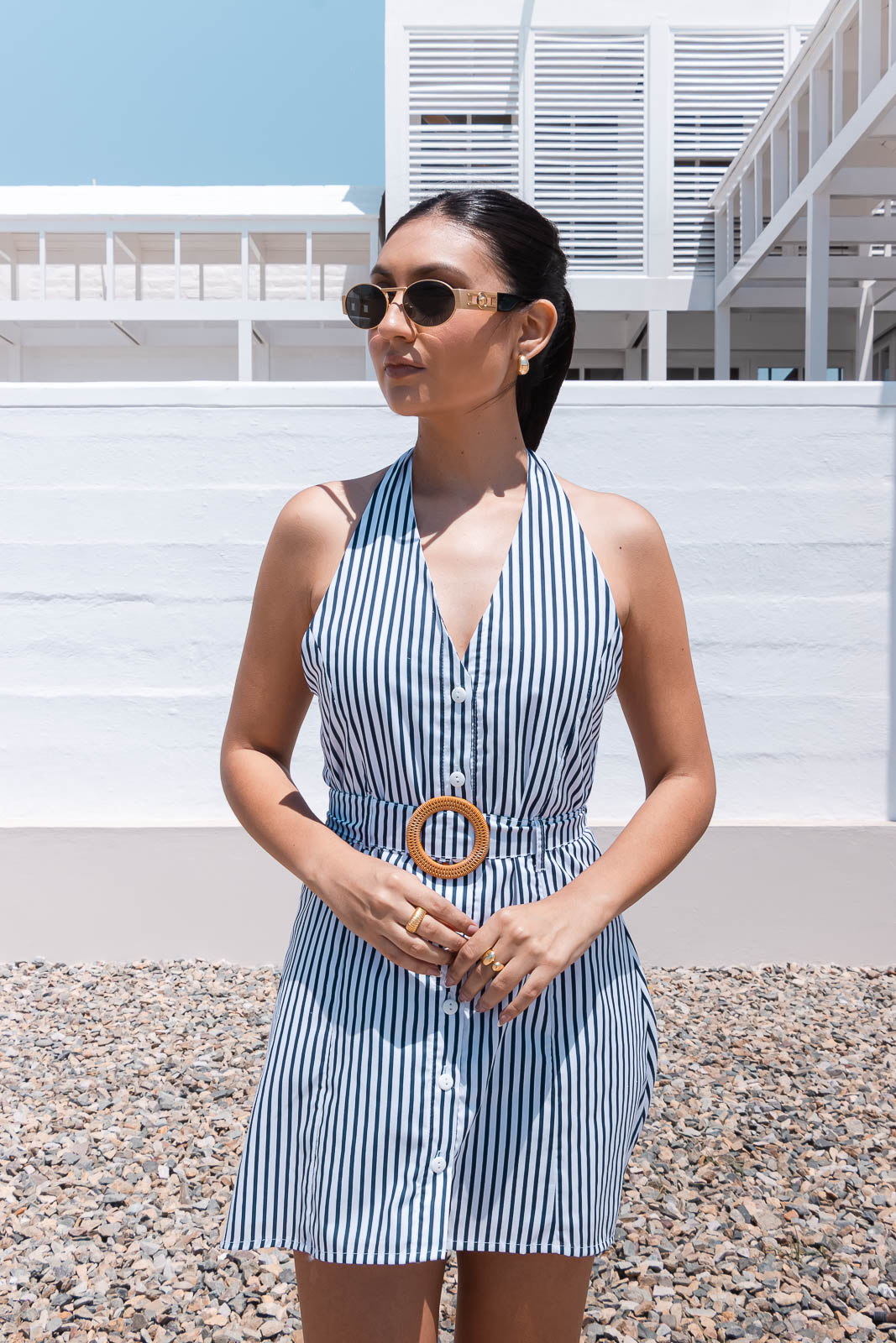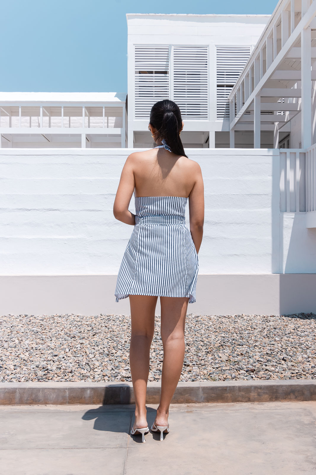 Este vestido corto de rayas verticales en color azul navy es la definición de frescura y estilo para el verano. Con un escote profundo en V y delicados tirantes ajustables para amarrar, combina sensualidad y comodidad en un solo diseño. Ideal para días de playa, salidas casuales o incluso una cita relajada. Combínalo con sandalias o flats, un sombrero y un bolso tejido para un look veraniego impecable.