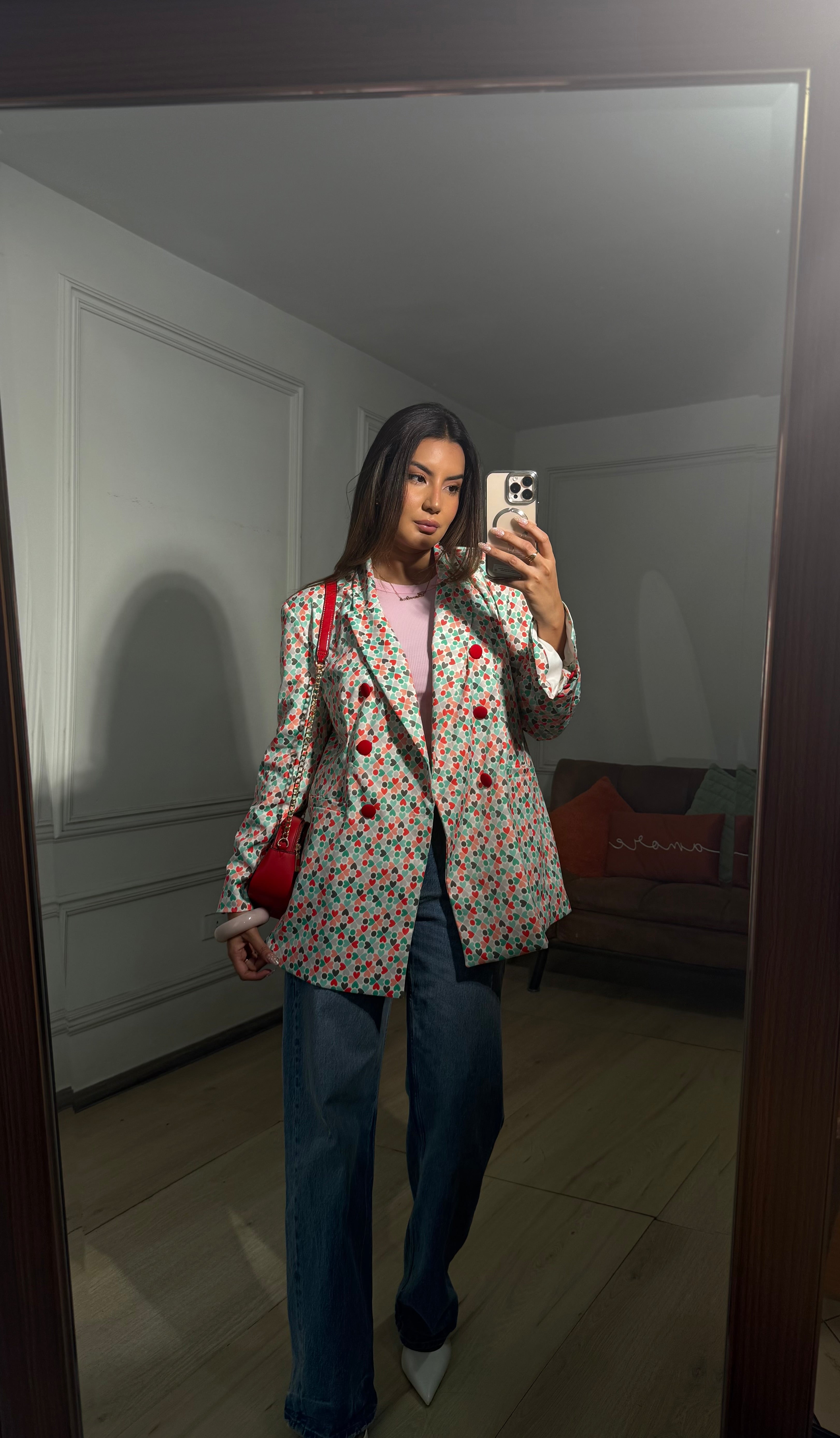 Fit oversized le da un aire moderno sin perder estructura. Los botones rojos añaden un toque de carácter, haciendo que esta pieza destaque por sí sola.