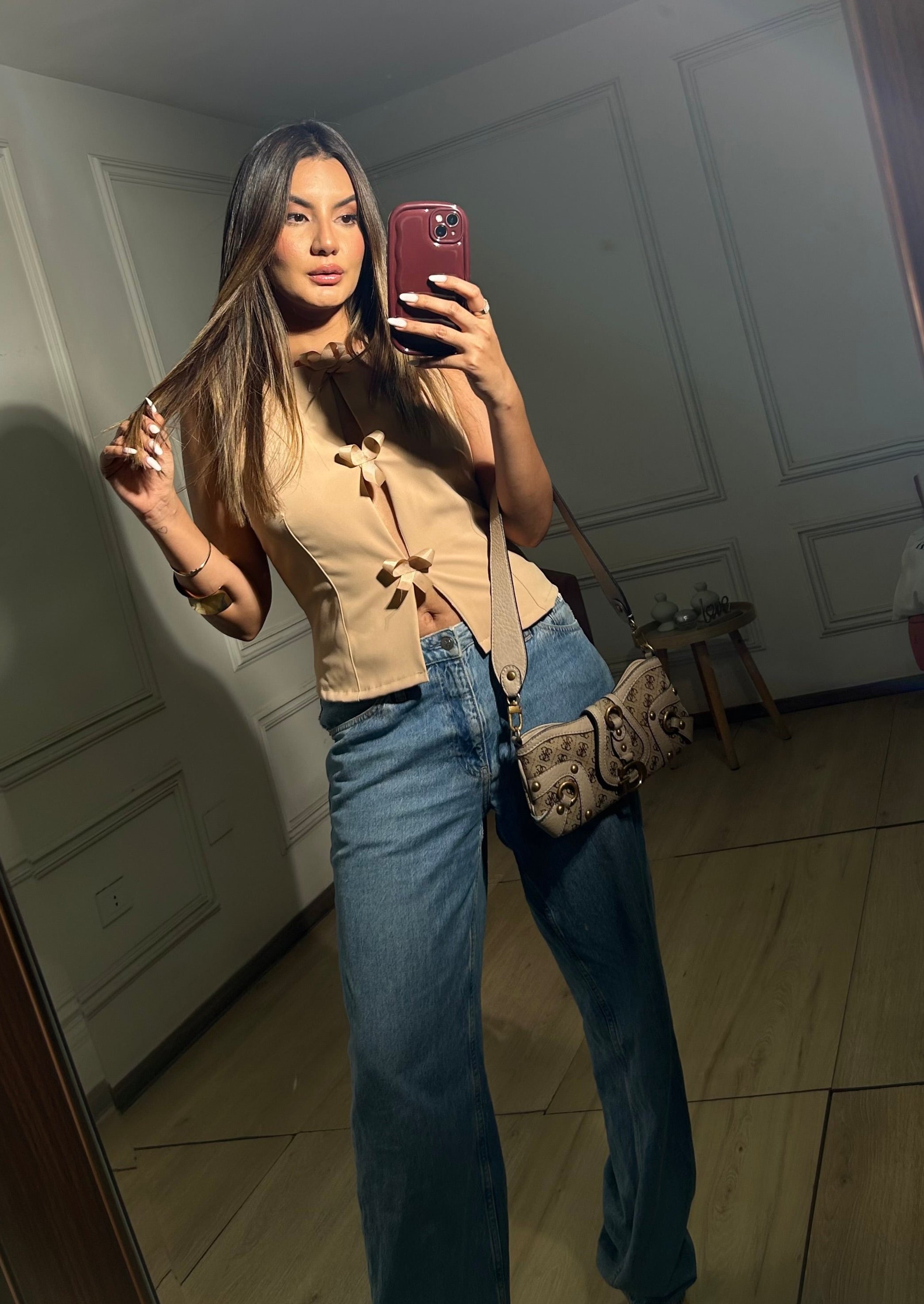 Blusa de manga 0 con detalle de lazos en el centro añaden un toque romántico y femenino. Se convertirá en tu aliado por su color elegante y atractivo, ideal para eventos de día, brunch con amigas o una salida casual chic, este conjunto es versátil y atemporal.