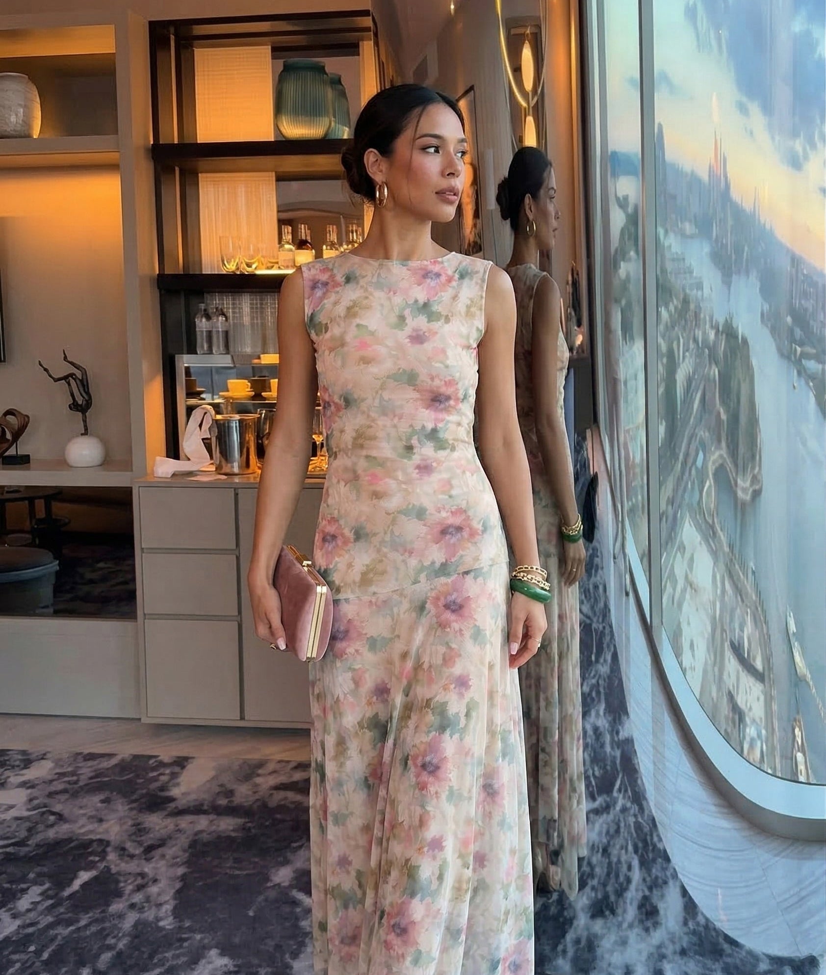 El estampado floral en tonos suaves como beige, rosa empolvado, verde y toques sutiles de lila, creando una paleta armoniosa y elegante. De silueta fluida y caída ligera, el diseño sin mangas estiliza el torso, mientras que la falda con transparencias sutiles añade un toque romántico.