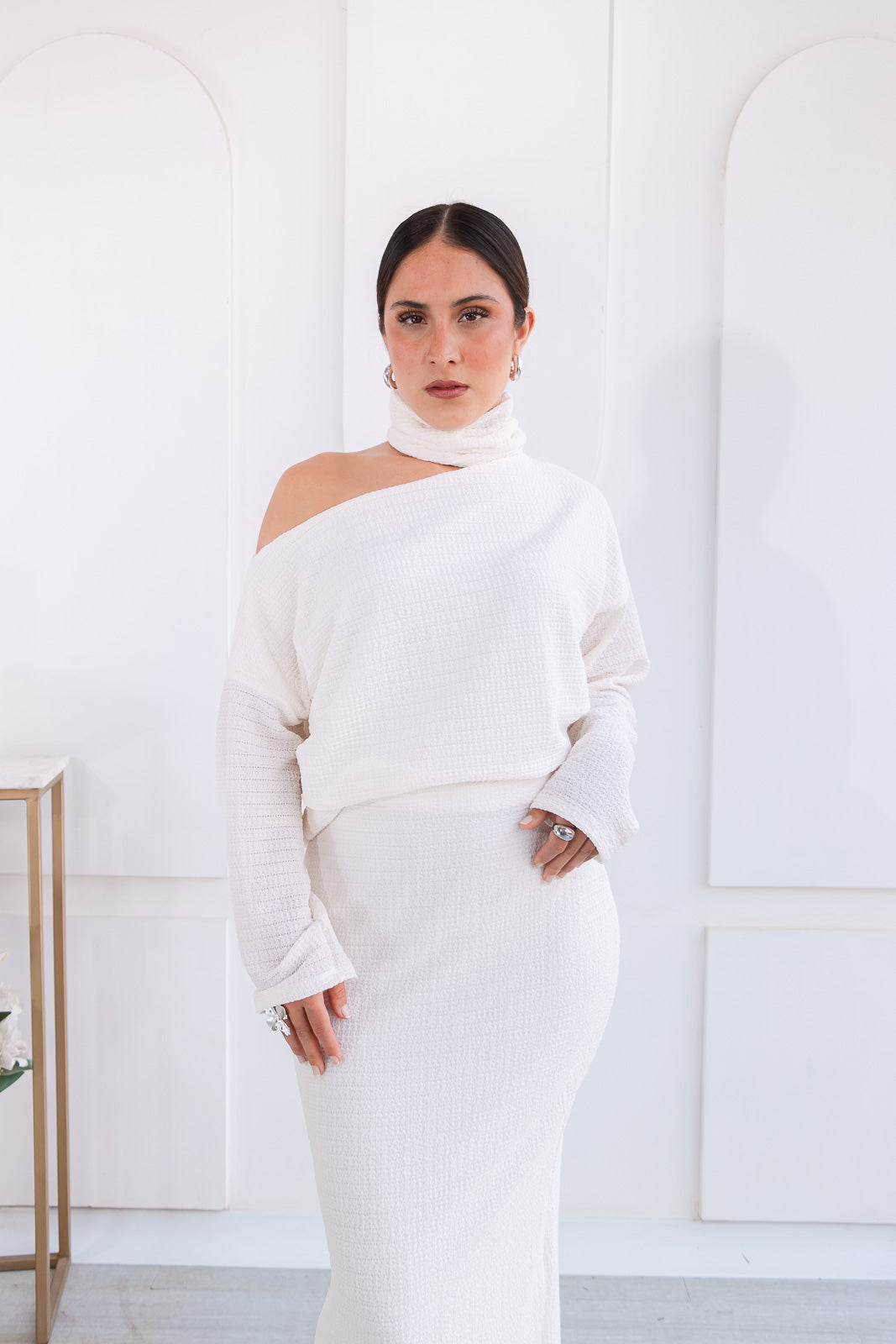 Chompa Camilla con un diseño asimétrico que deja un hombro al descubierto y cuello alto, esta blusa logra el balance perfecto entre sensualidad y sofisticación. Su tejido texturizado y suave la hace cómoda y ligera, ideal para combinar con pantalones de tiro alto, rectos o wide leg, creando looks que estilizan la figura y aportan un aire moderno.