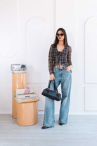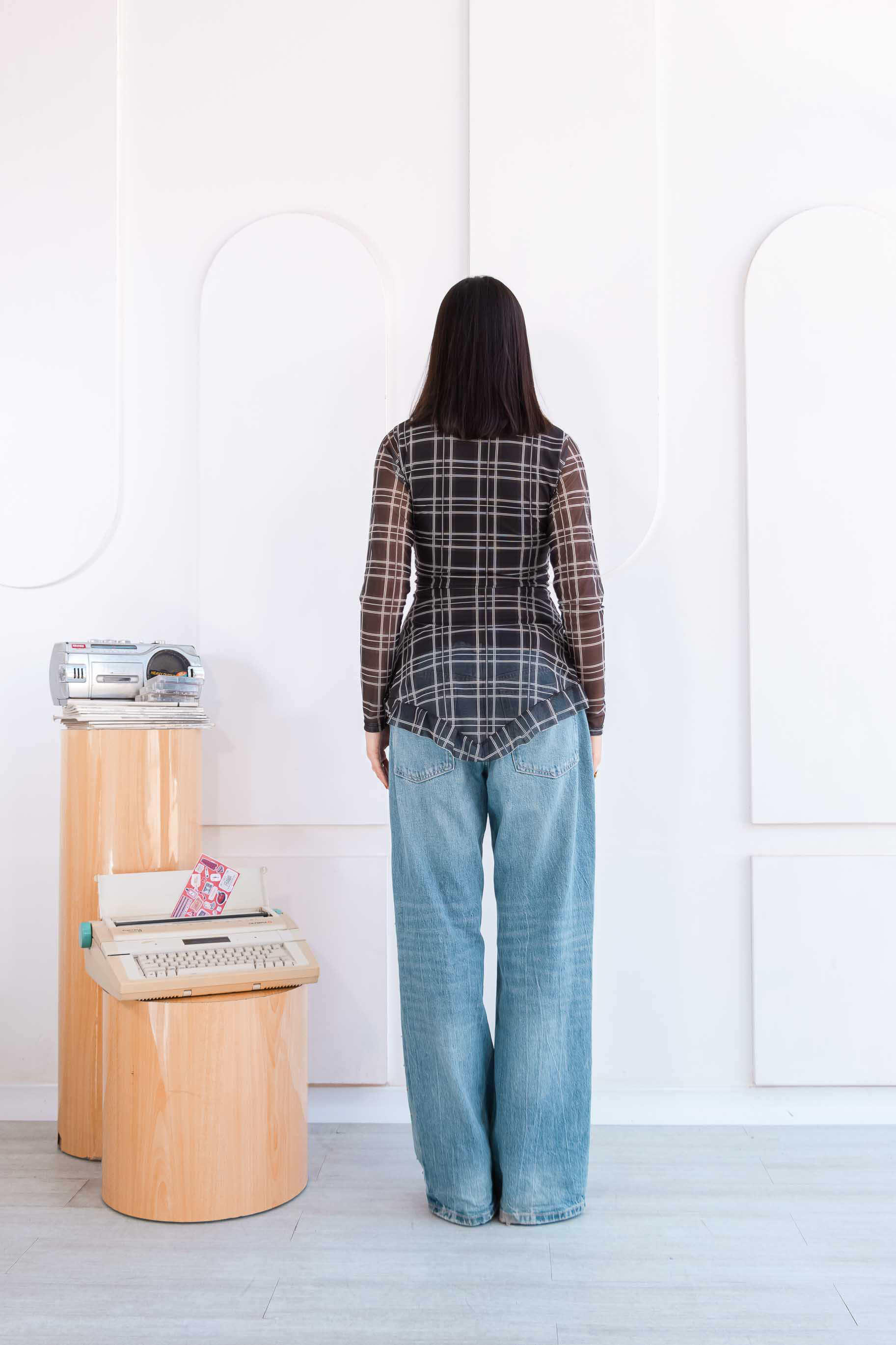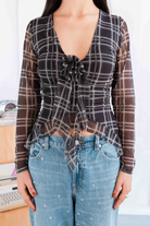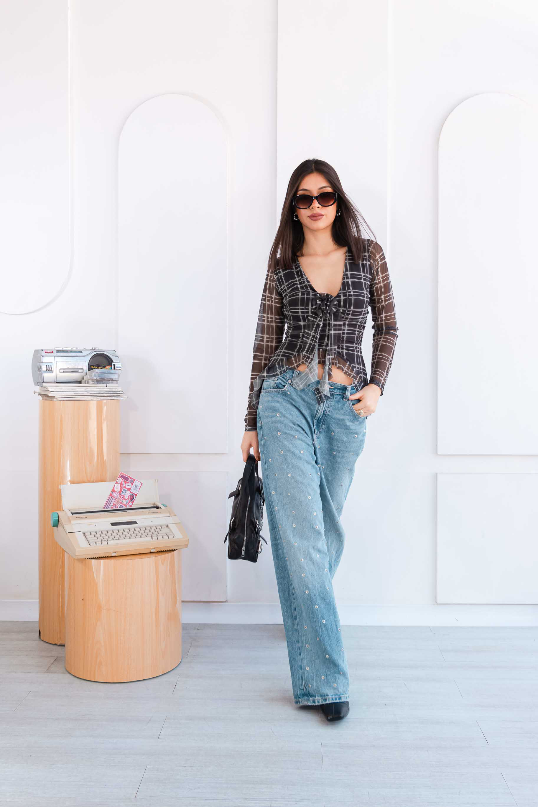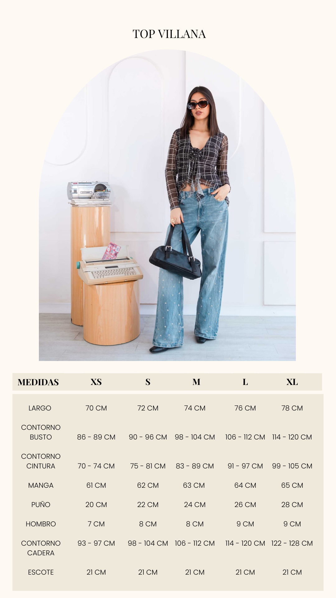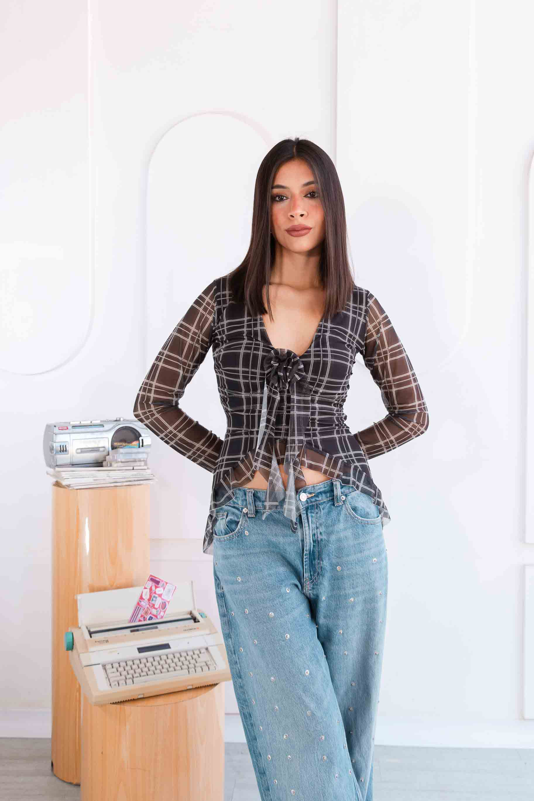 Villana destaca por su estampado en tono negro tartán, su escote en "V" profundo, adornado con un detalle de flor central elaborado a mano, la convierte en una pieza protagonista, mientras que las tiras en el centro añaden un toque coqueto y sutilmente sensual. Las mangas largas de tela ligera y translúcida equilibran el diseño, aportando frescura y elegancia.