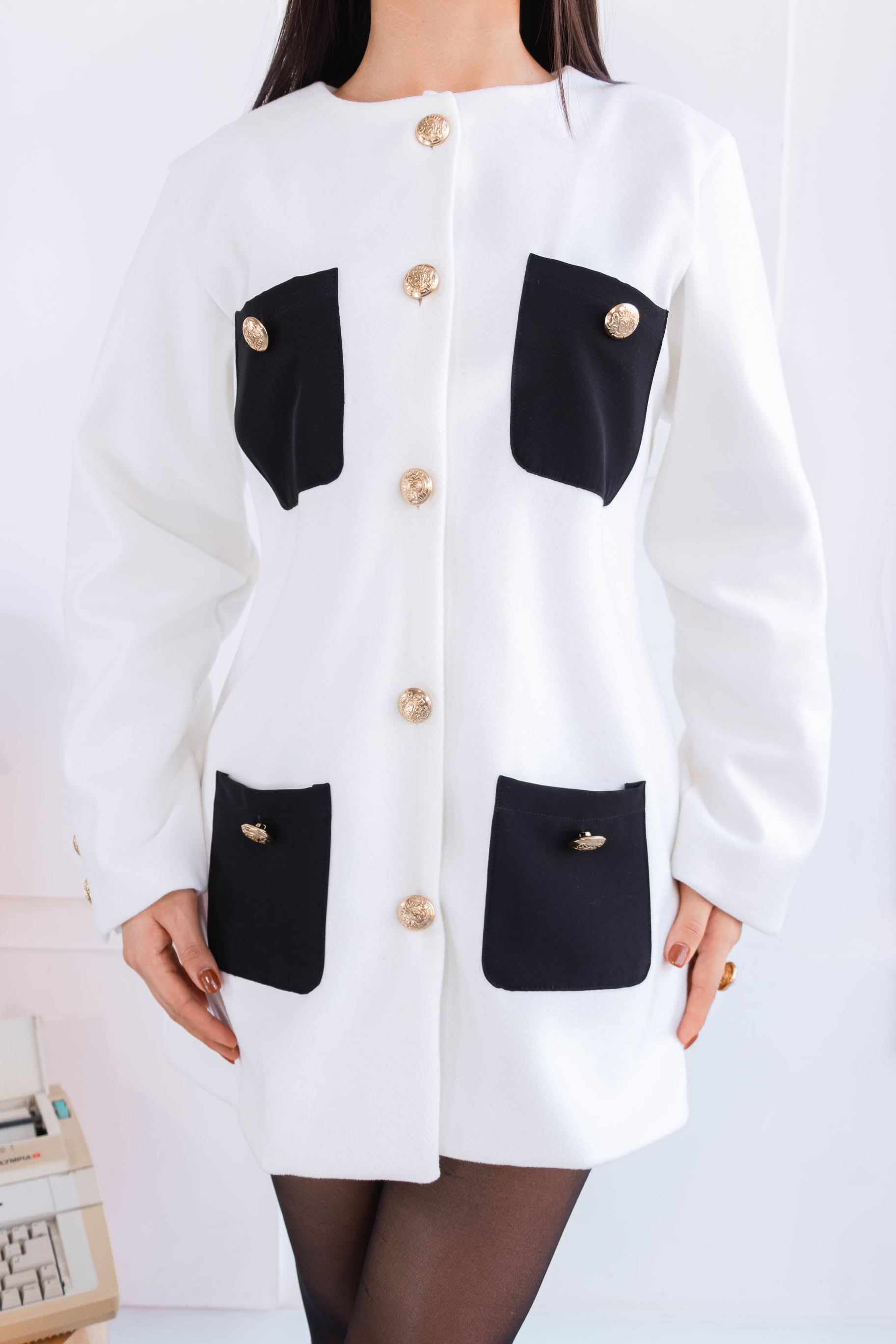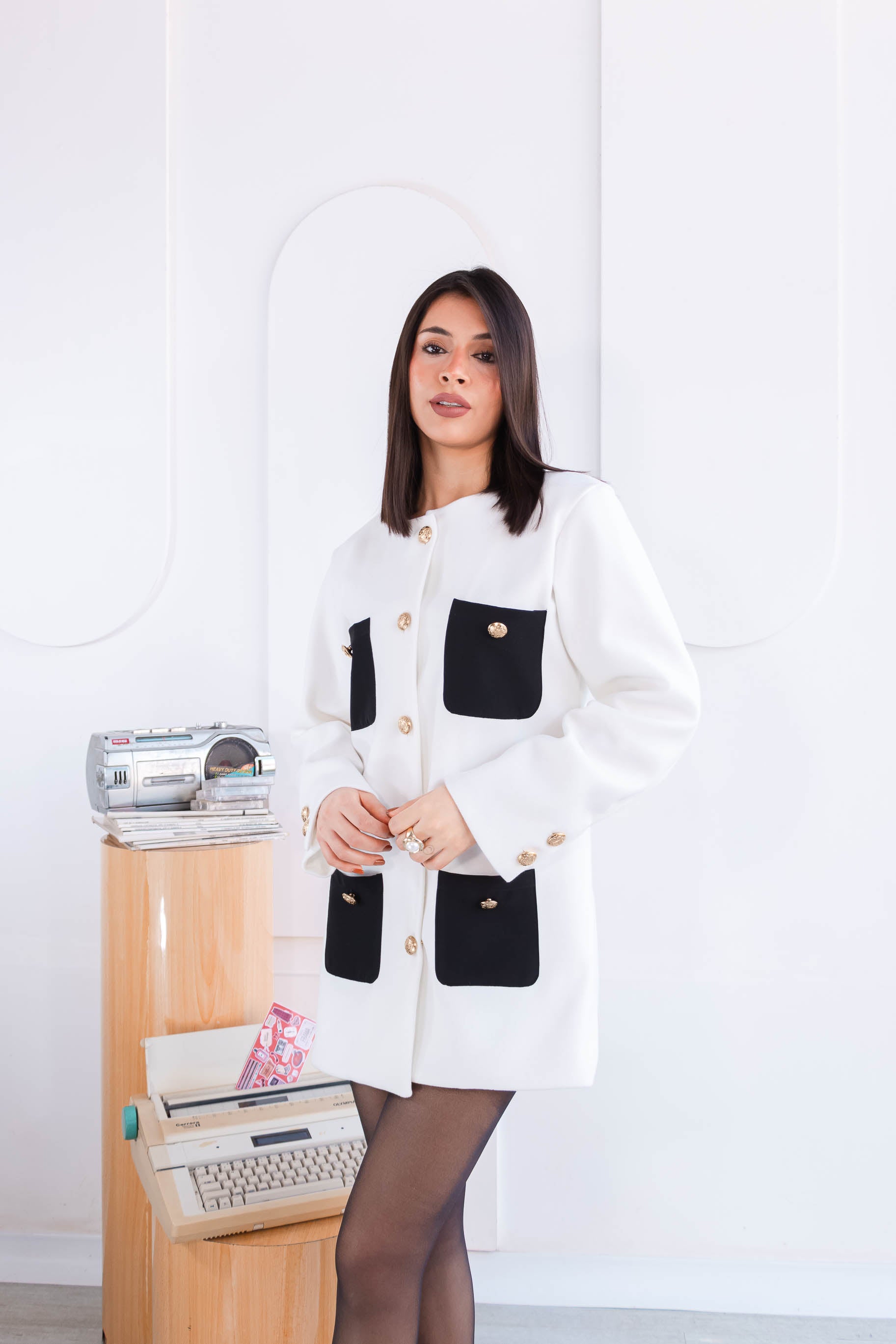 Vestido Meredith combina elegancia clásica con un toque contemporáneo que lo convierte en un imprescindible para ocasiones especiales. Su diseño en blanco puro se realza con bolsillos frontales en contraste negro y botones dorados que aportan sofisticación y un aire de lujo discreto.