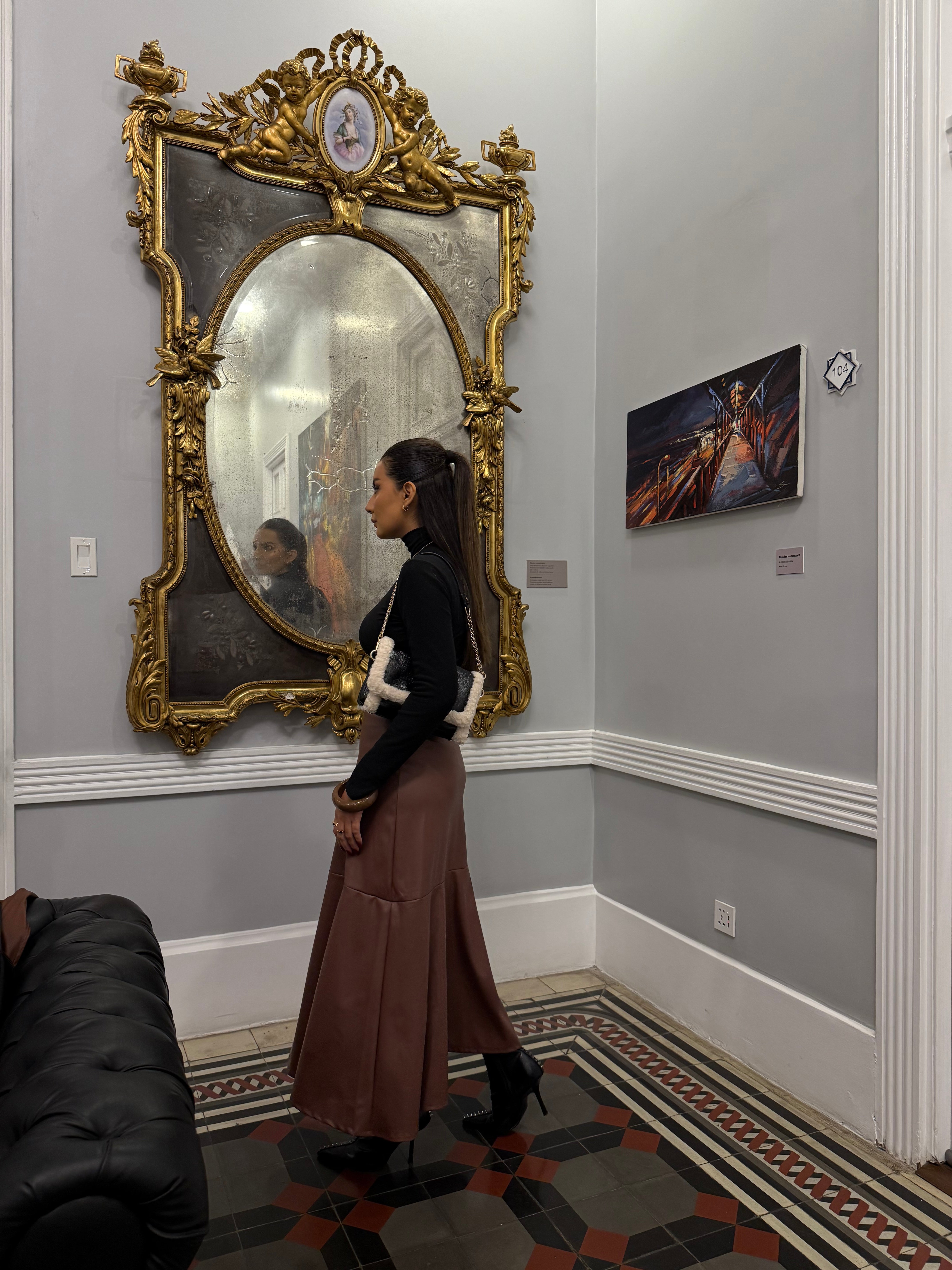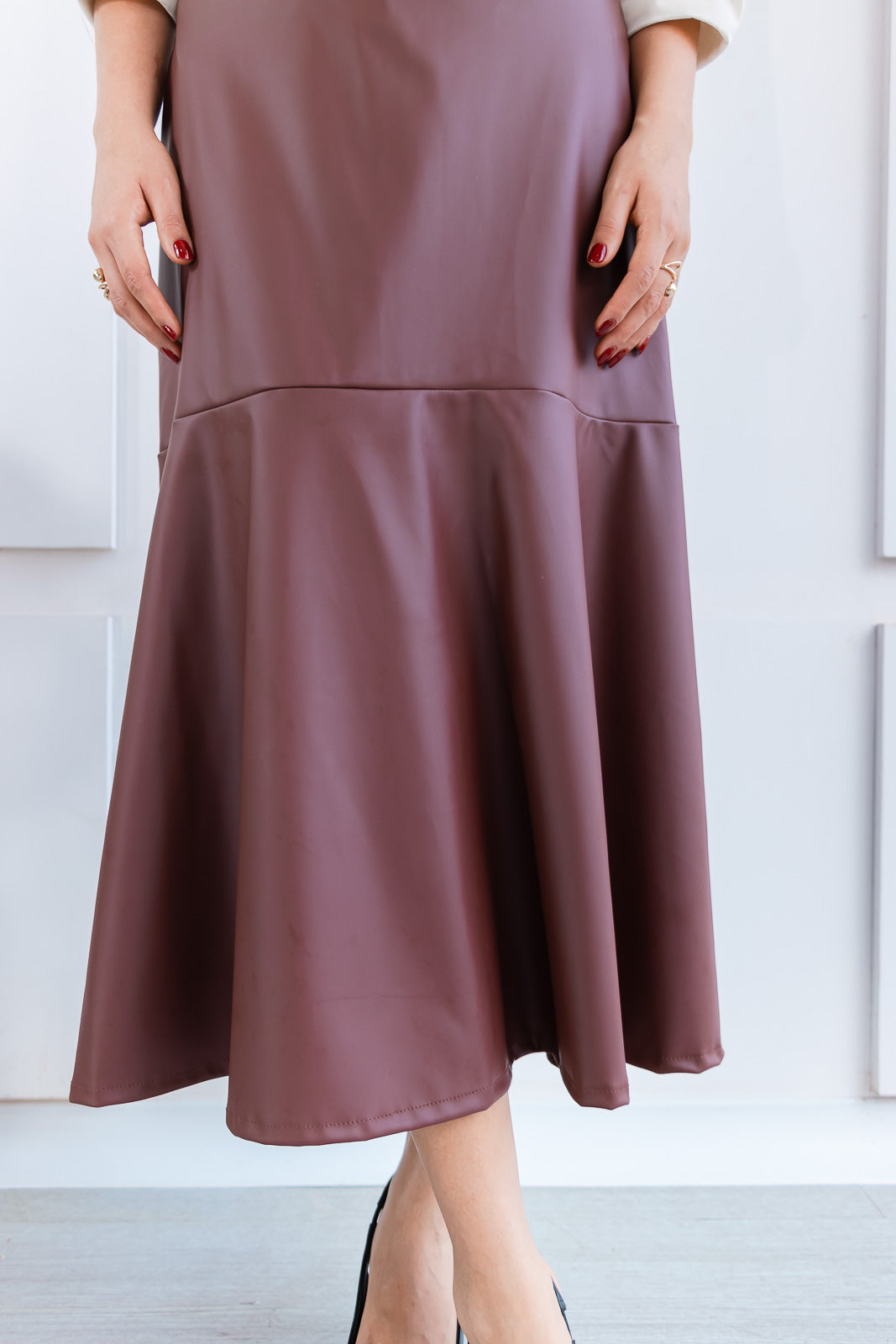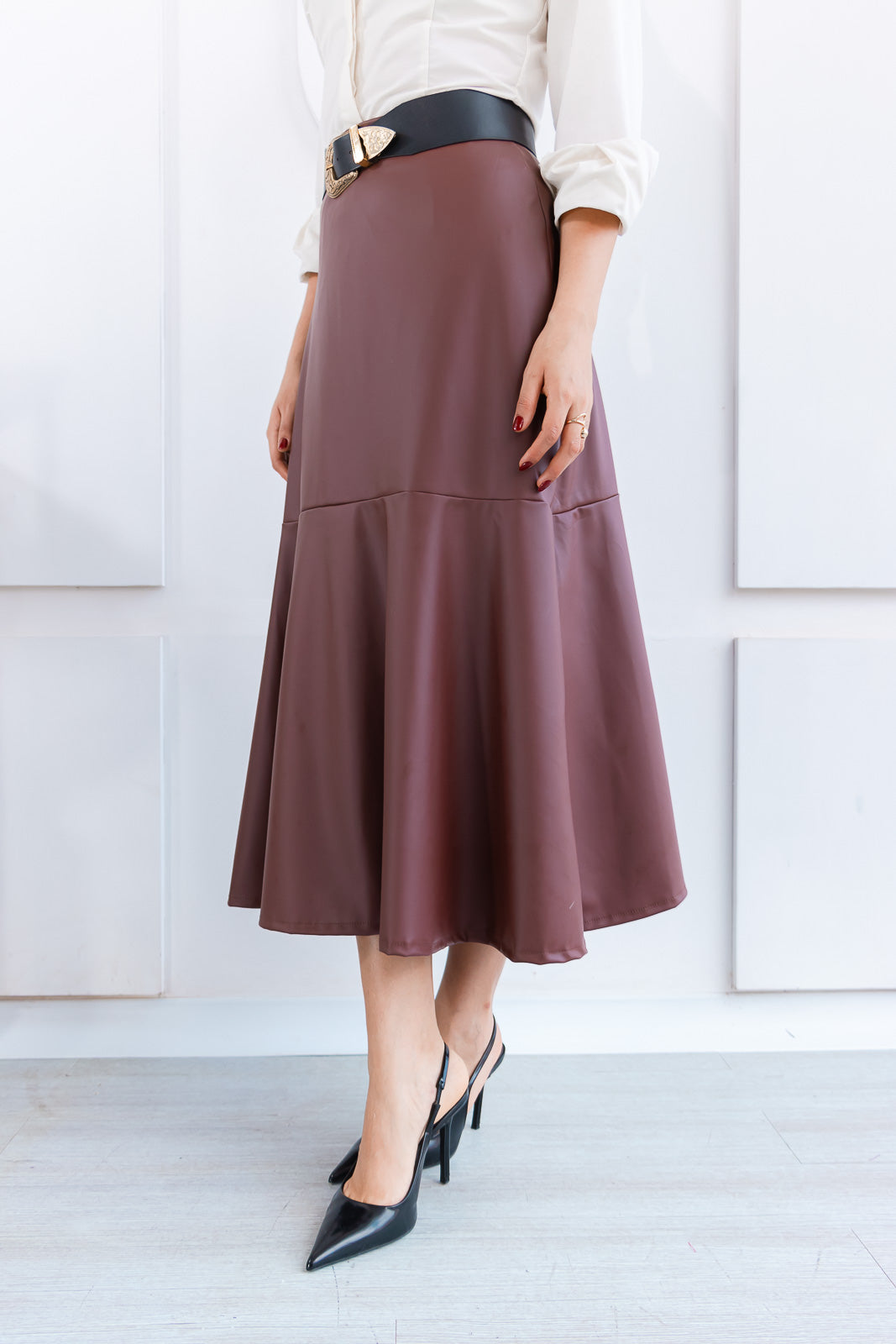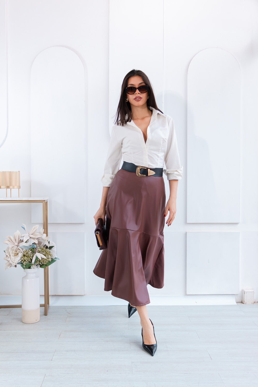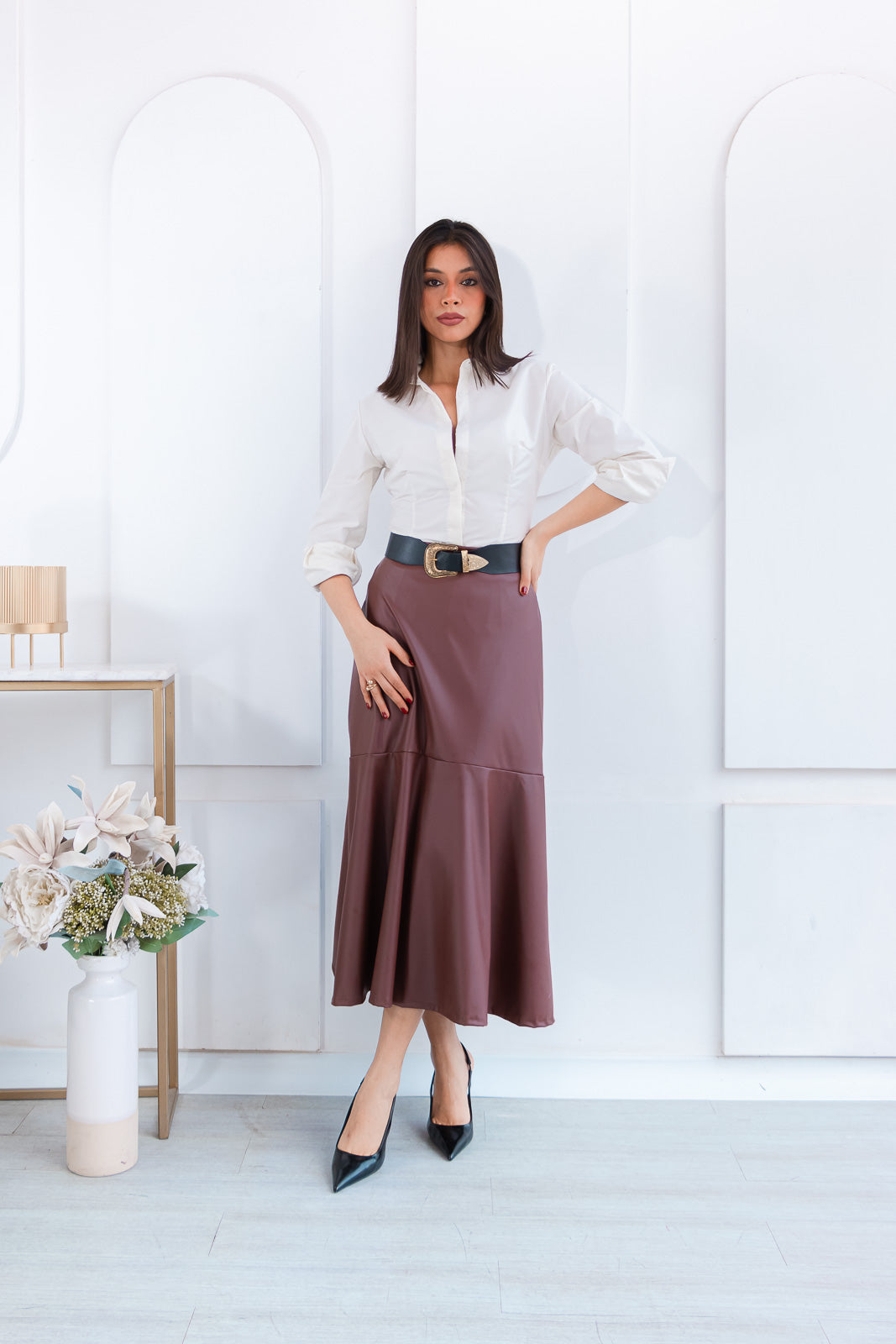 Su color Mocha Mousse es uno de los tonos más sofisticados y en tendencia de la temporada. Su diseño fluido con caída natural y de corte midi la convierte en una prenda versátil para distintas ocasiones.