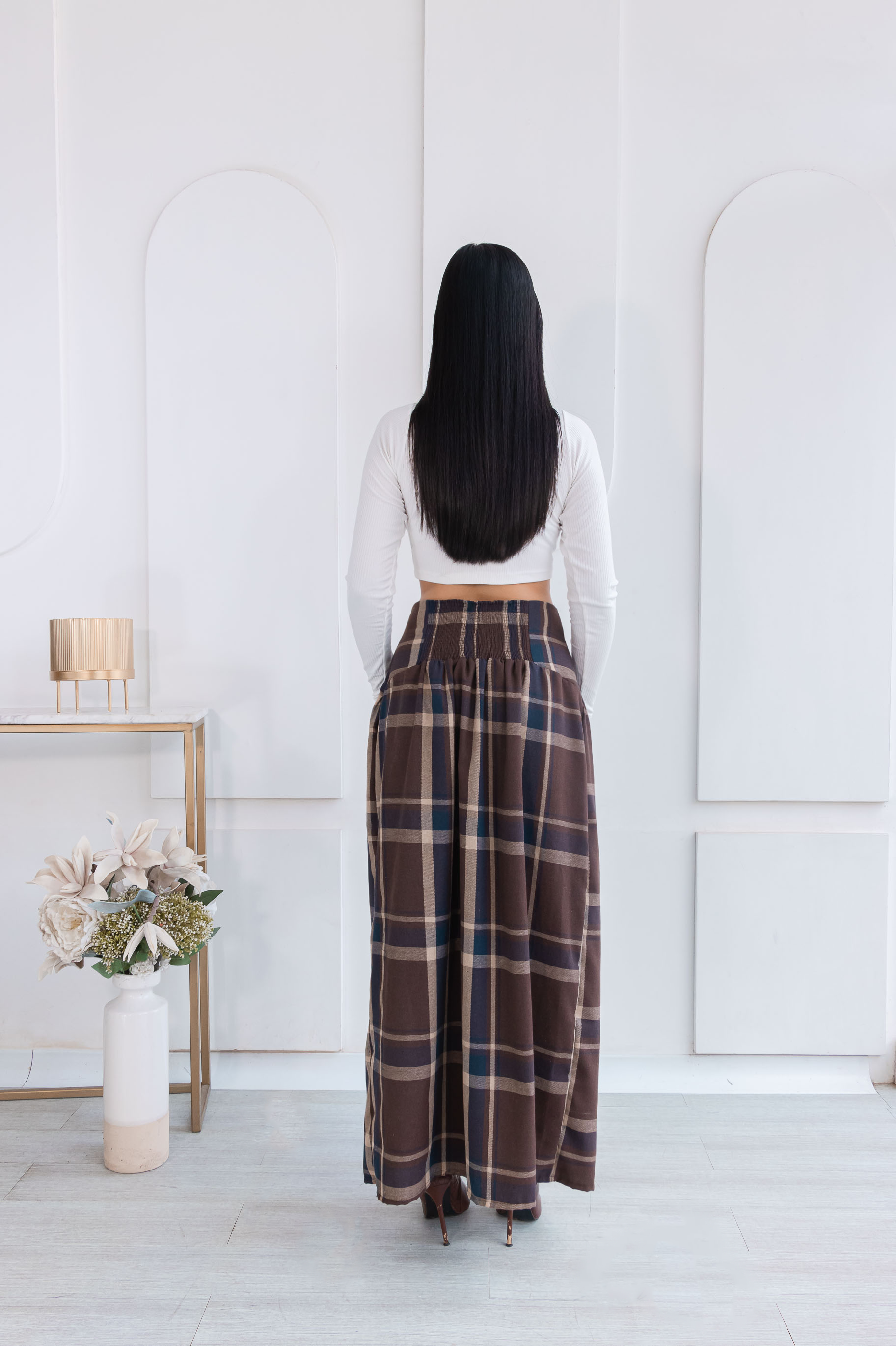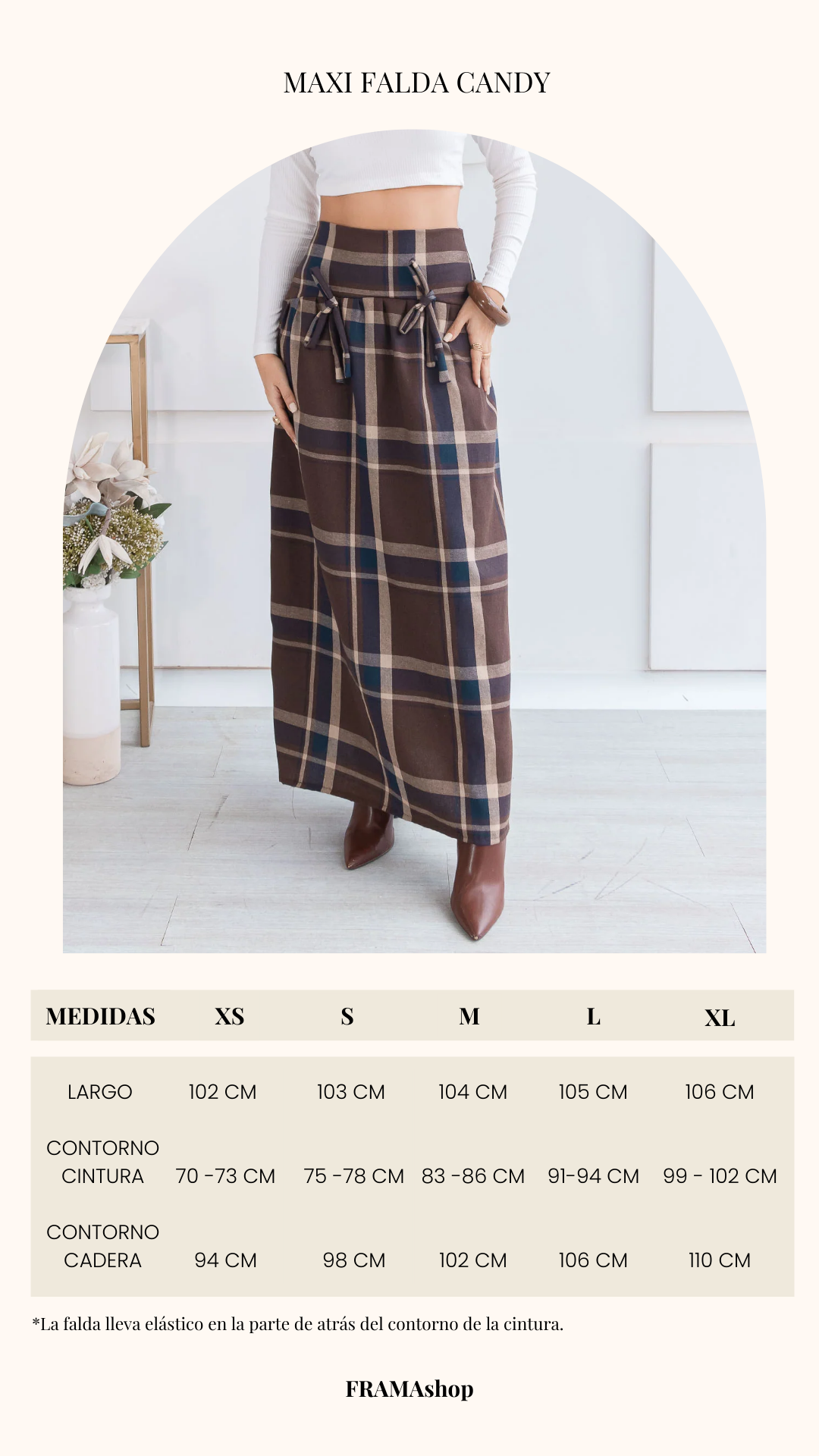 Es por ello, que nuestra falda Candy es más que perfecta para tu armario en estos momentos. Su versatilidad permite crear looks tanto informales como elegantes, adaptándose a diversas ocasiones y estilos. Maxi falda en estampado a cuadros con detalle de elástico en la parte trasera para mayor comodidad y corte en A.