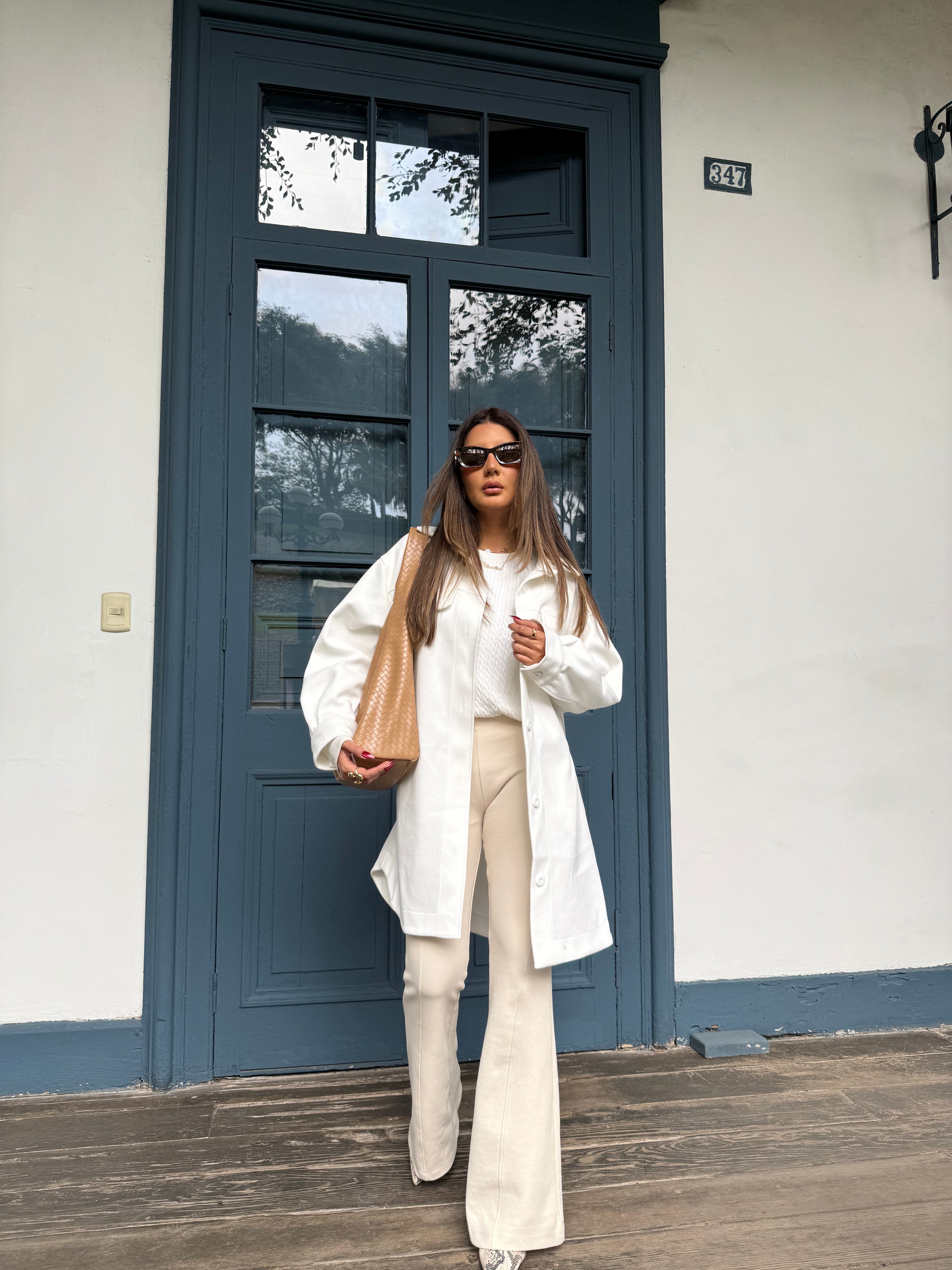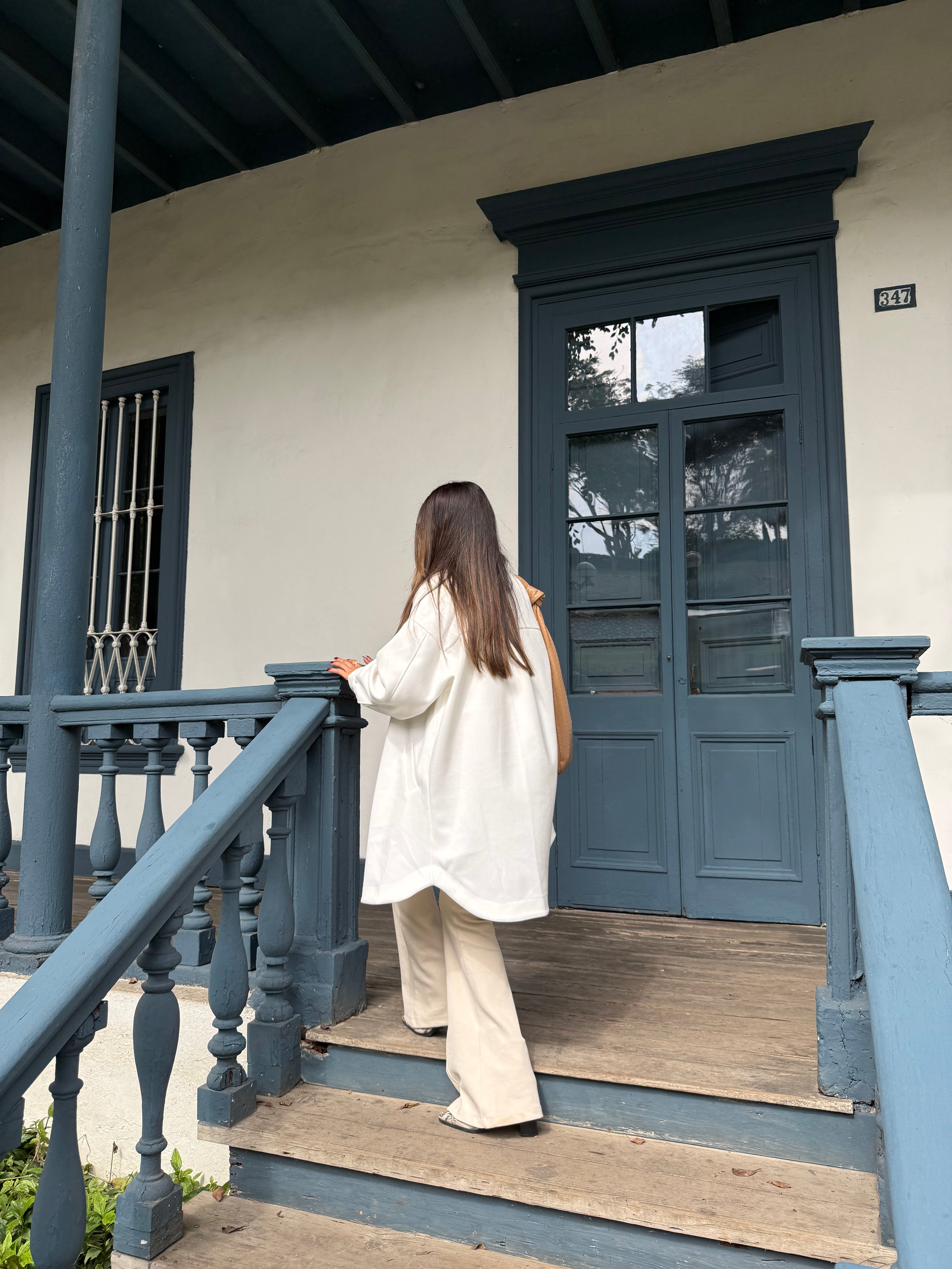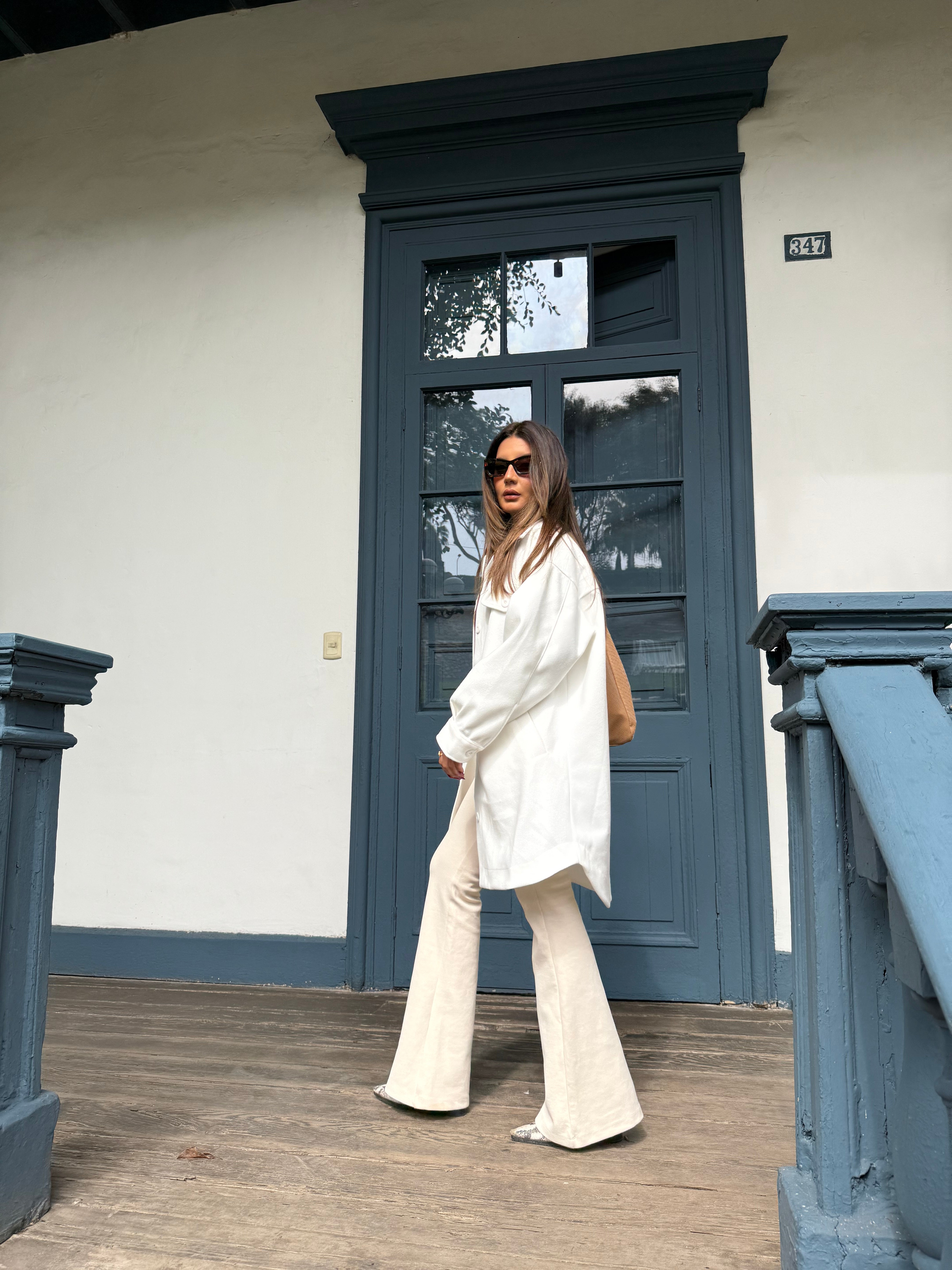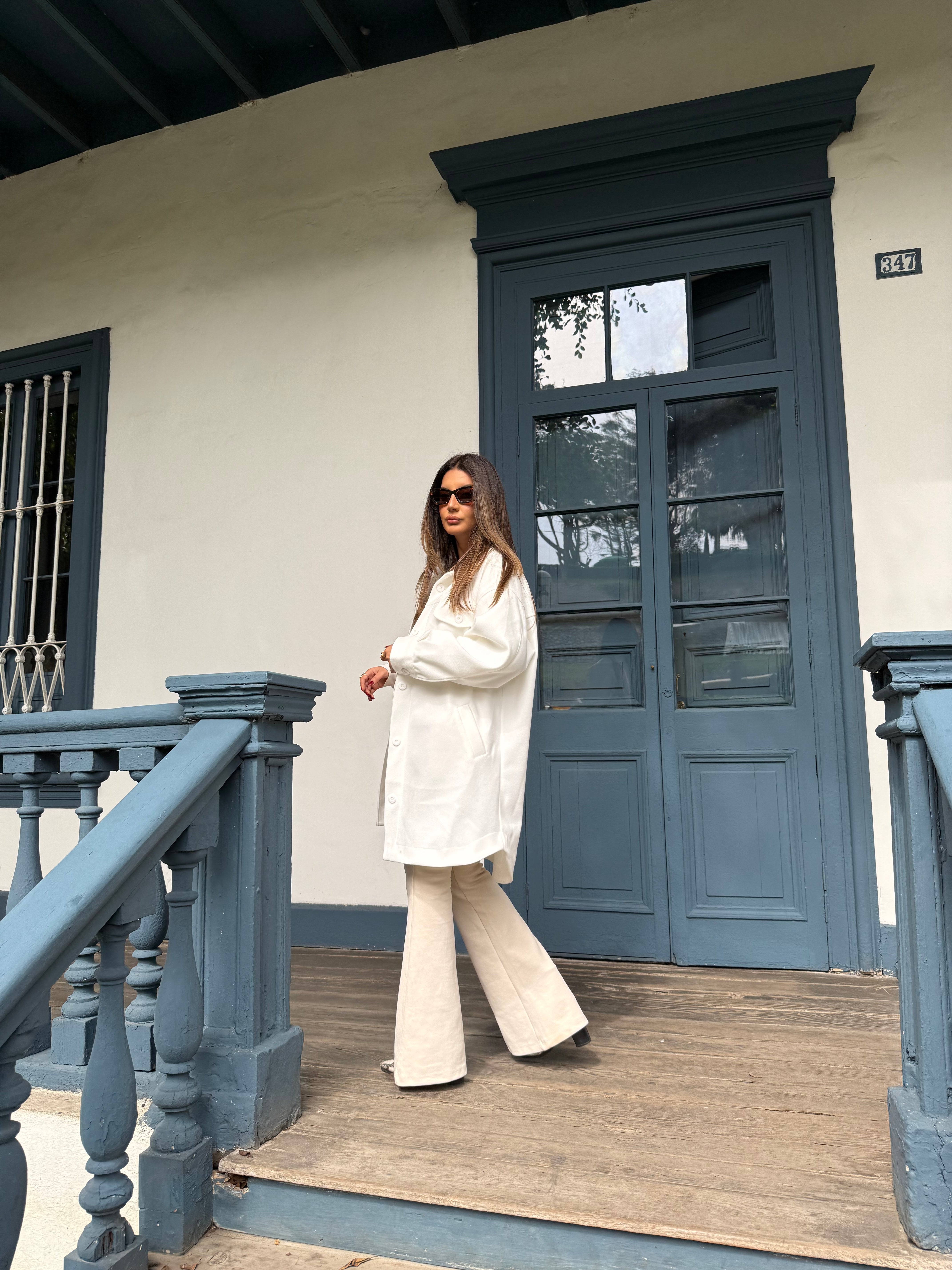 Nuestro saco Evony largo, con detalle de bolsillos en la parte delantera y color neutro —como blanco — será la opción perfecta para combinar con otras prendas. Recuerda que un saco de vestir sencillo es como un lienzo en blanco que te permite experimentar con otros elementos de tu atuendo.