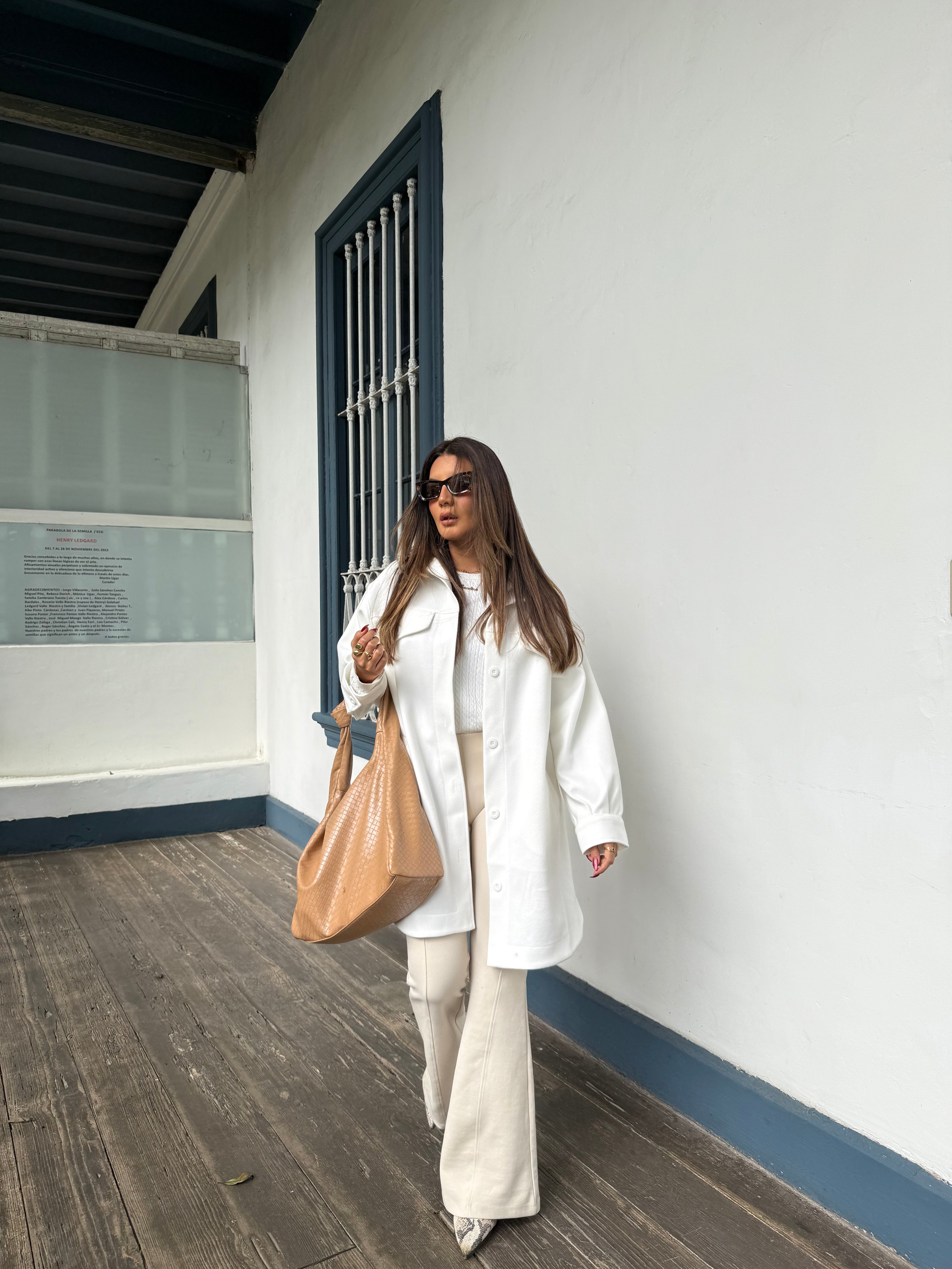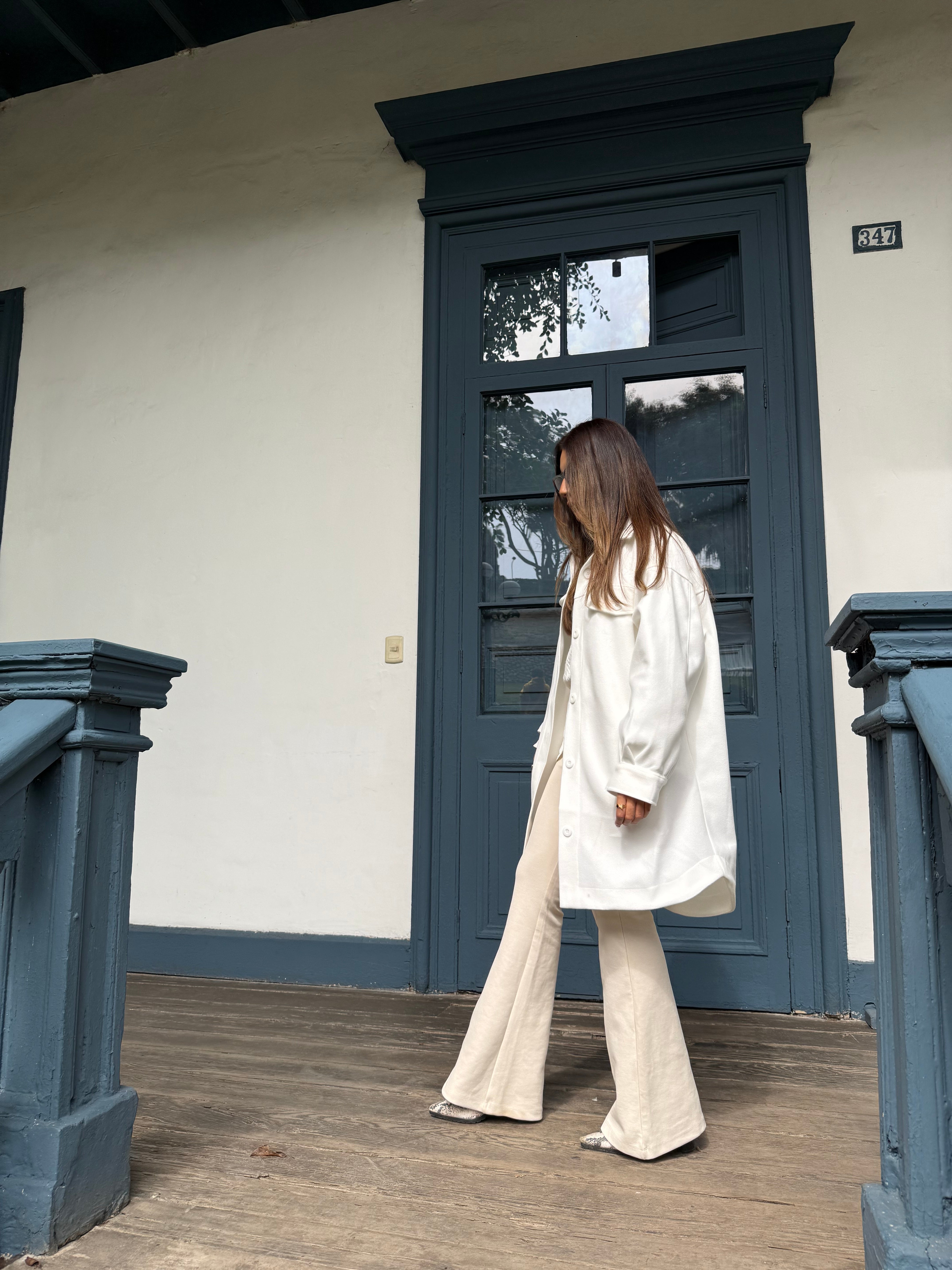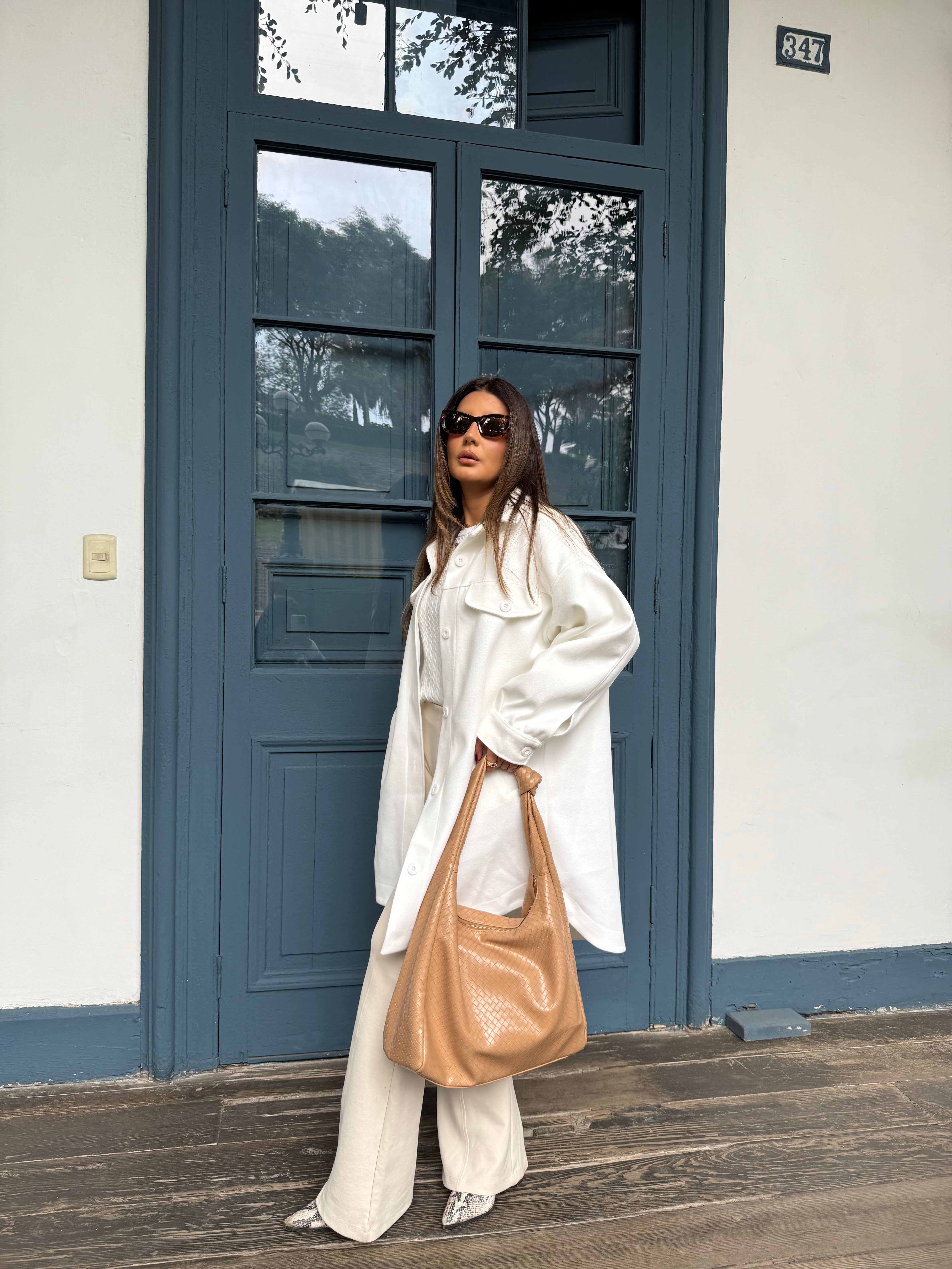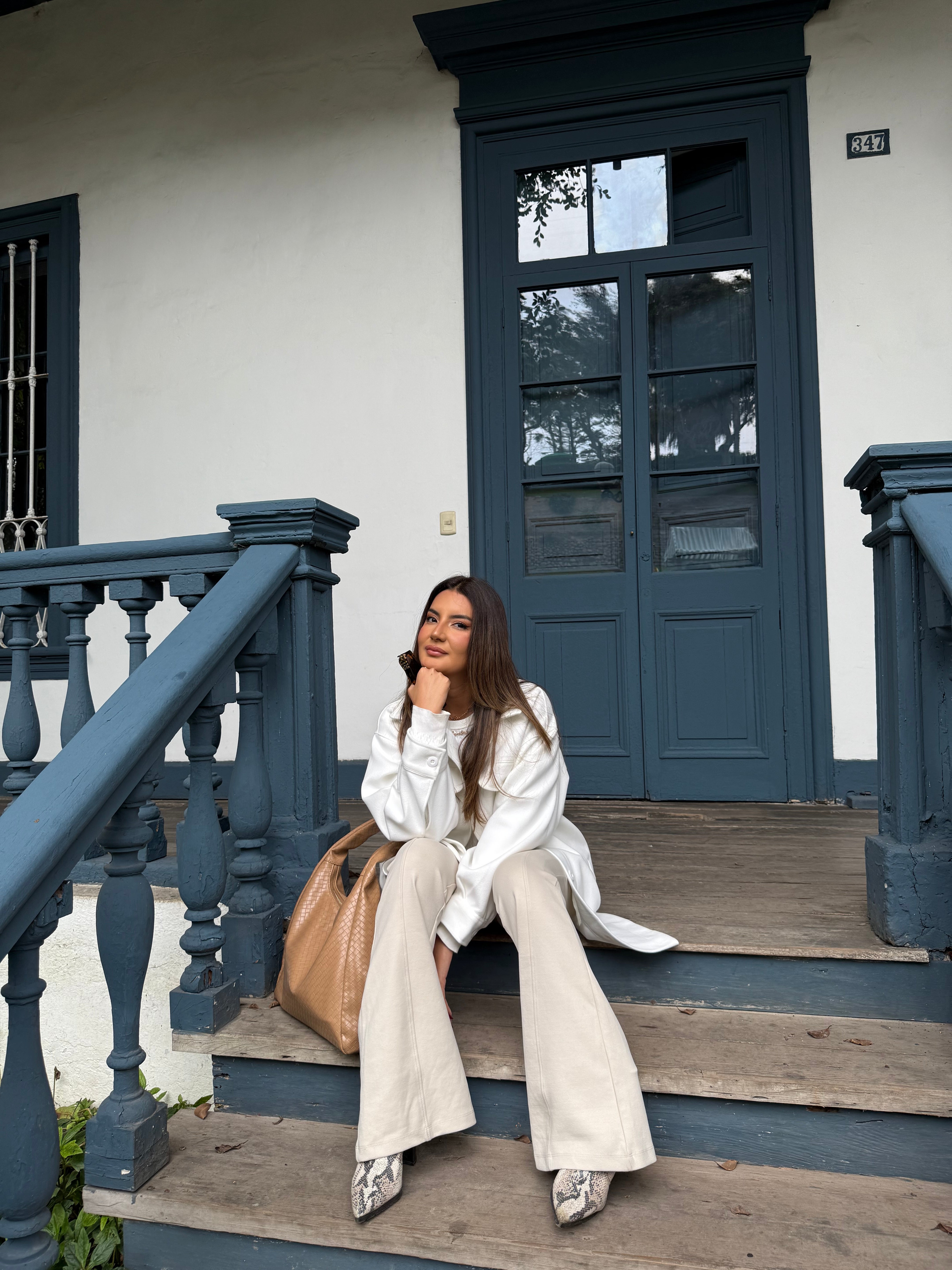 Nuestro saco Evony largo, con detalle de bolsillos en la parte delantera y color neutro —como blanco — será la opción perfecta para combinar con otras prendas. Recuerda que un saco de vestir sencillo es como un lienzo en blanco que te permite experimentar con otros elementos de tu atuendo.