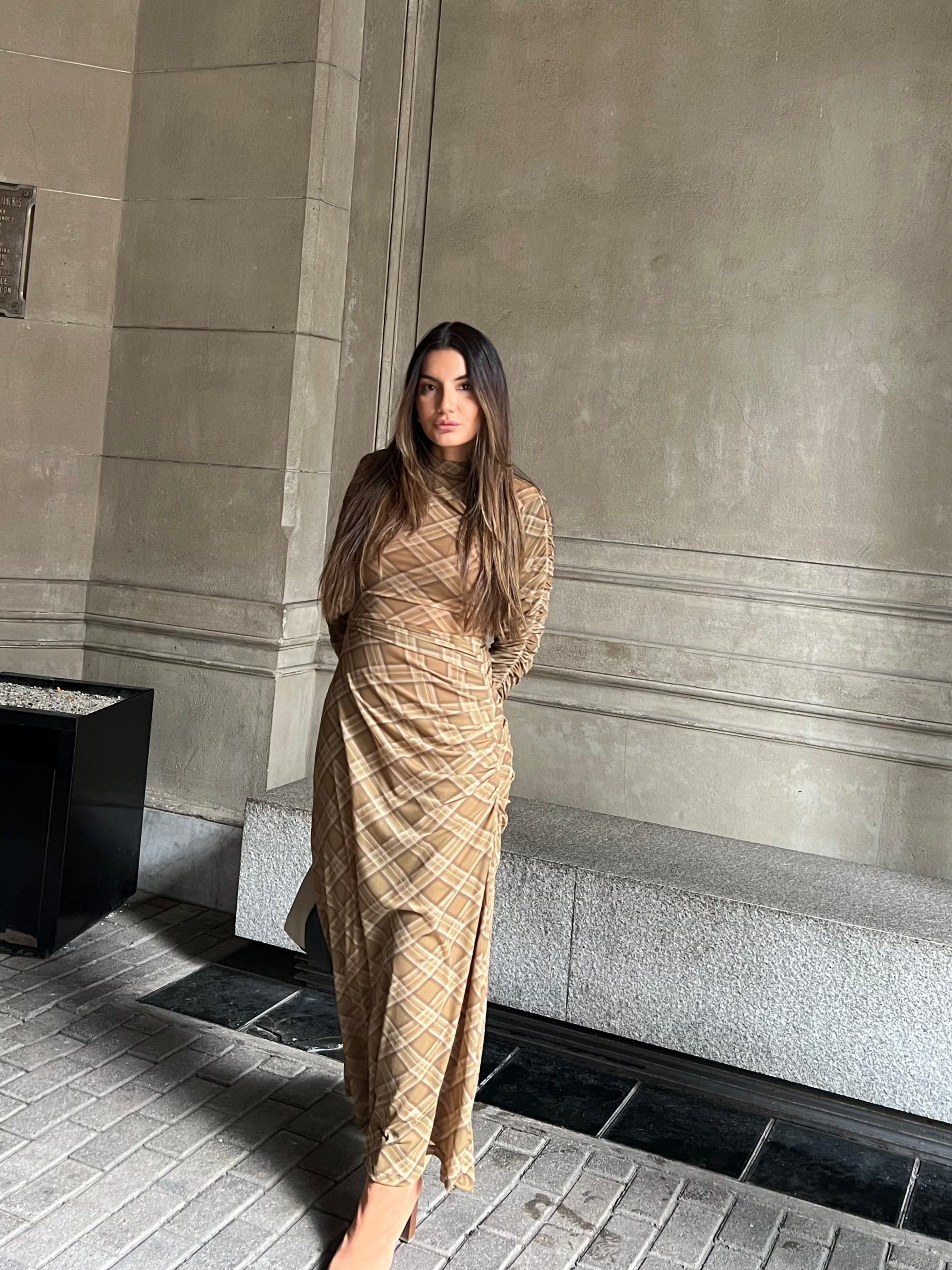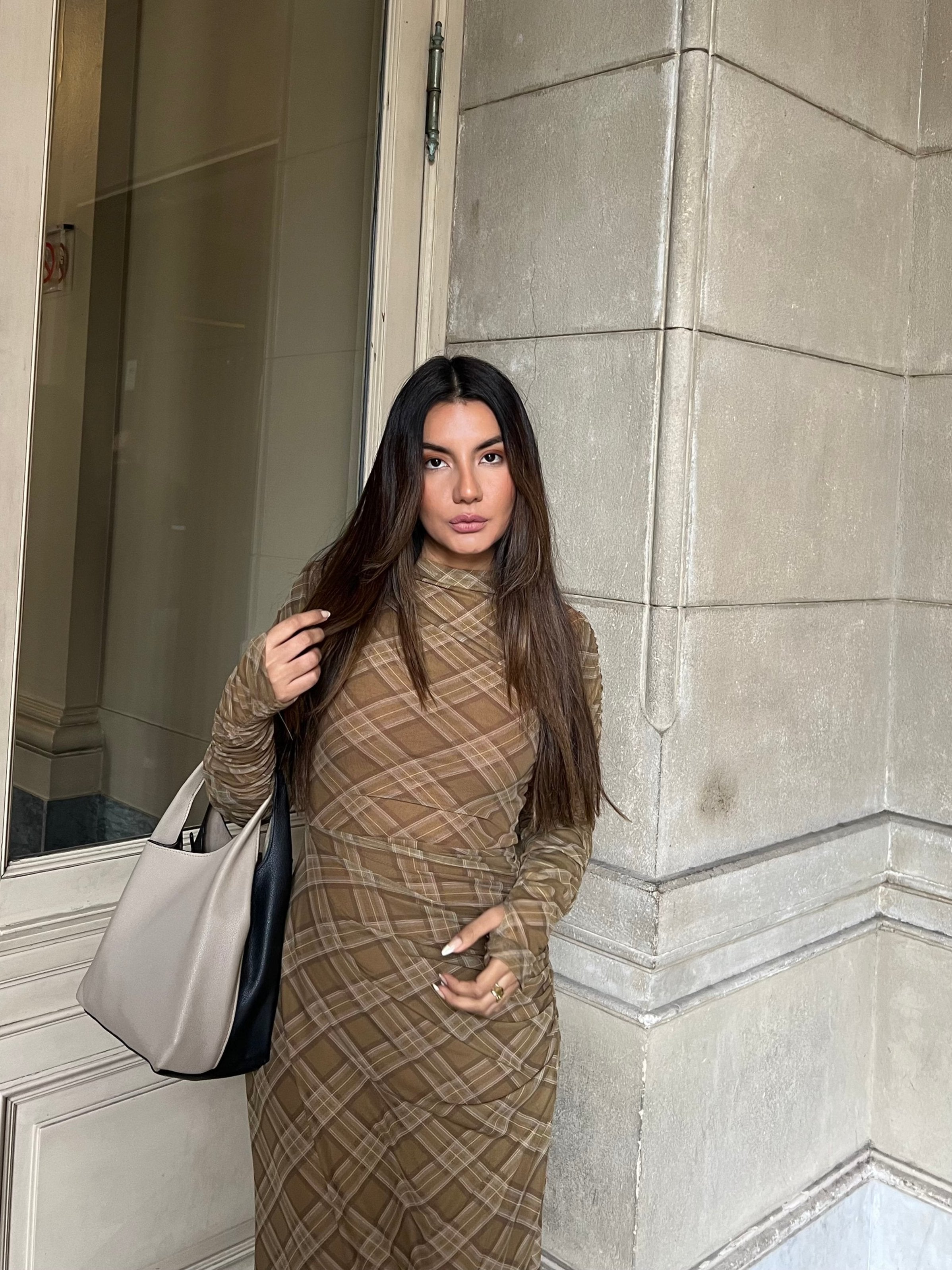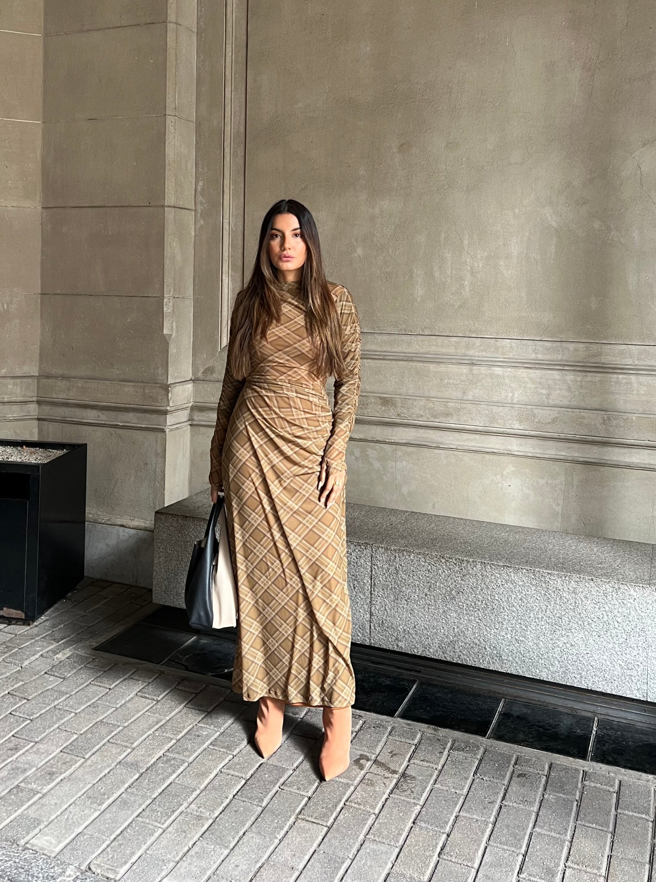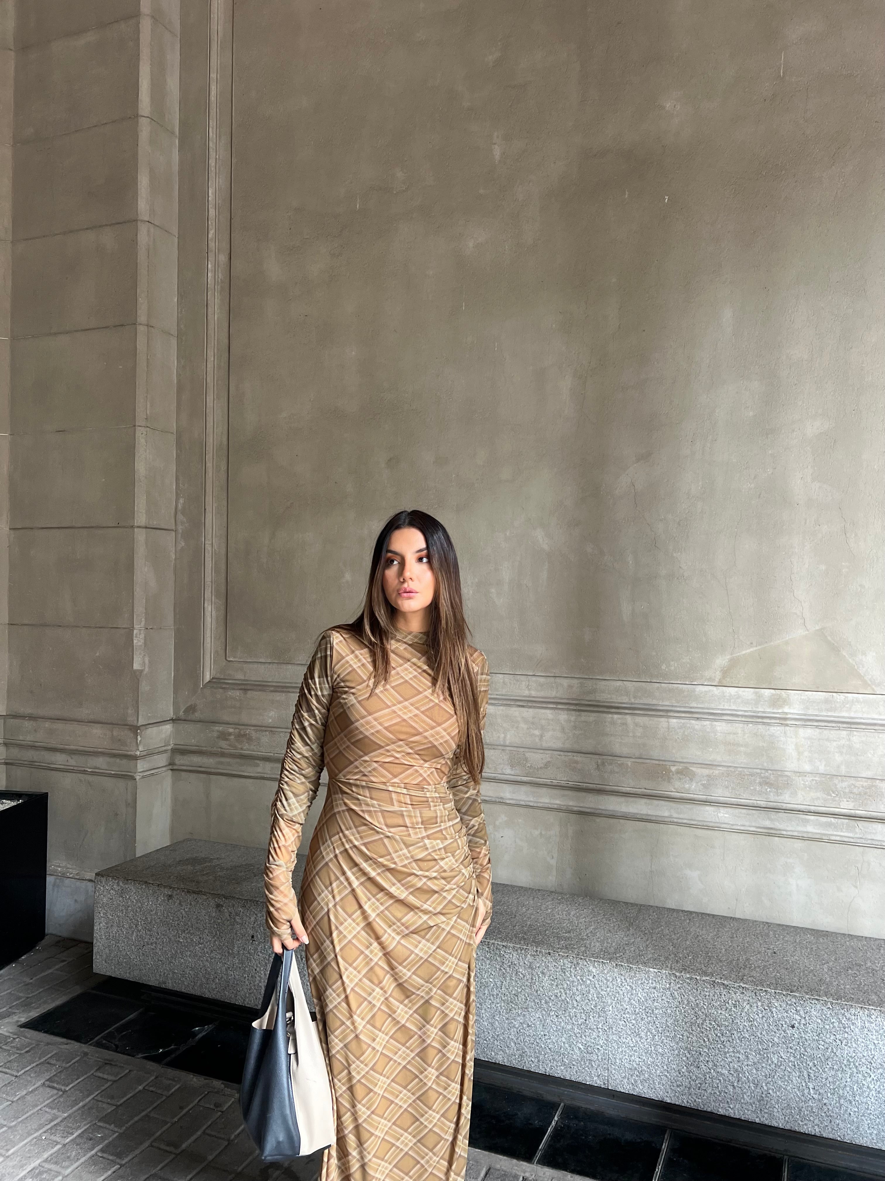 Vestido largo con mangas largas y detalle drapeado en la parte del cuello y caderas, elaborado de malla forrado en un color marrón perfecto para esta temporada.