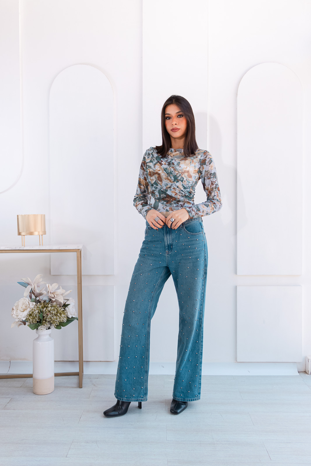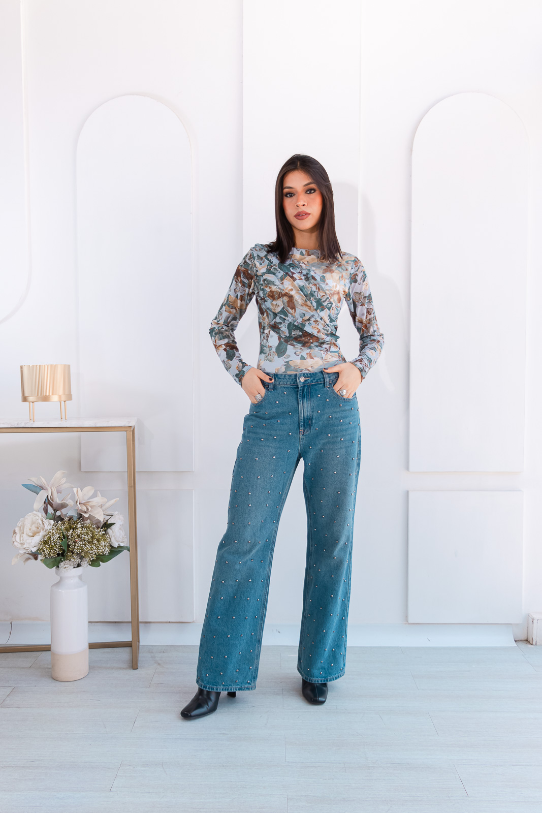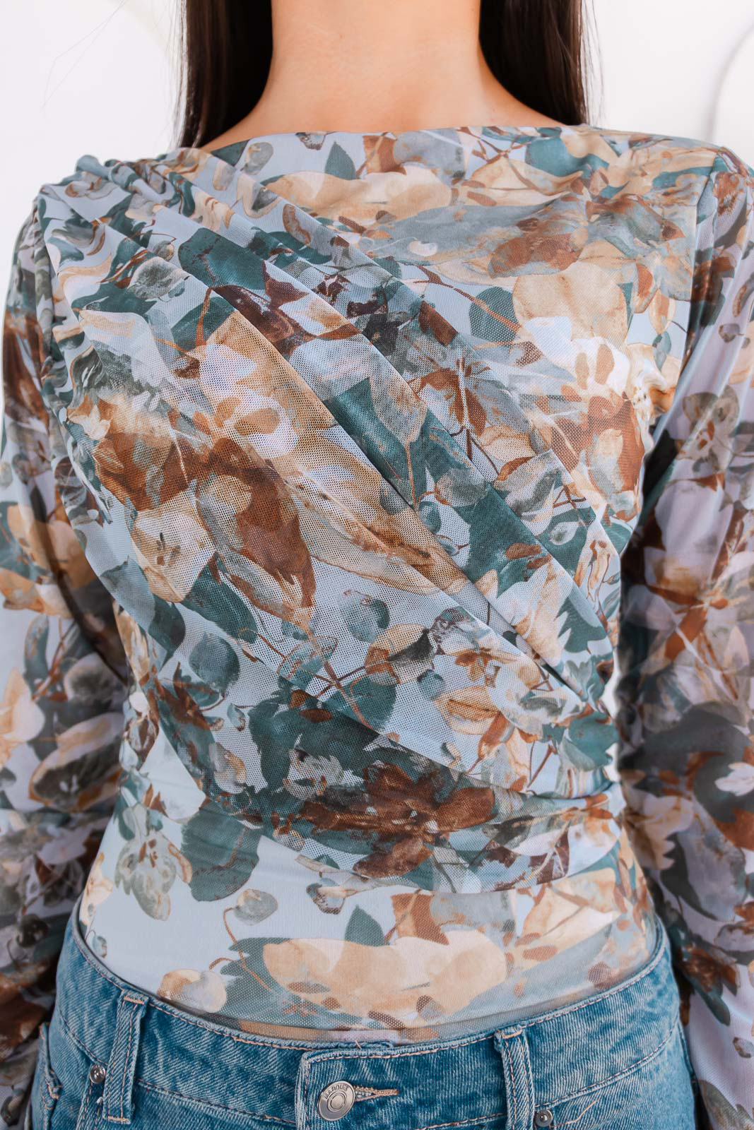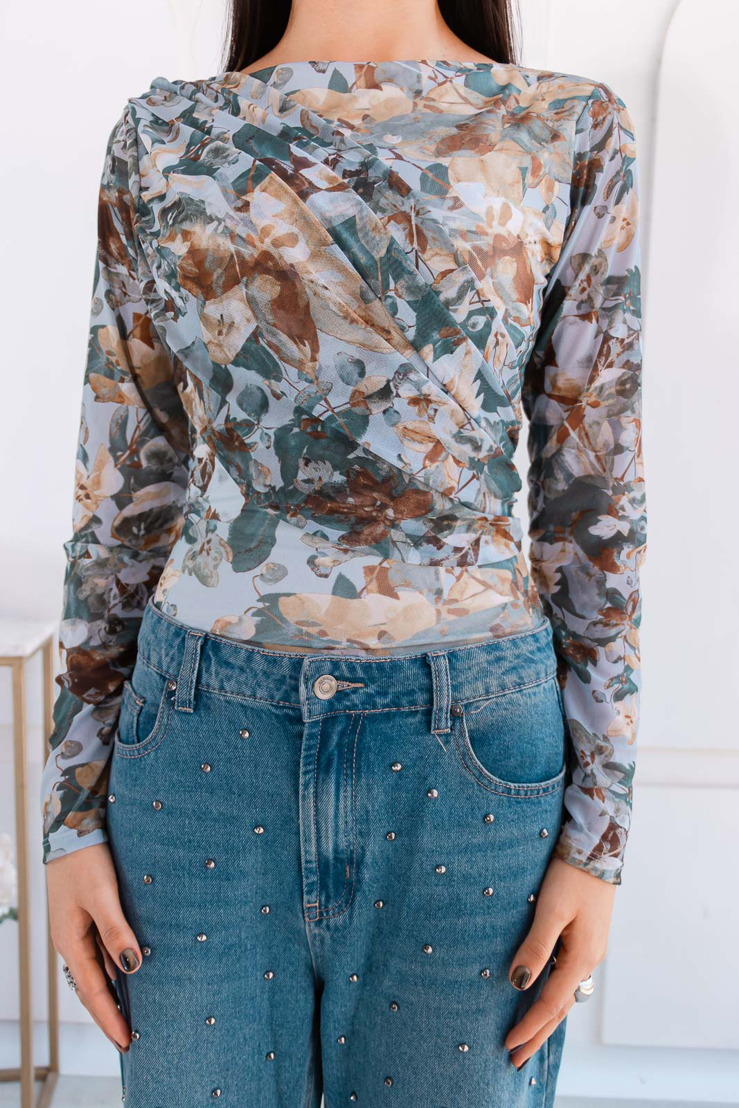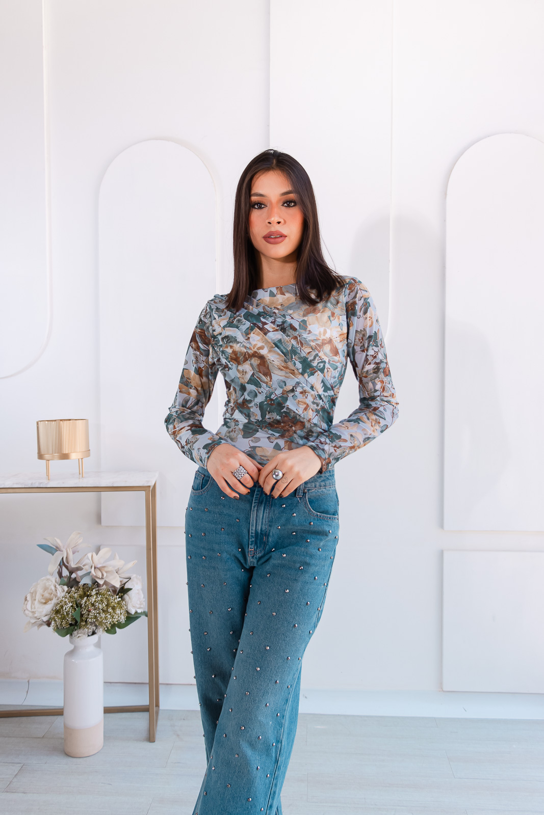 Beirut, una prenda que destaca por su diseño artístico y su versatilidad. Estampado en tonos tierra, verdes y toques de azul en un print tipo acuarela floral, perfecta para elevar cualquier look con un toque moderno y femenino.