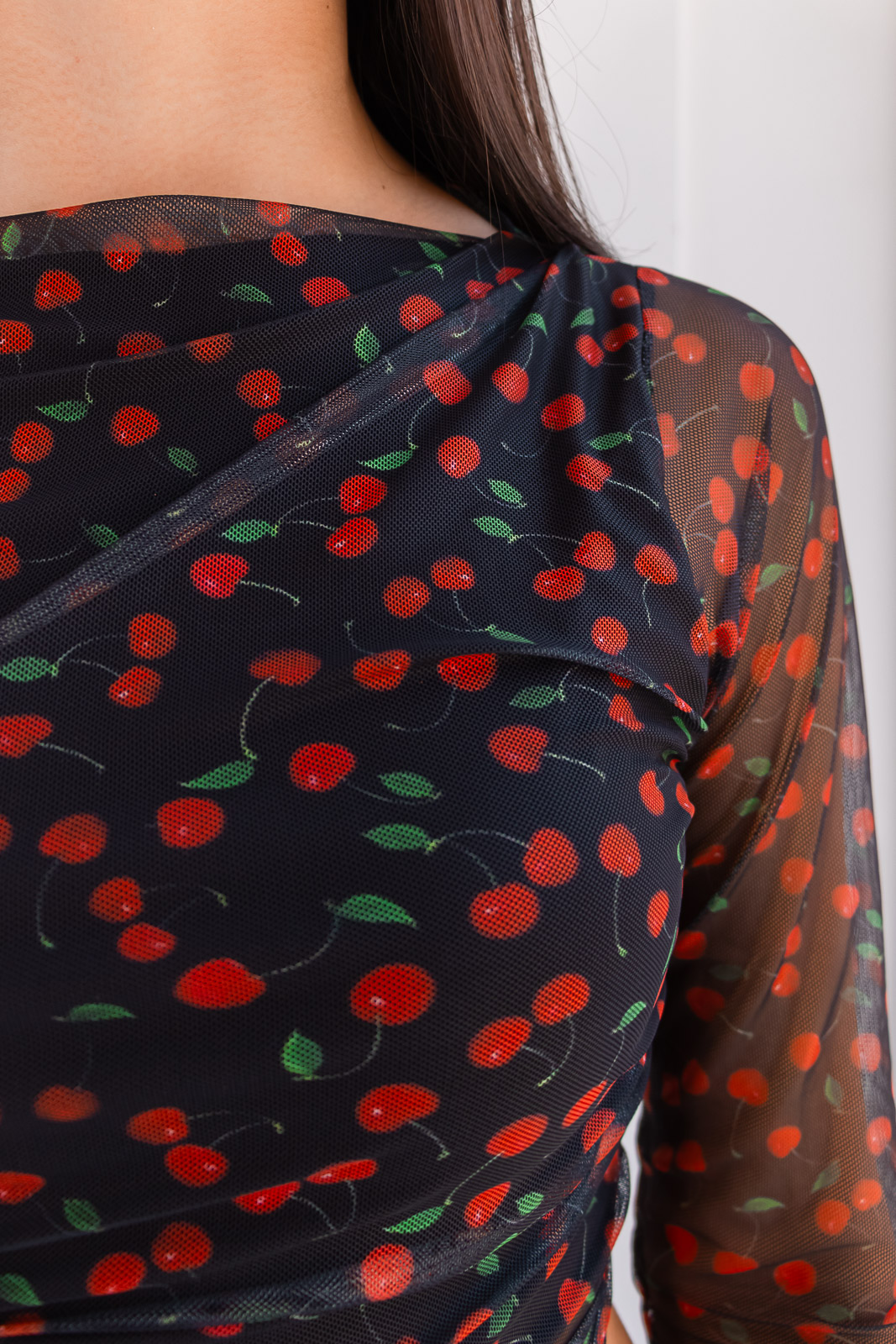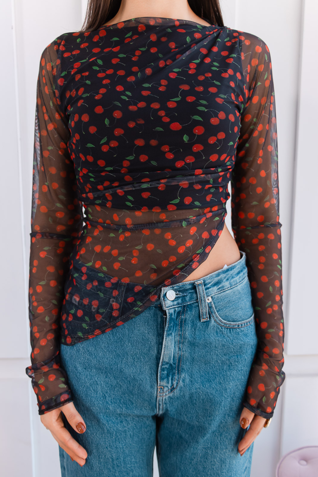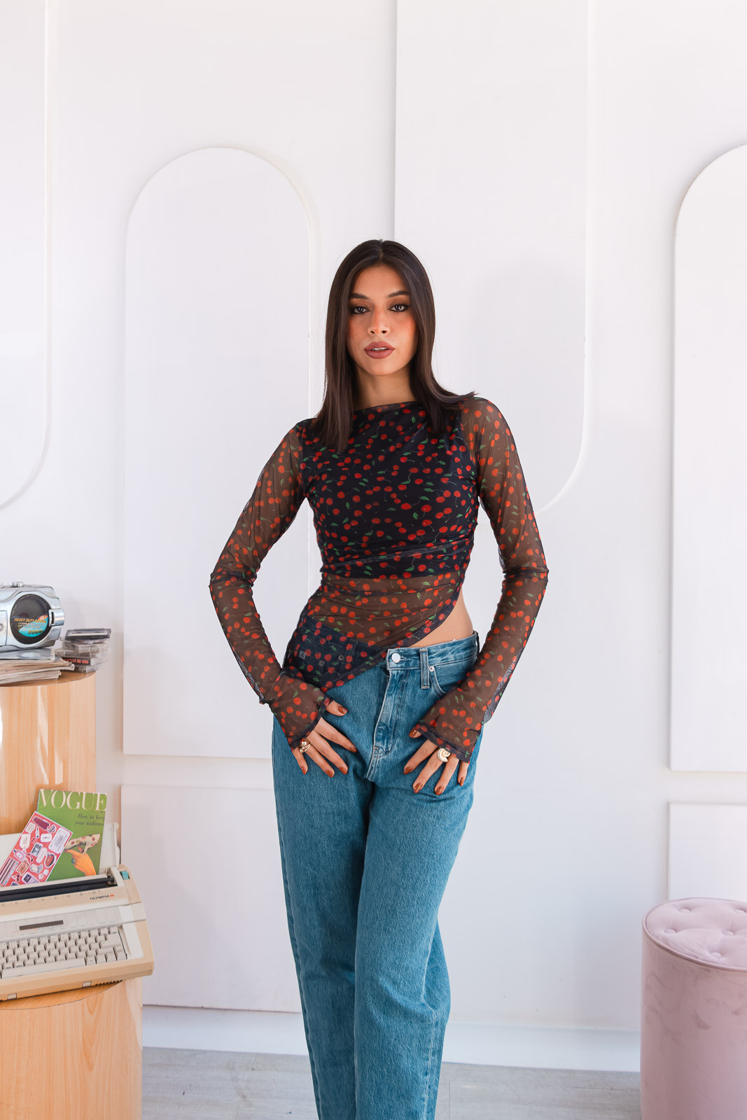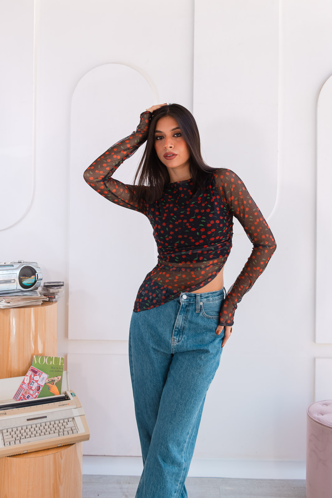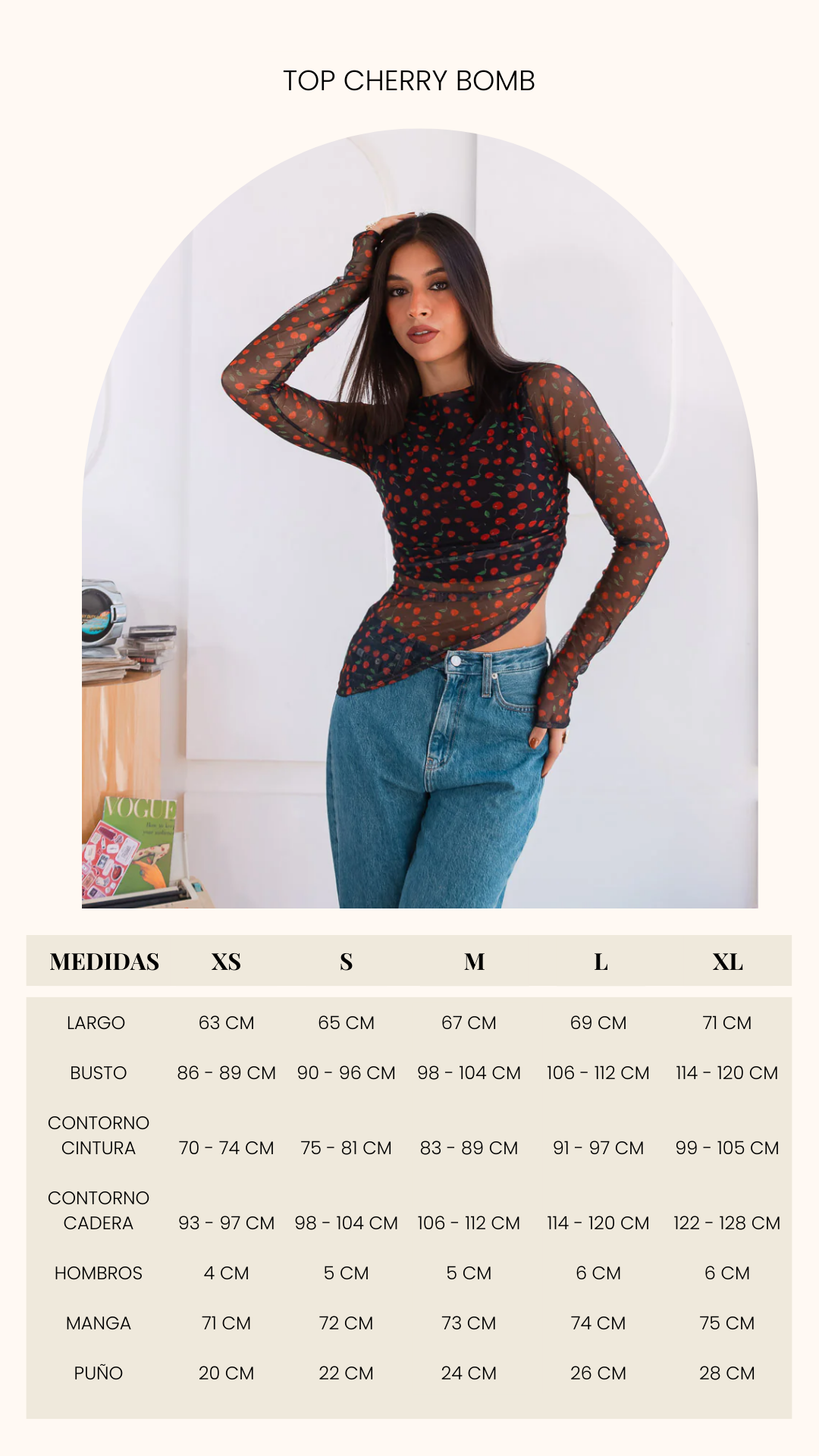 Cherry Bomb es una prenda que destaca por su estampado de cerezas y corte asimétrico. Su silueta ajustada y cuello redondo le da ese toque femenino y sensual, mientras que las mangas largas la convierten en una opción ideal para una noche con amigos o un evento formal, se adapta a cualquier ocasión y tipo de cuerpo.