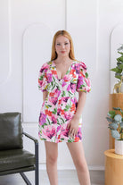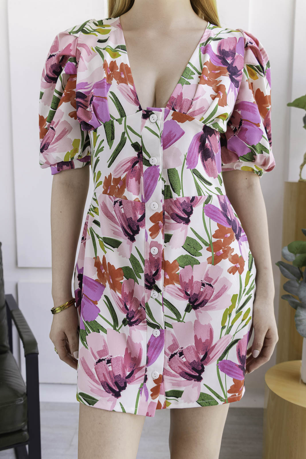 DISEÑO EXCLUSIVO y versátil. Vestido corto, mangas abullonadas, lleno de FULL DETALLES en la parte del busto (pliegues) y cintura. Escote profundo en V y botones en la parte delantera forrados del mismo material del vestido.