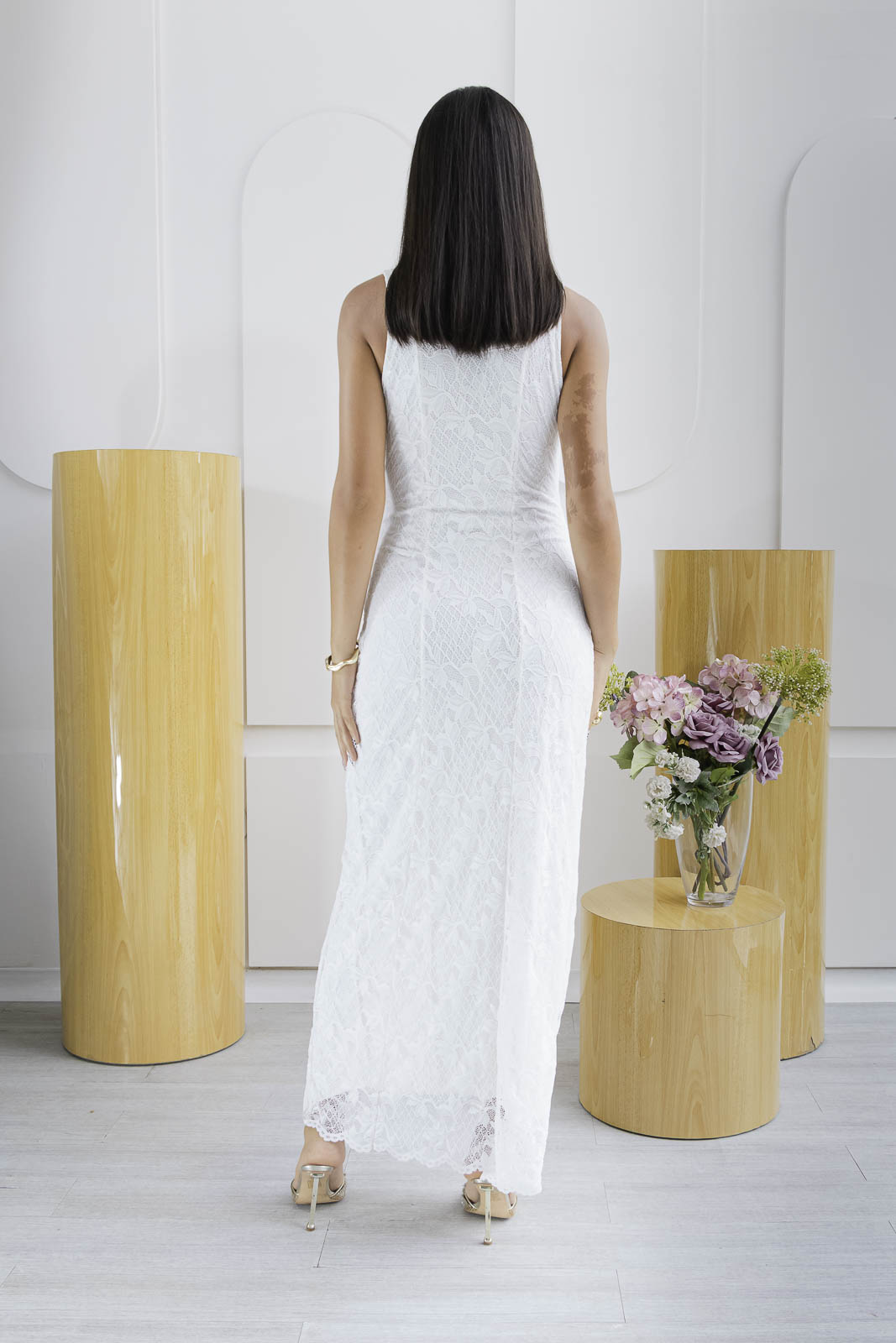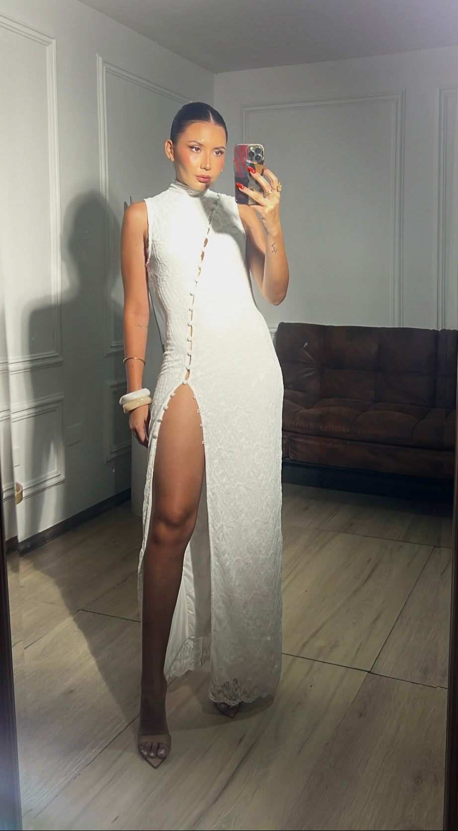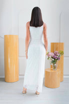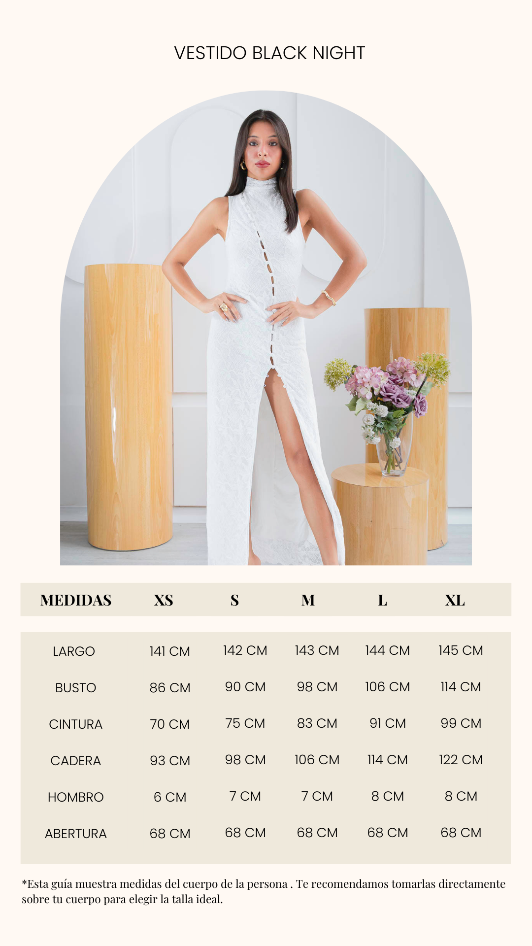 Sofisticado, seductor y atemporal. El vestido Black Night es ese diseño que habla por sí solo. Confeccionado en un tejido blanco semi translúcido, se adapta al cuerpo con sutileza y elegancia. Su diseño sin mangas, cuello alto y corte recto estiliza la silueta, mientras que la abertura lateral profunda en la pierna agrega el toque atrevido perfecto para destacar en cualquier ocasión.