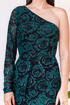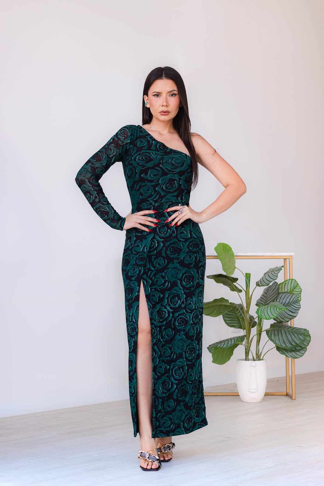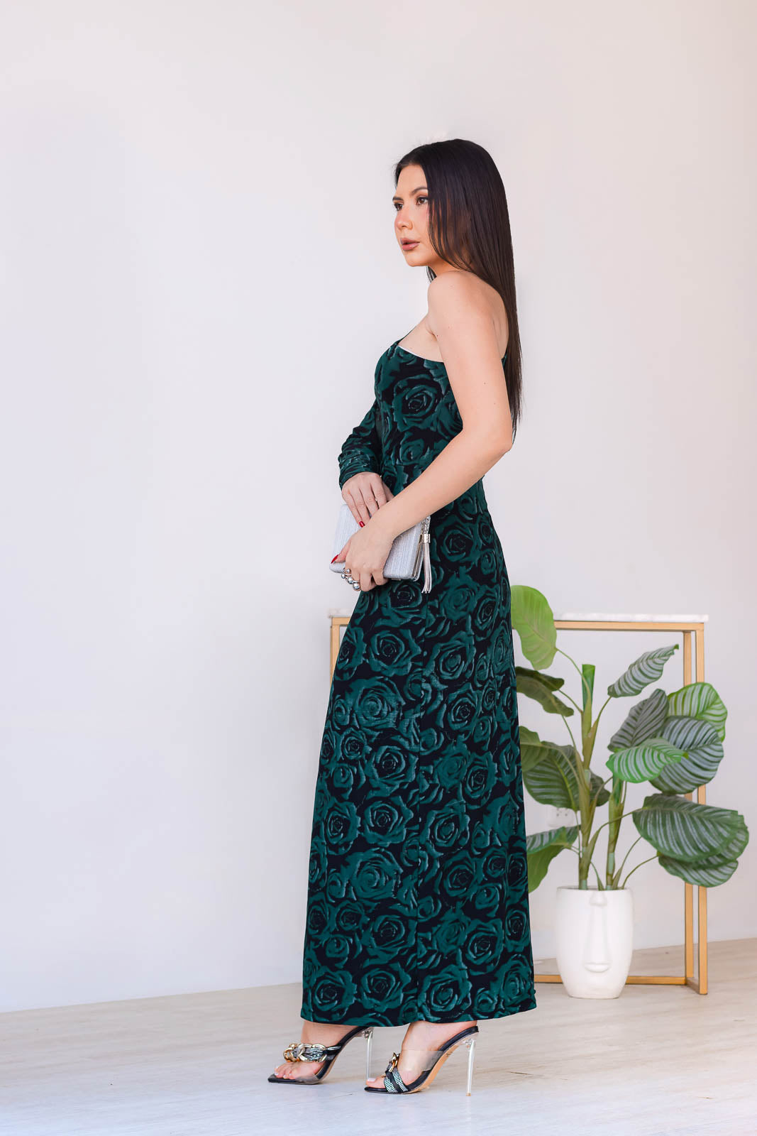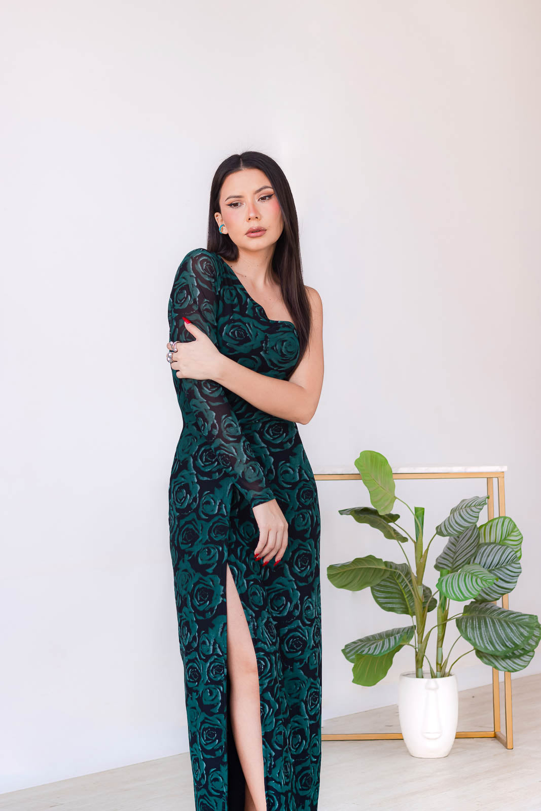 El estampado de rosas en tonos verde esmeralda simboliza la sofisticación y delicadeza. Su color clásico, atemporal y detalle asimétrico le da un toque femenino y sofisticado perfecto para eventos de noche, cócteles o cenas elegantes.