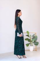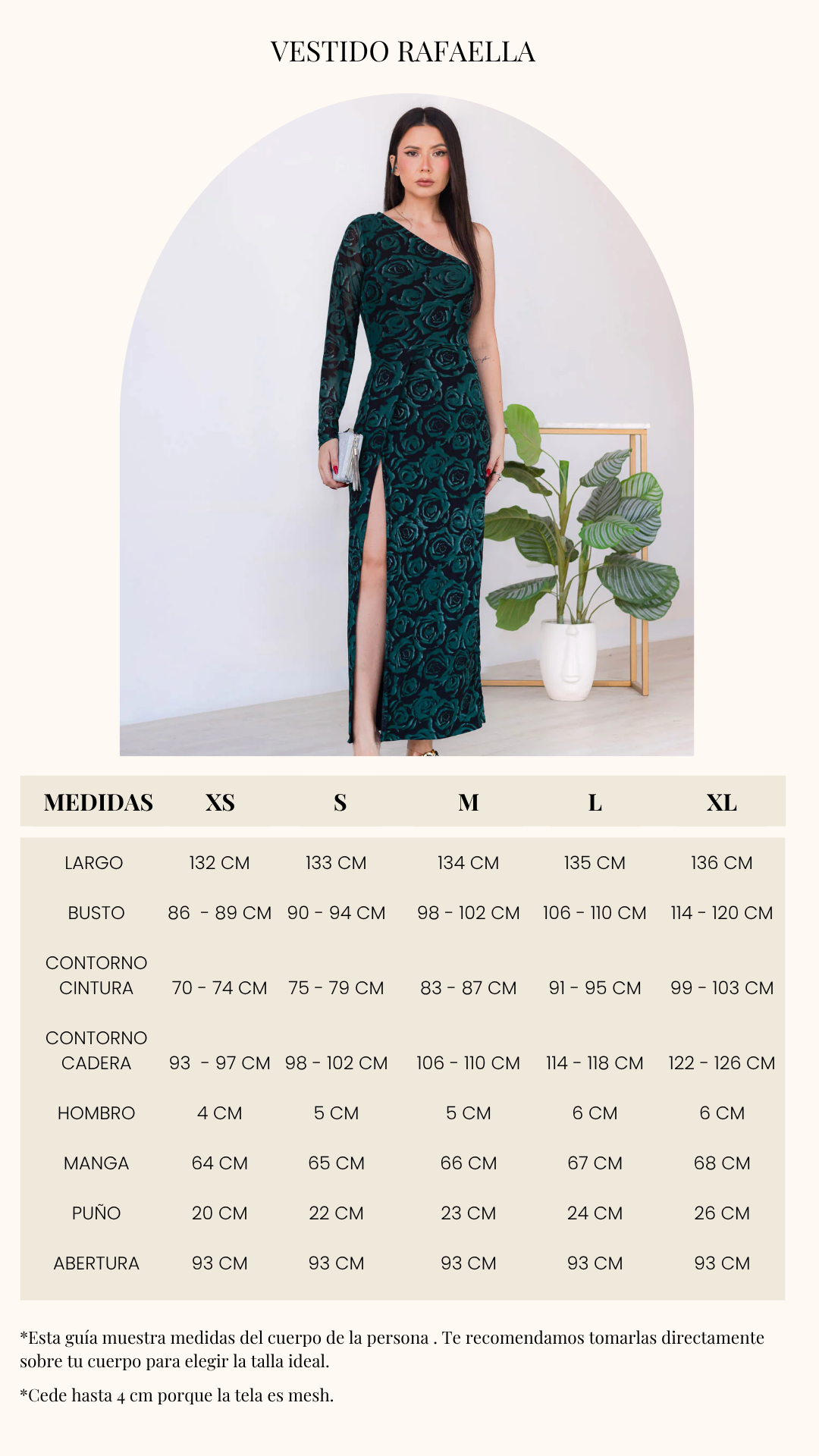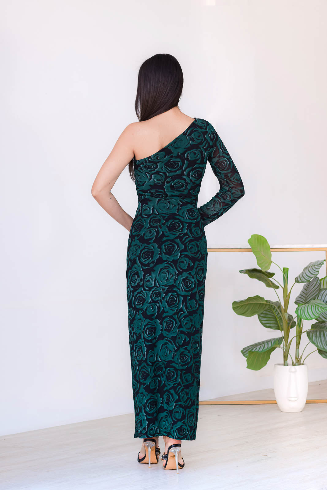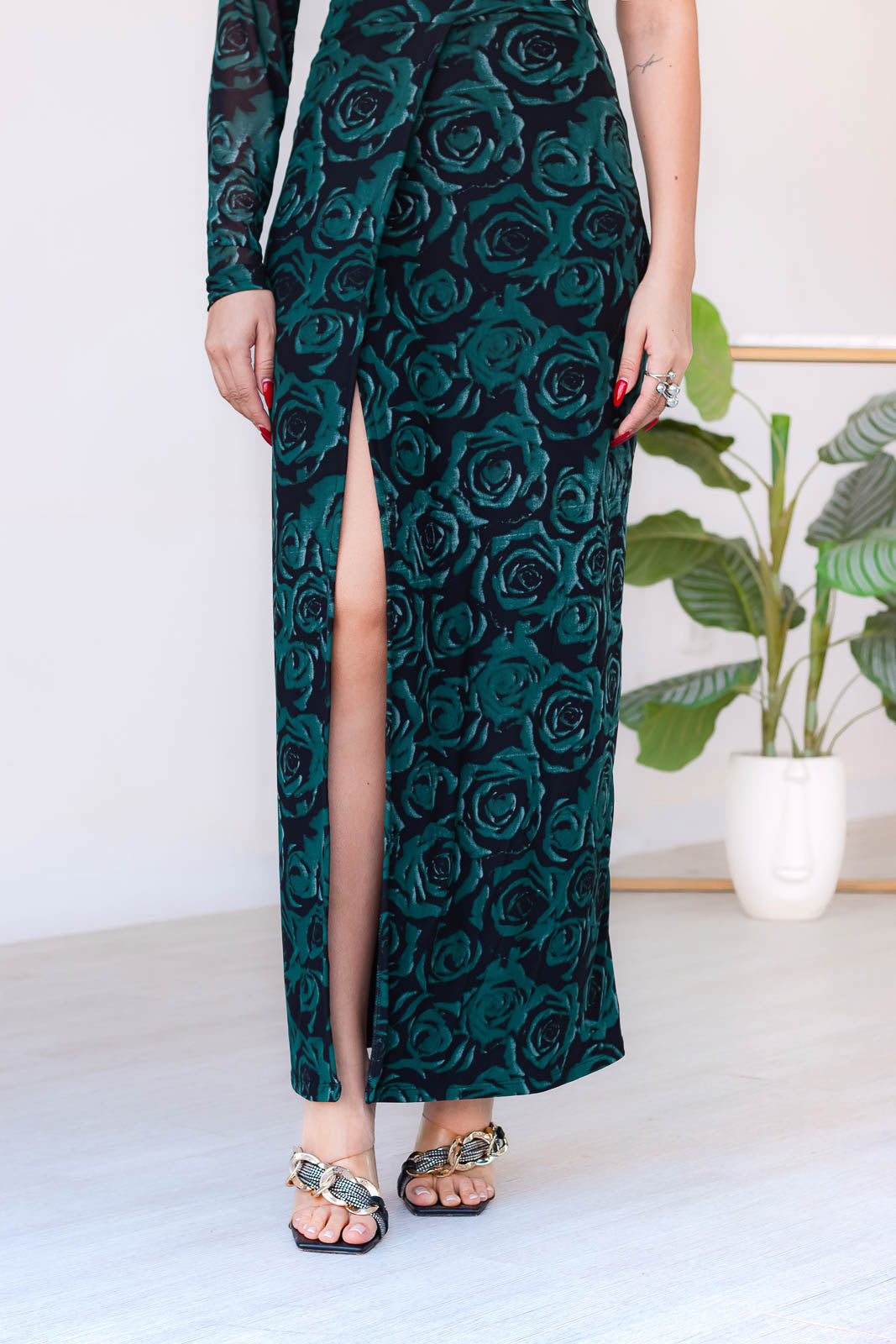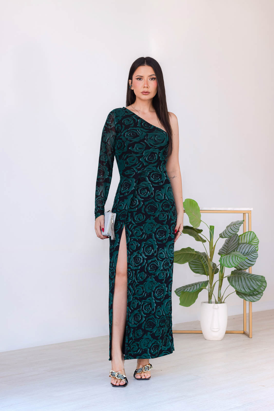 El estampado de rosas en tonos verde esmeralda simboliza la sofisticación y delicadeza. Su color clásico, atemporal y detalle asimétrico le da un toque femenino y sofisticado perfecto para eventos de noche, cócteles o cenas elegantes.