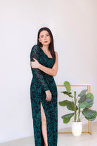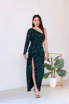 Un MUST en tu armario es este vestido largo, ceñido al cuerpo, con escote asimétrico, una manga larga resalta la silueta femenina con un aire de elegancia irresistible y abertura en la pierna.