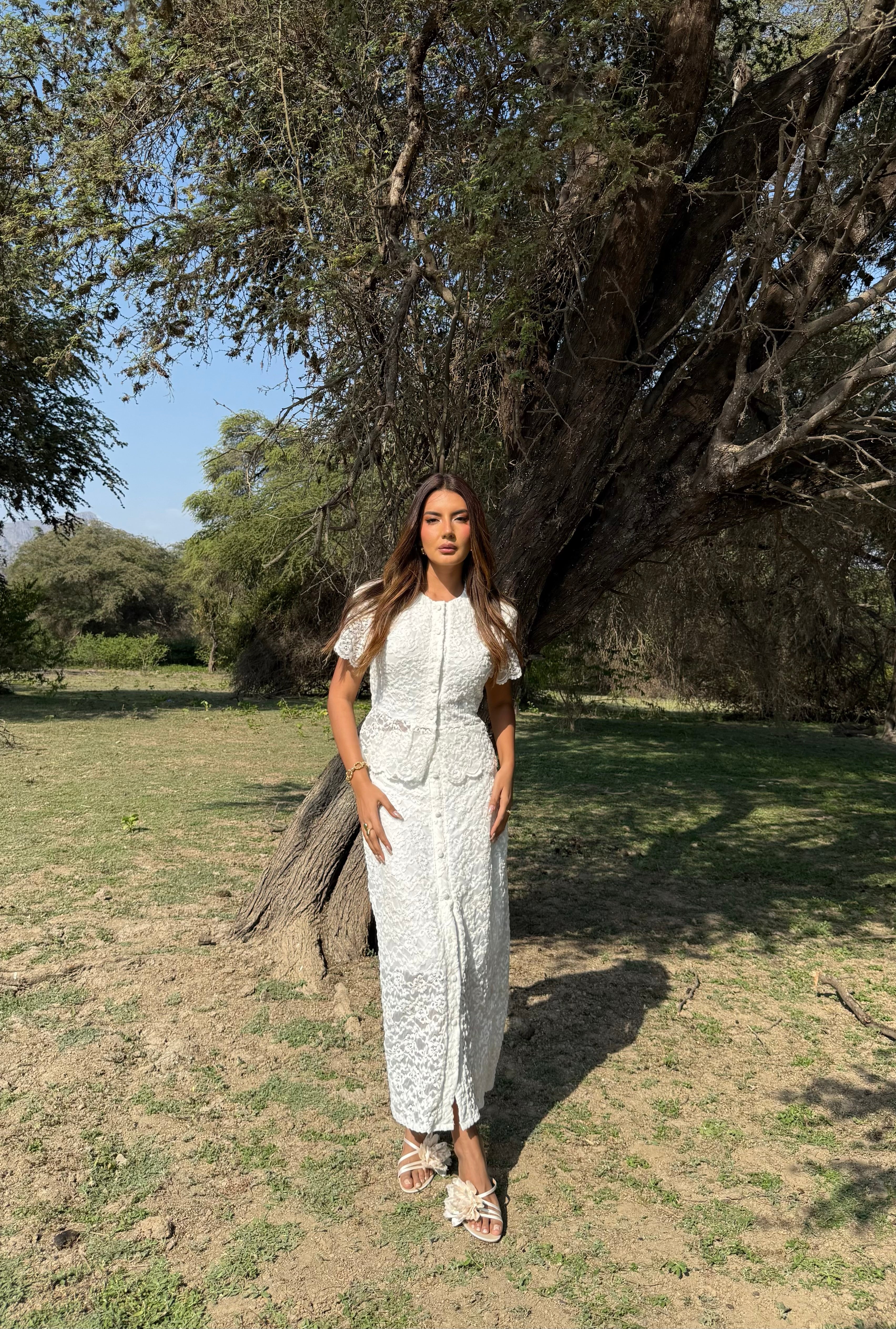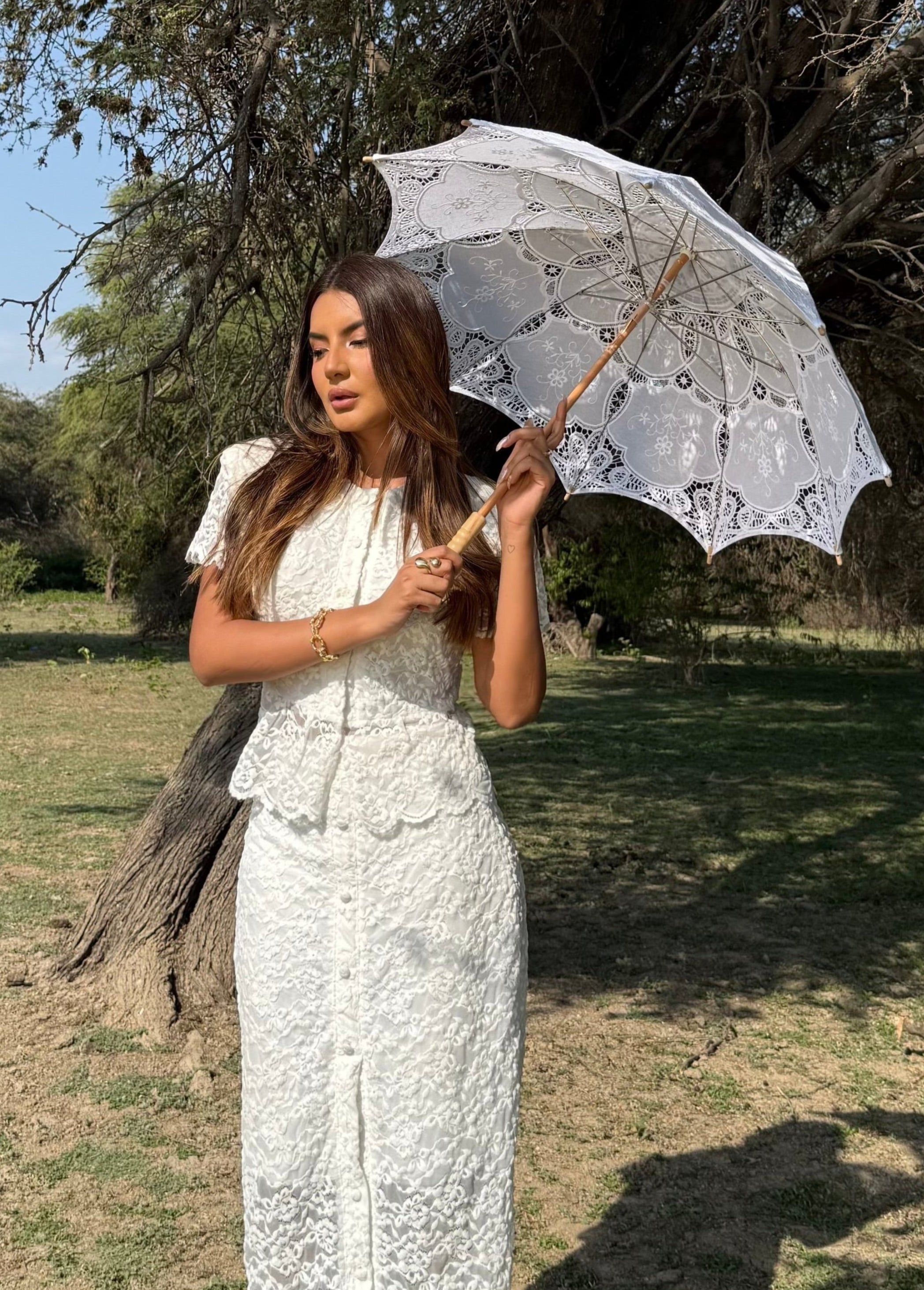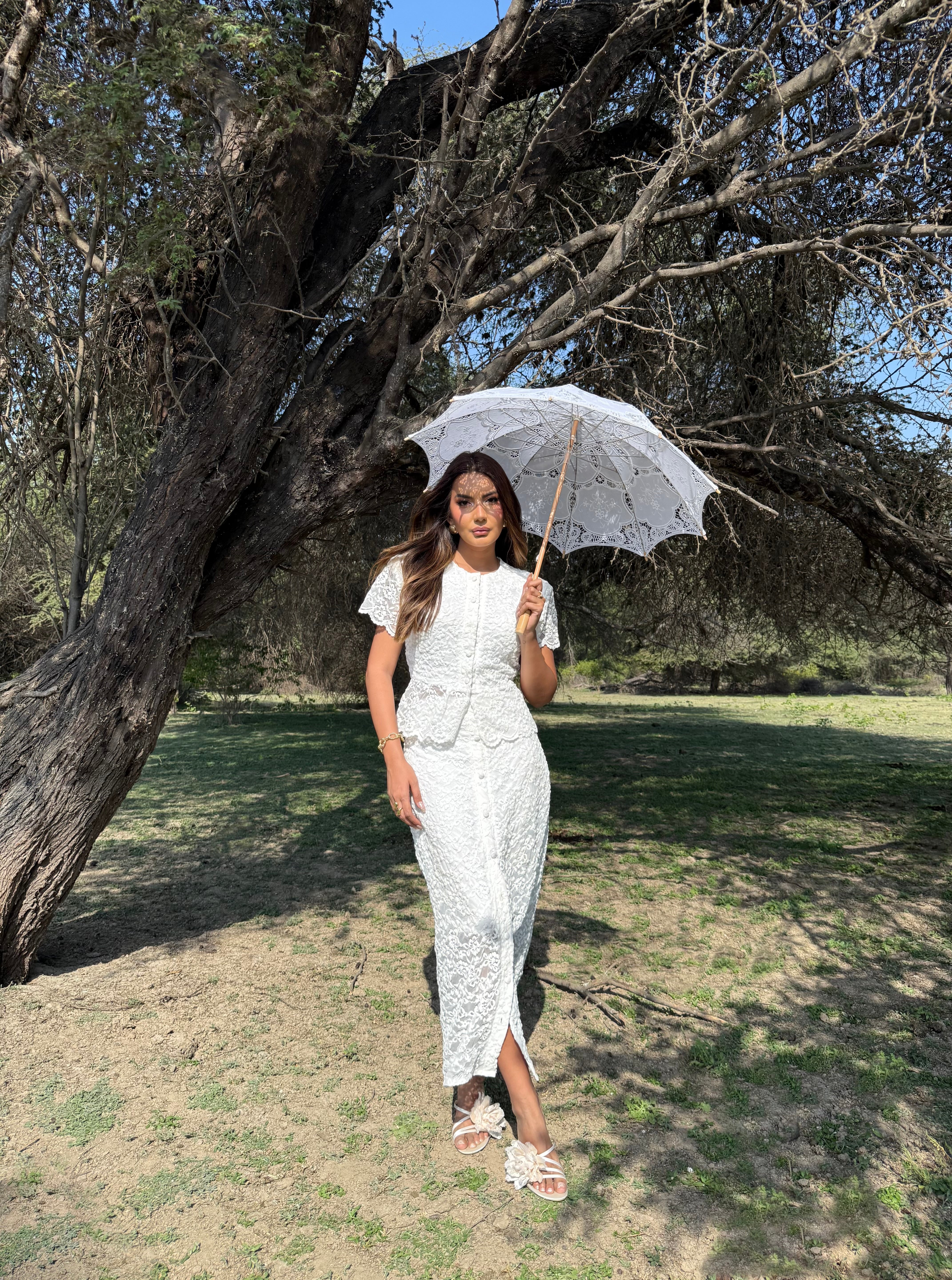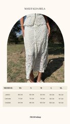 La falda midi, también en encaje, cuenta con un diseño semi-transparente en la parte inferior que aporta un toque sensual.